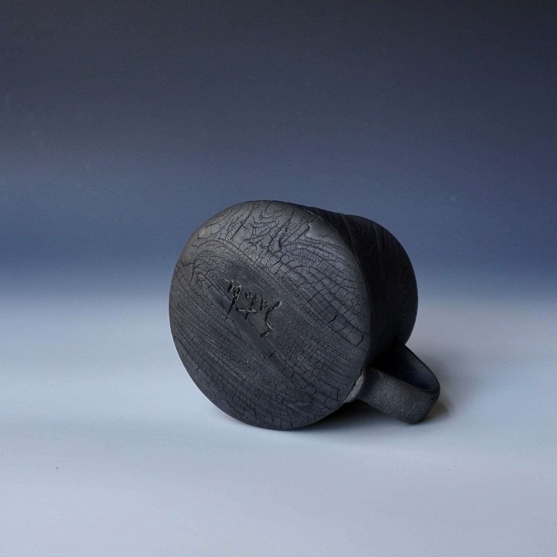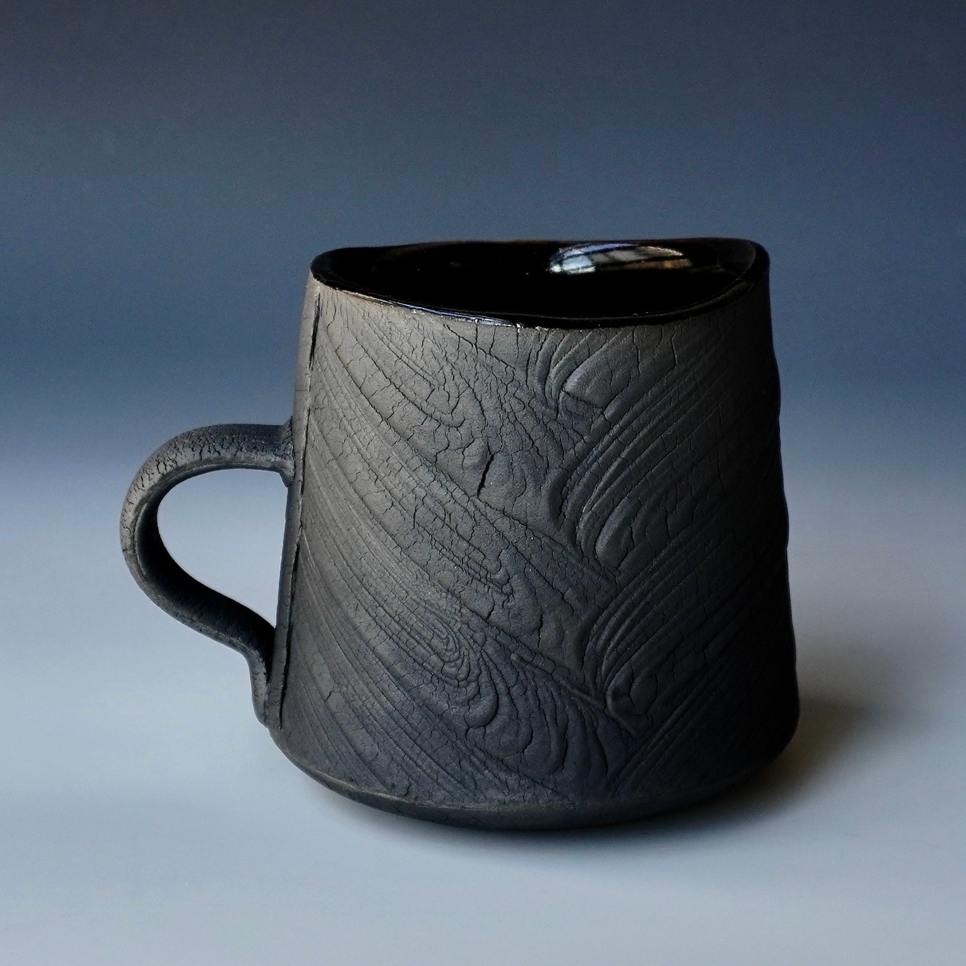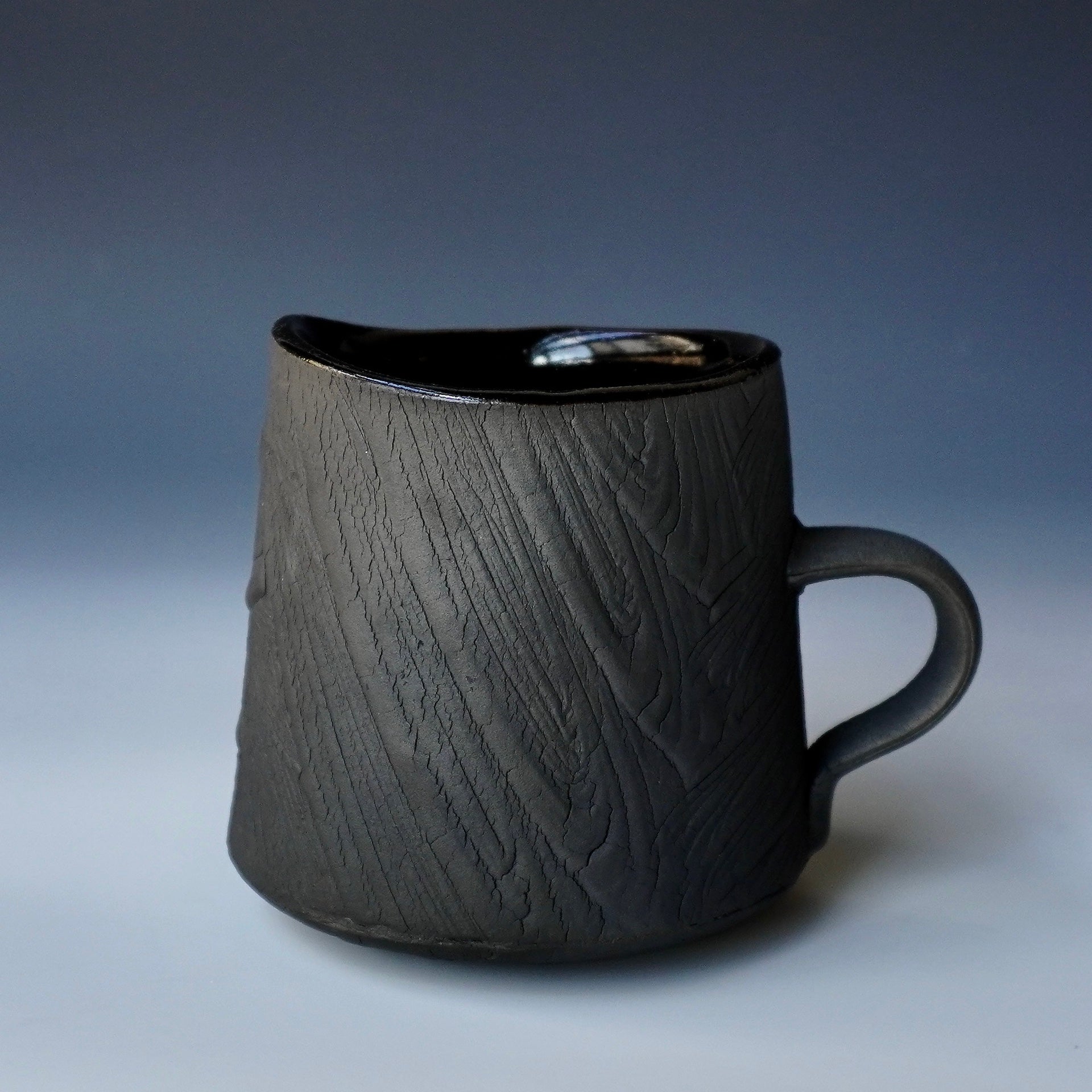 Mug cup - black kohiki, liner glaze : tenmokuThe piece is gas fired and then fired again in a sagger to create a black surface. 5 x 4 x 3.75h inchesholds 16 oz to the brim, 12.5oz comfortablyhandle for one fingerShipping and Policy(bk-1880)