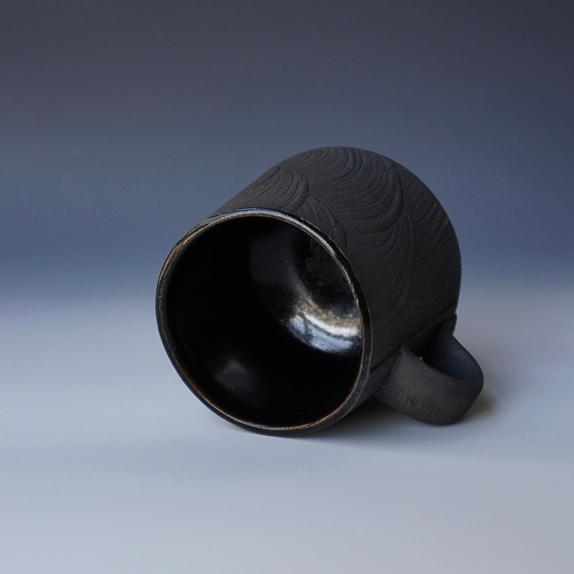 Mug cup - black kohiki, liner glaze : tenmokuThe piece is gas fired and then fired again in a sagger to create a black surface. 5 x 4 x 3.75h inchesholds 16 oz to the brim, 12.5oz comfortablyhandle for one fingerShipping and Policy(bk-1882)