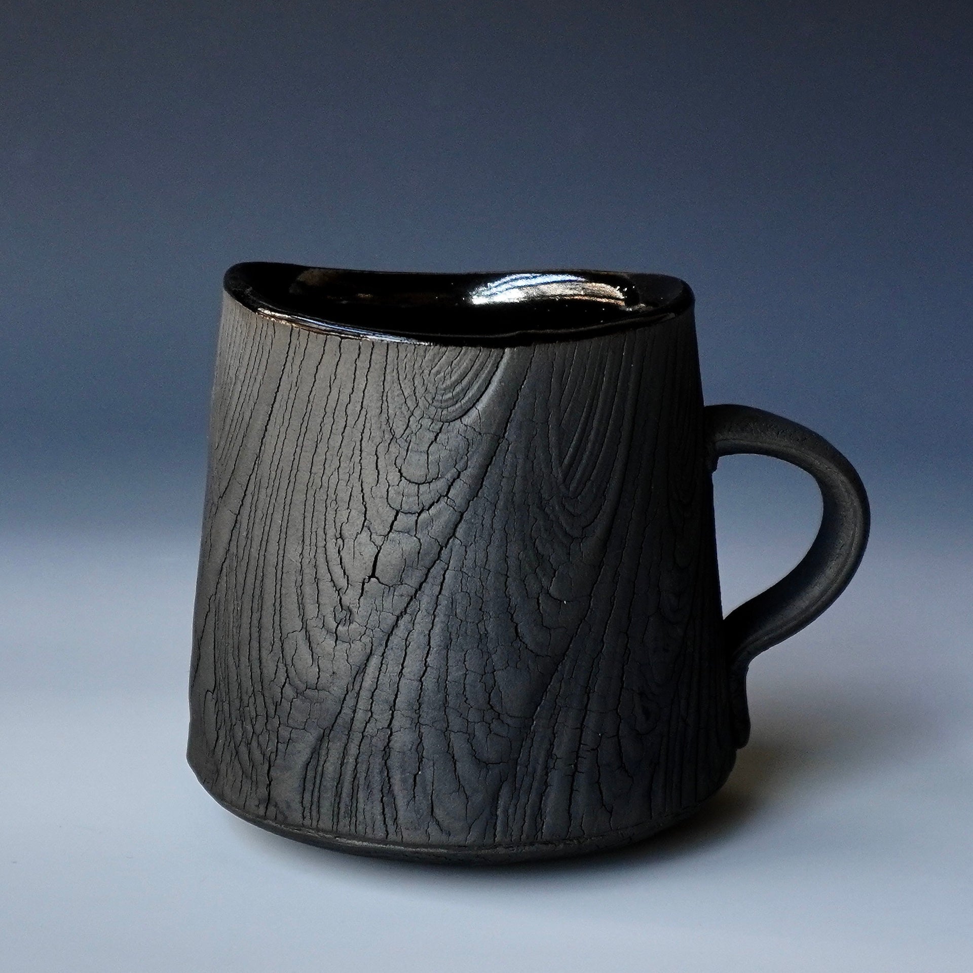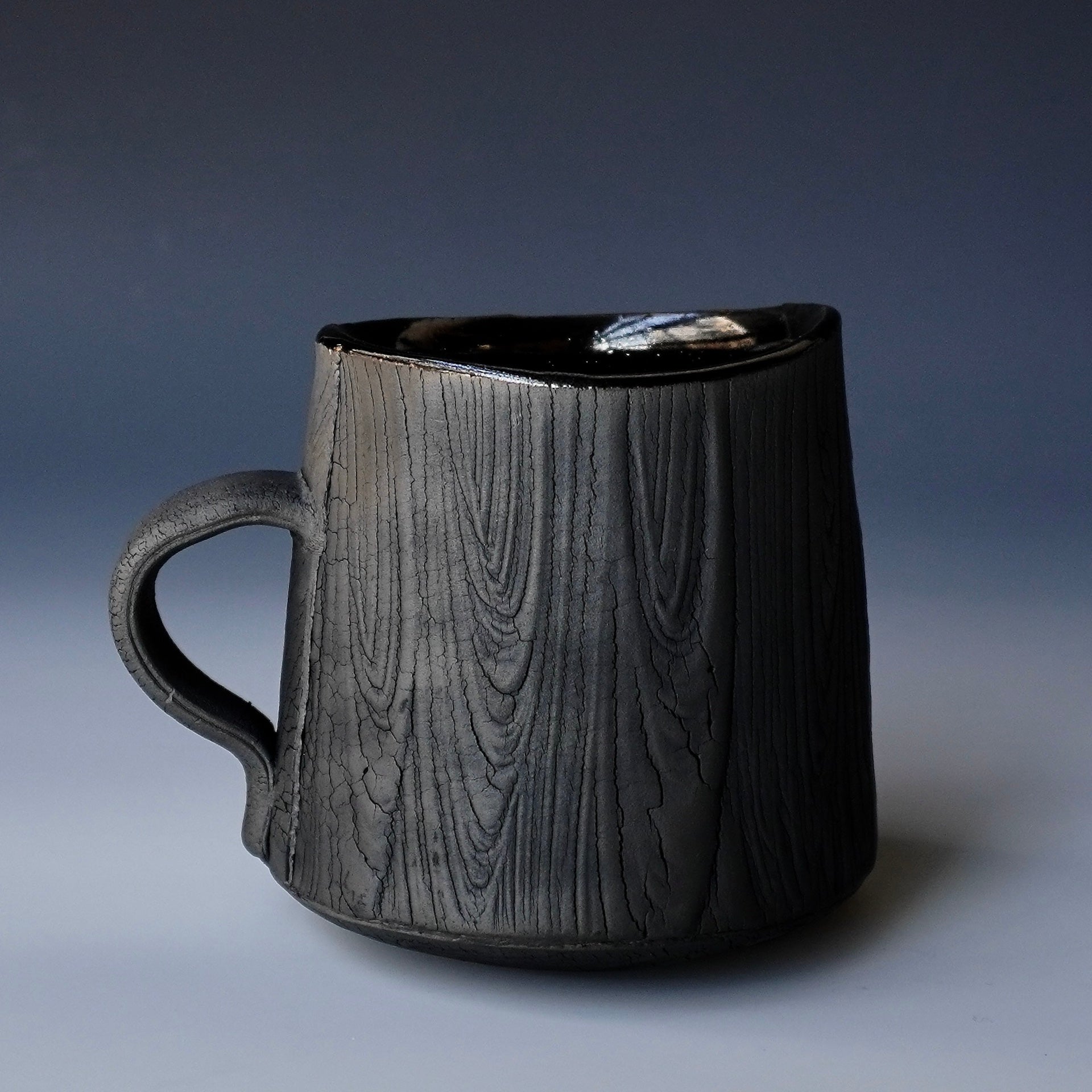Mug cup - black kohiki, liner glaze : tenmokuThe piece is gas fired and then fired again in a sagger to create a black surface. 5 x 4 x 3.75h inchesholds 16 oz to the brim, 12.5oz comfortablyhandle for one fingerShipping and Policy(bk-1883)