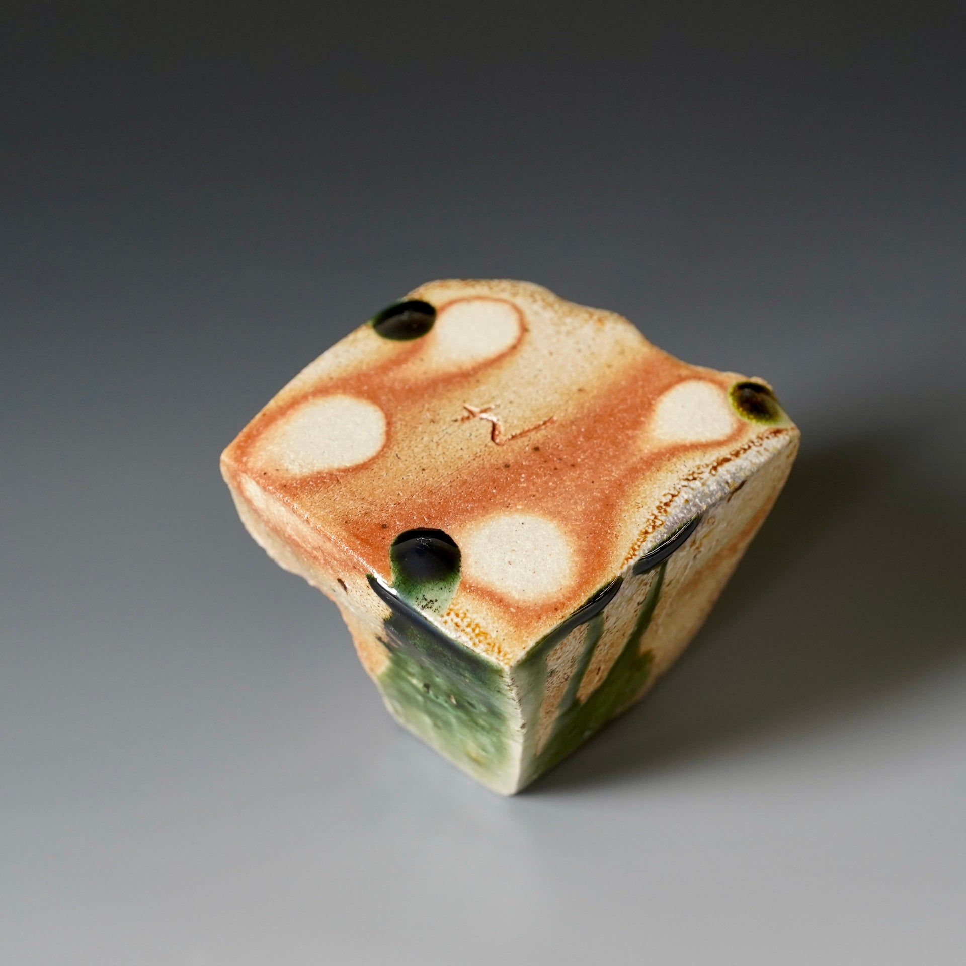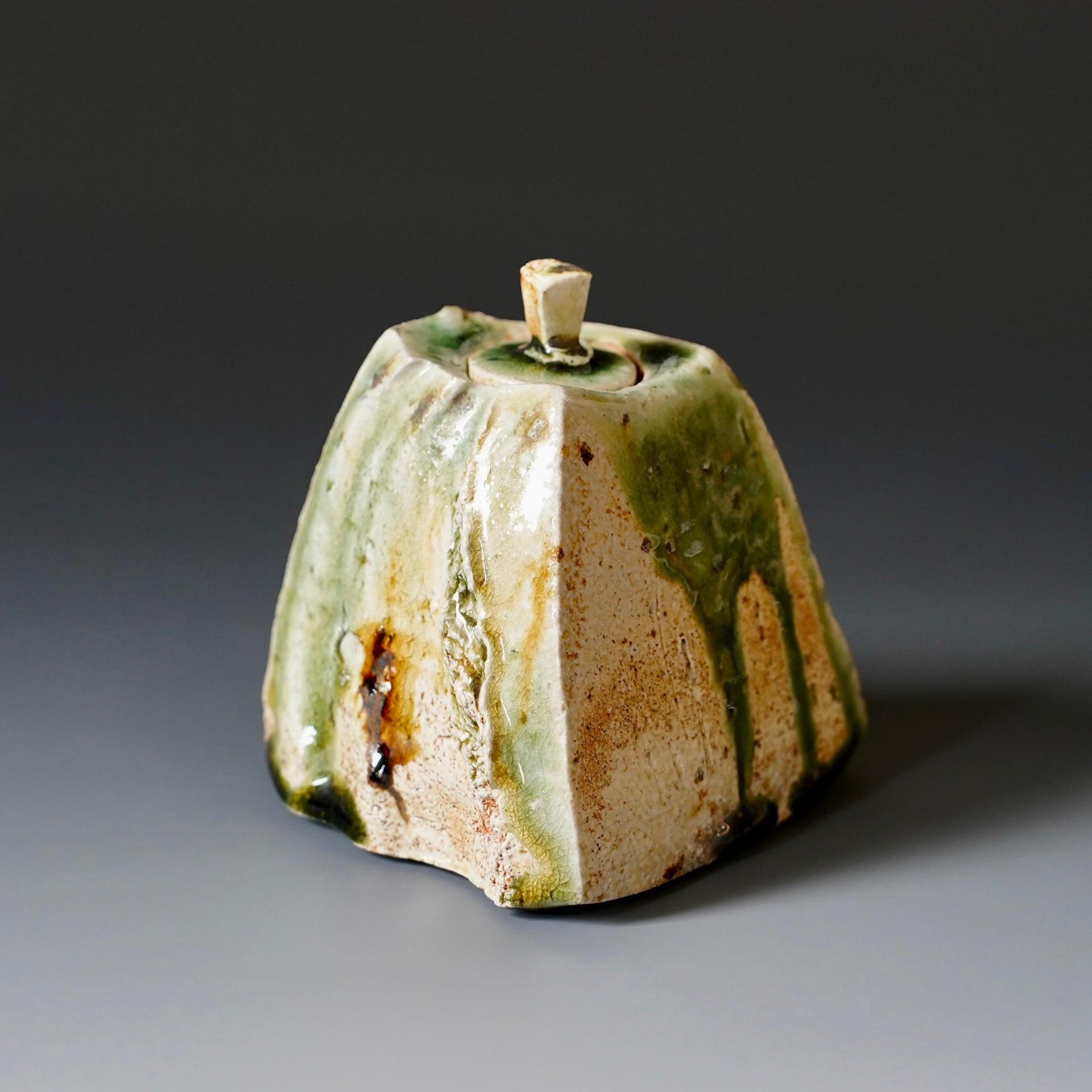 Lidded jar- natural wood ash, woodfired, Oribe glaze