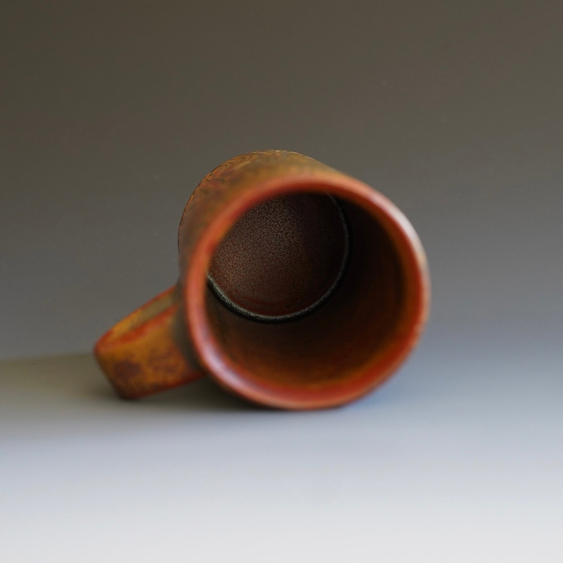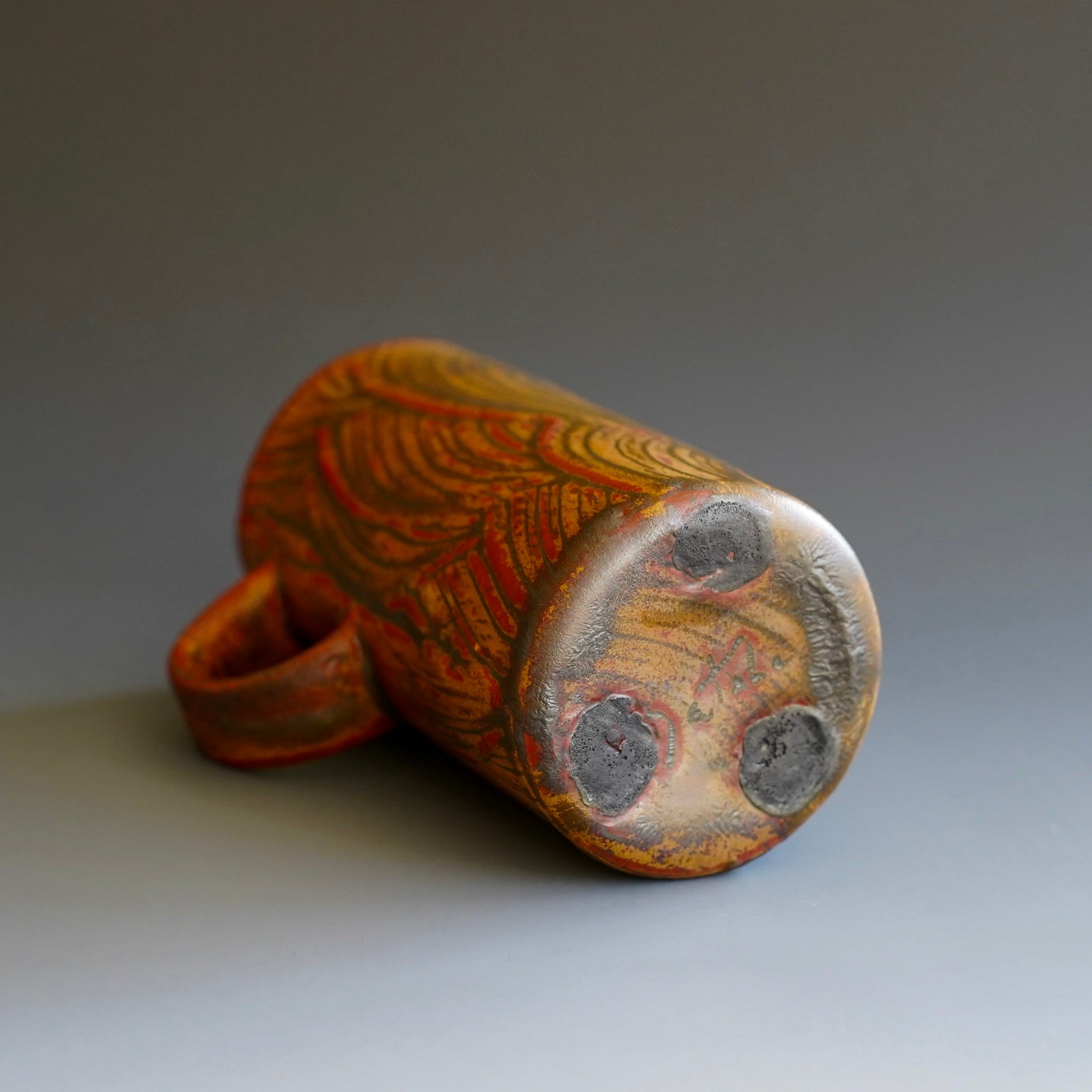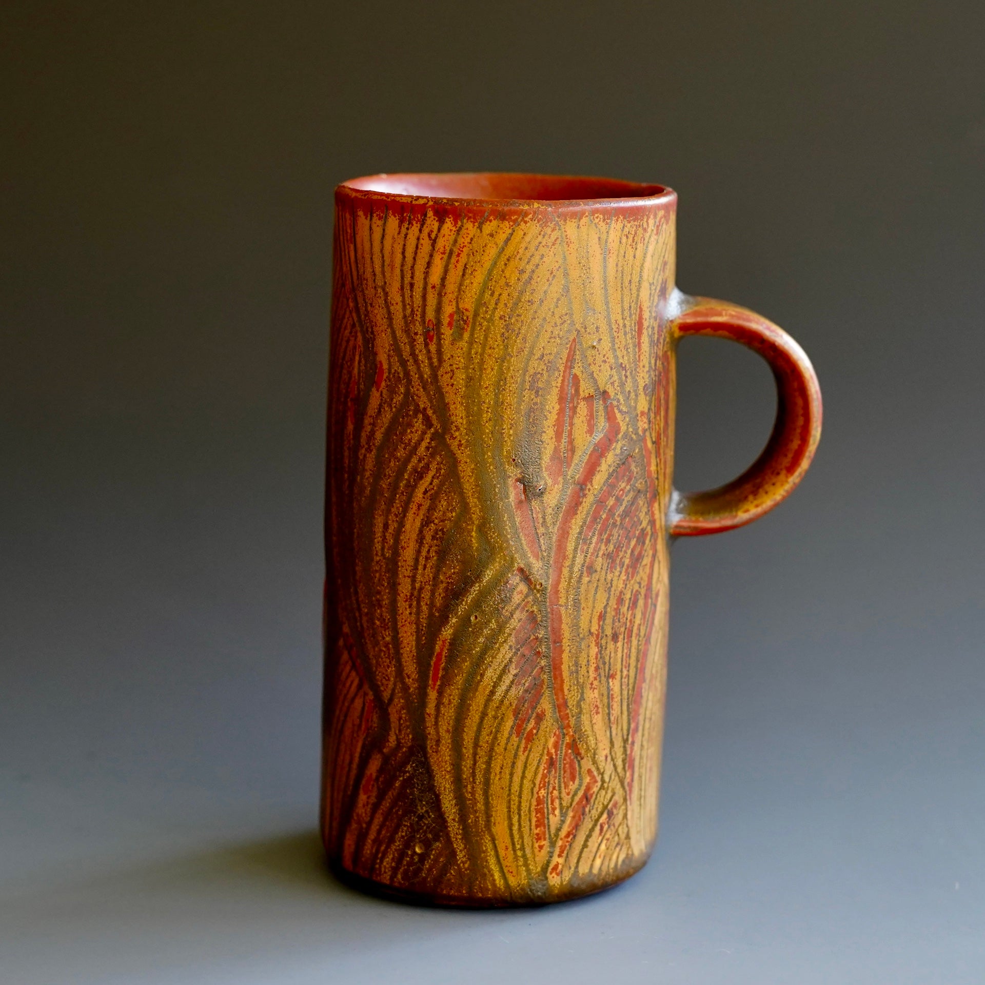 Mug cup - kohiki (white slip), glaze: Kaki, Tanka4.25(w/handle) x 3 x 6h inchesholds 14 oz to brim, 12oz comfortablyDesigned to fit standard car cup holders