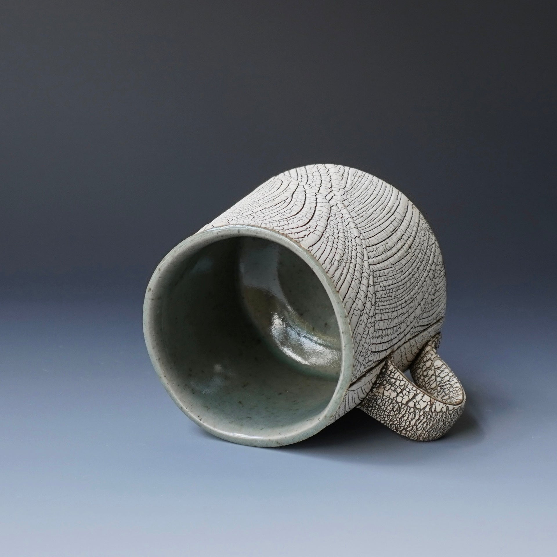 Mug cup - kohiki (white slip), liner glaze : celadon5 x 4 x 3.75h inchesholds 16 oz to the brim, 12.5oz comfortablyhandle for one finger