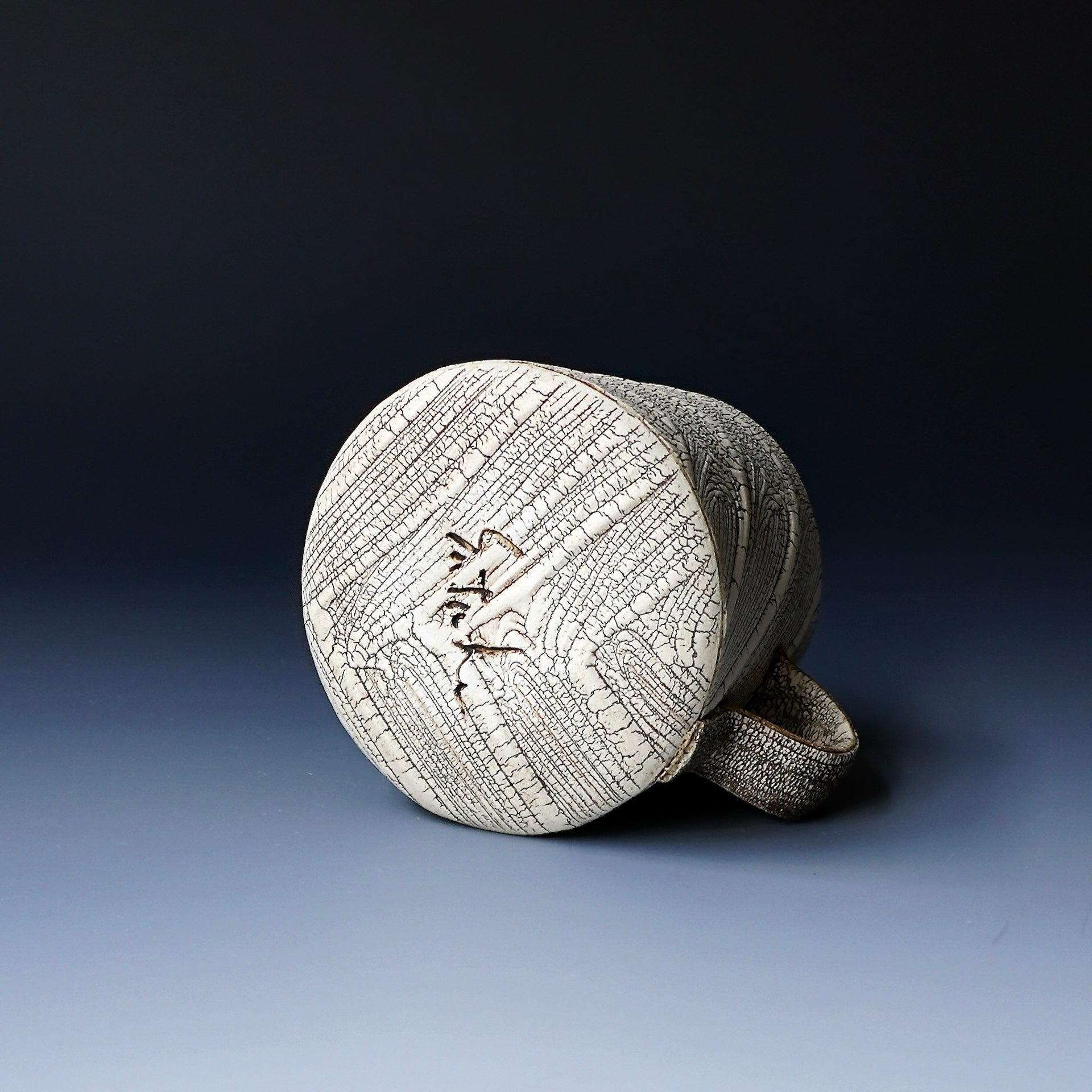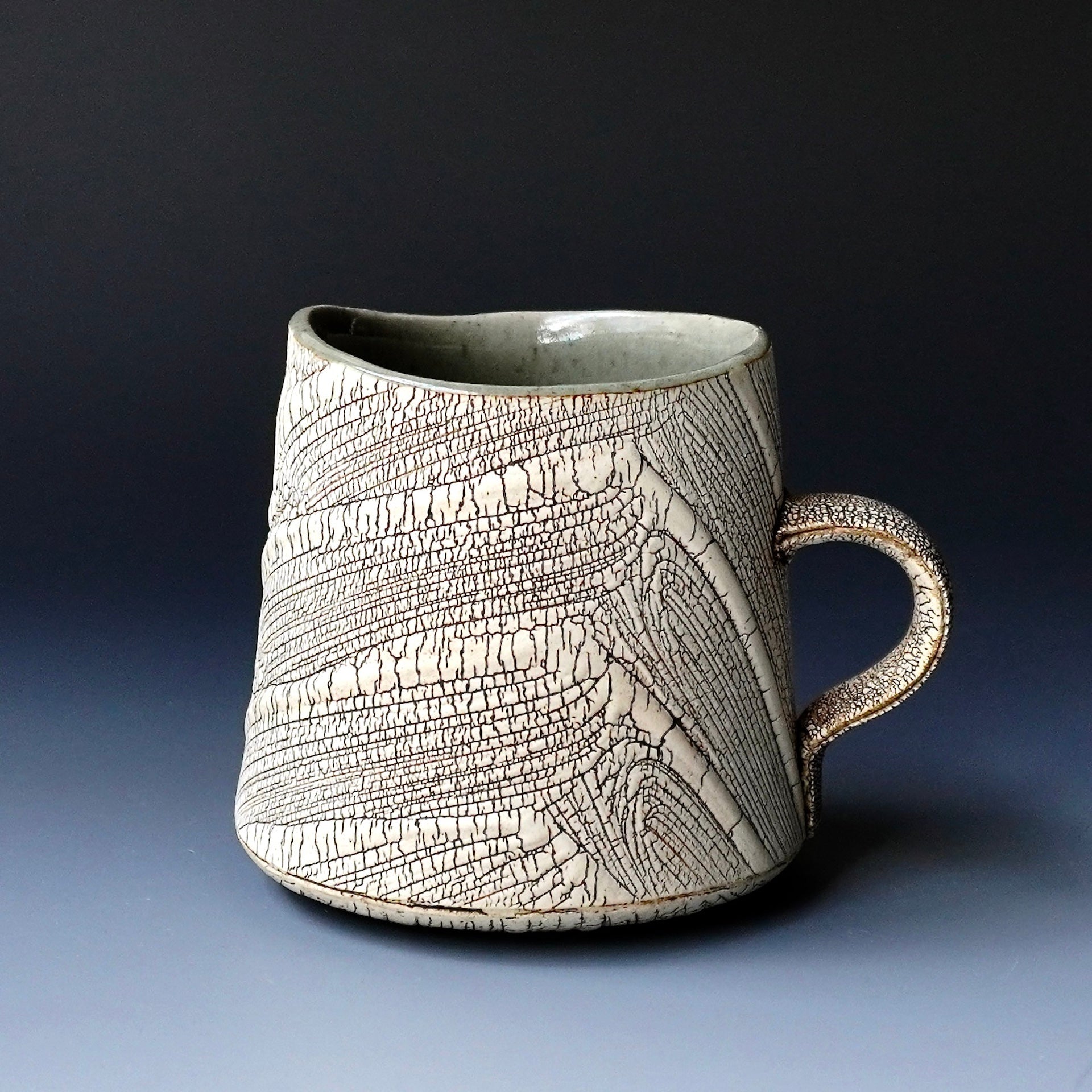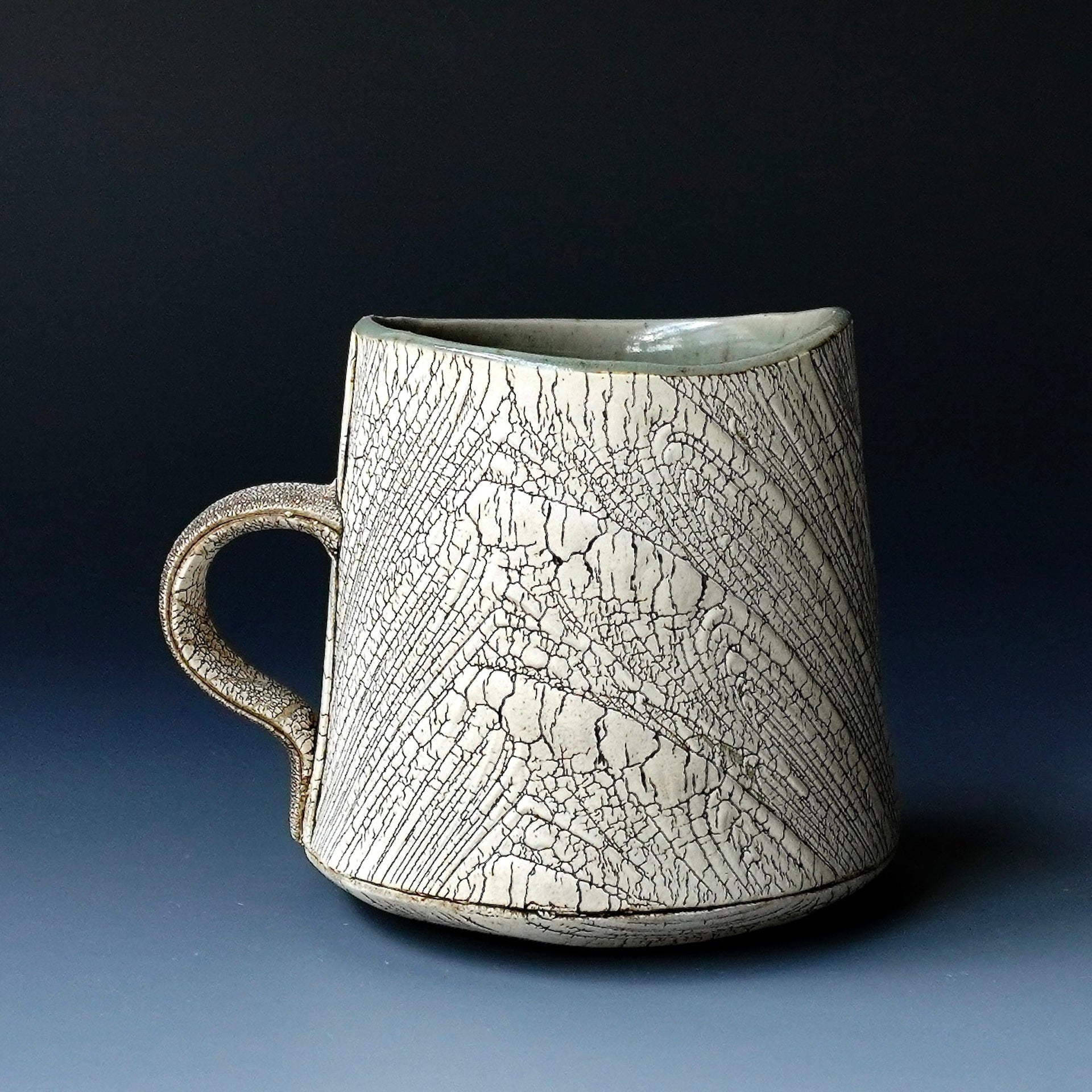 Mug cup - kohiki (white slip), liner glaze : celadon5 x 4 x 3.75h inchesholds 16 oz to the brim, 12.5oz comfortablyhandle for one finger