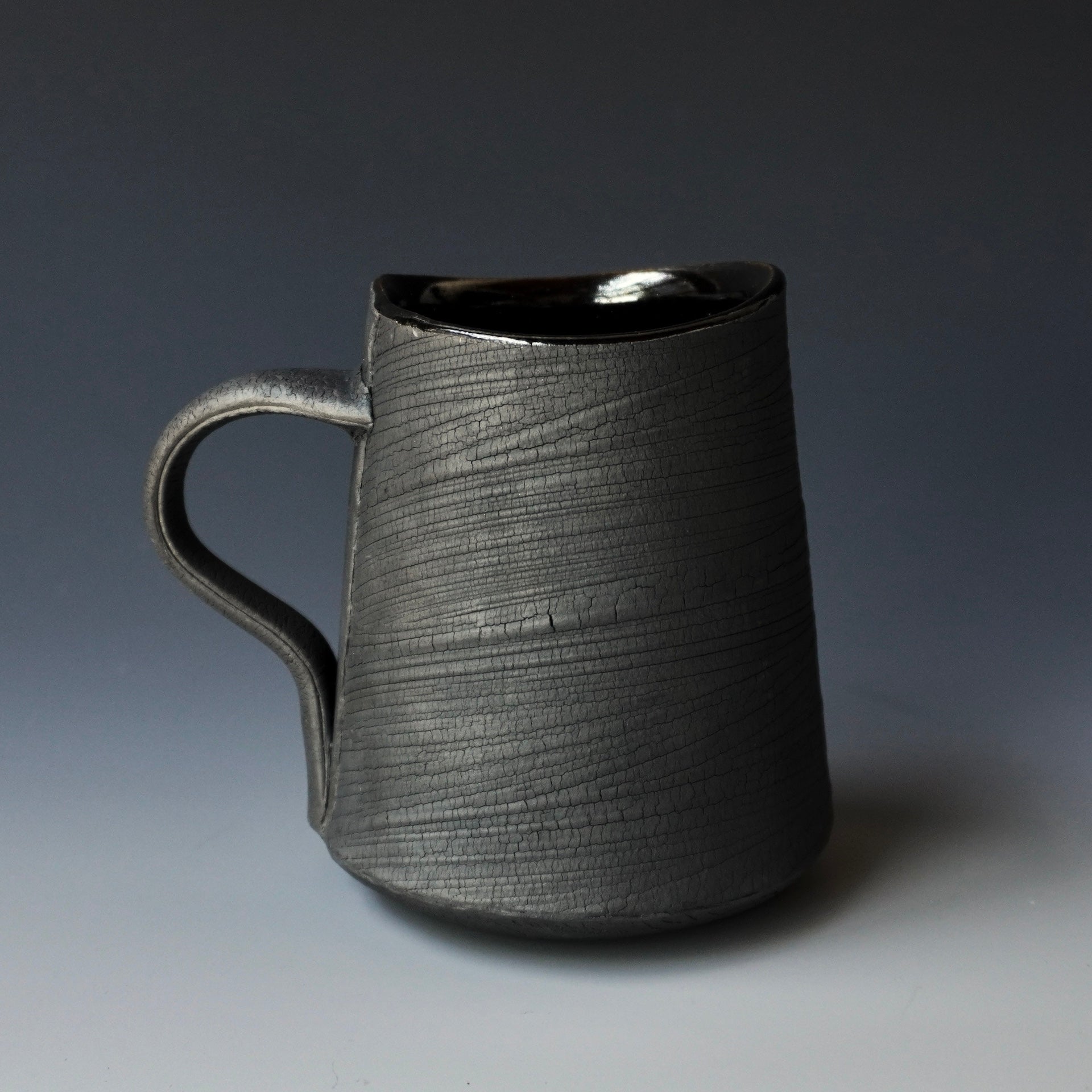 Mug cup - black kohiki, liner glaze : tenmokuThe piece is gas fired and then fired again in a sagger to create a black surface. 5w x 3.5d x 4.25h inchesholds 14 oz to brim, 12.5oz comfortablyhandle for two fingersShipping and Policy(bk-1835)