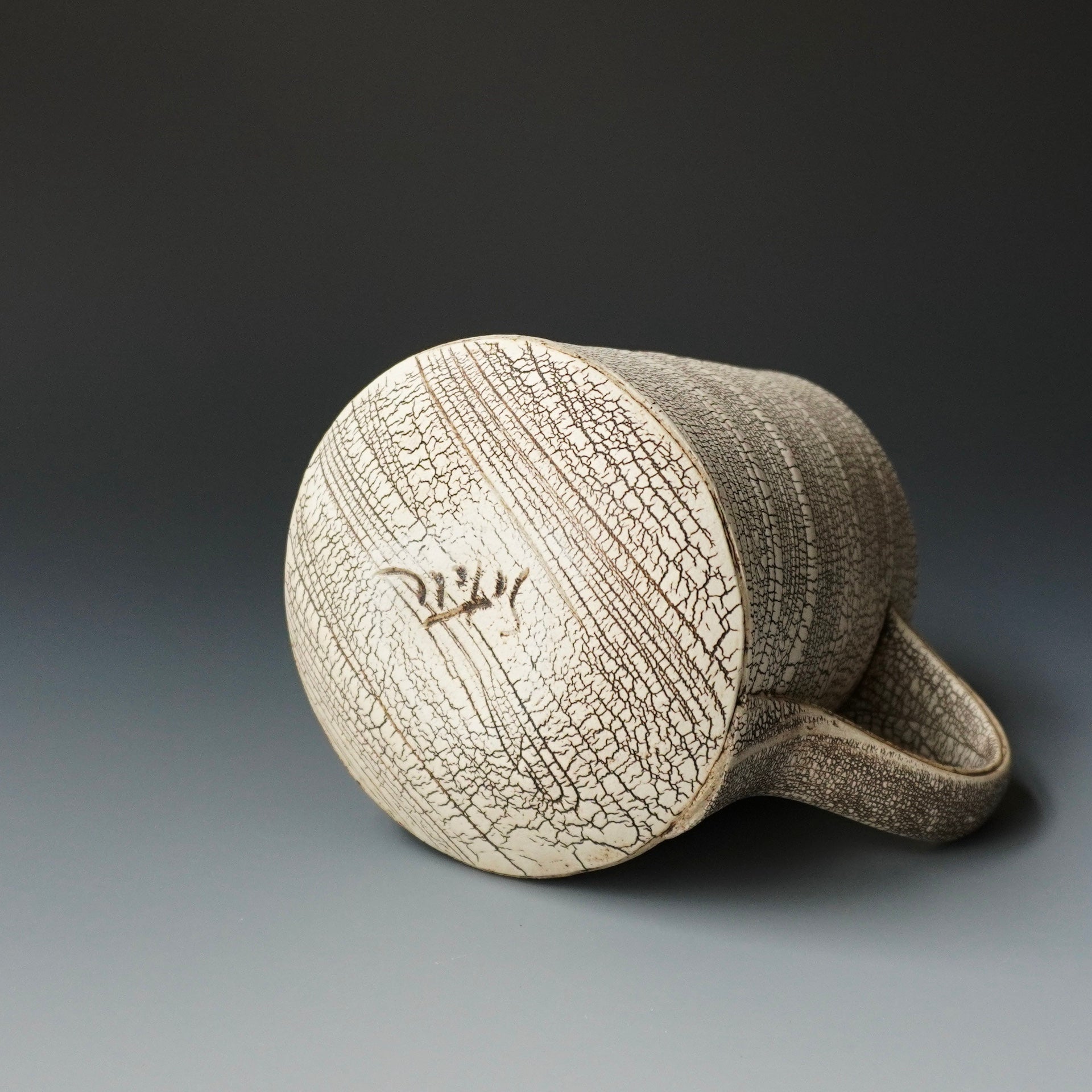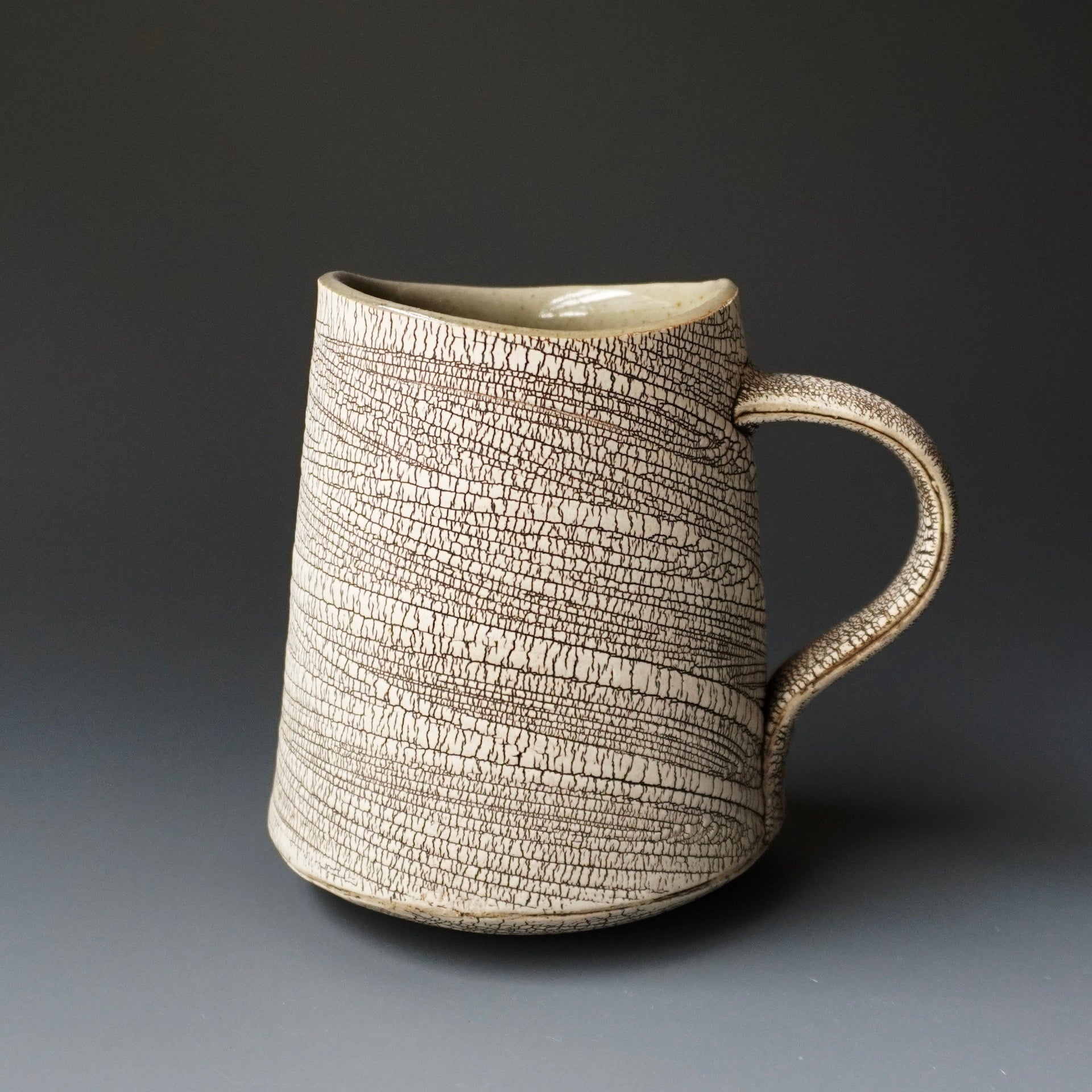 mug cup - kohiki (white slip), liner glaze : celadon5w x 3.5d x 4.25h inchesholds 14 oz to brim, 12.5oz comfortablyhandle for two fingers