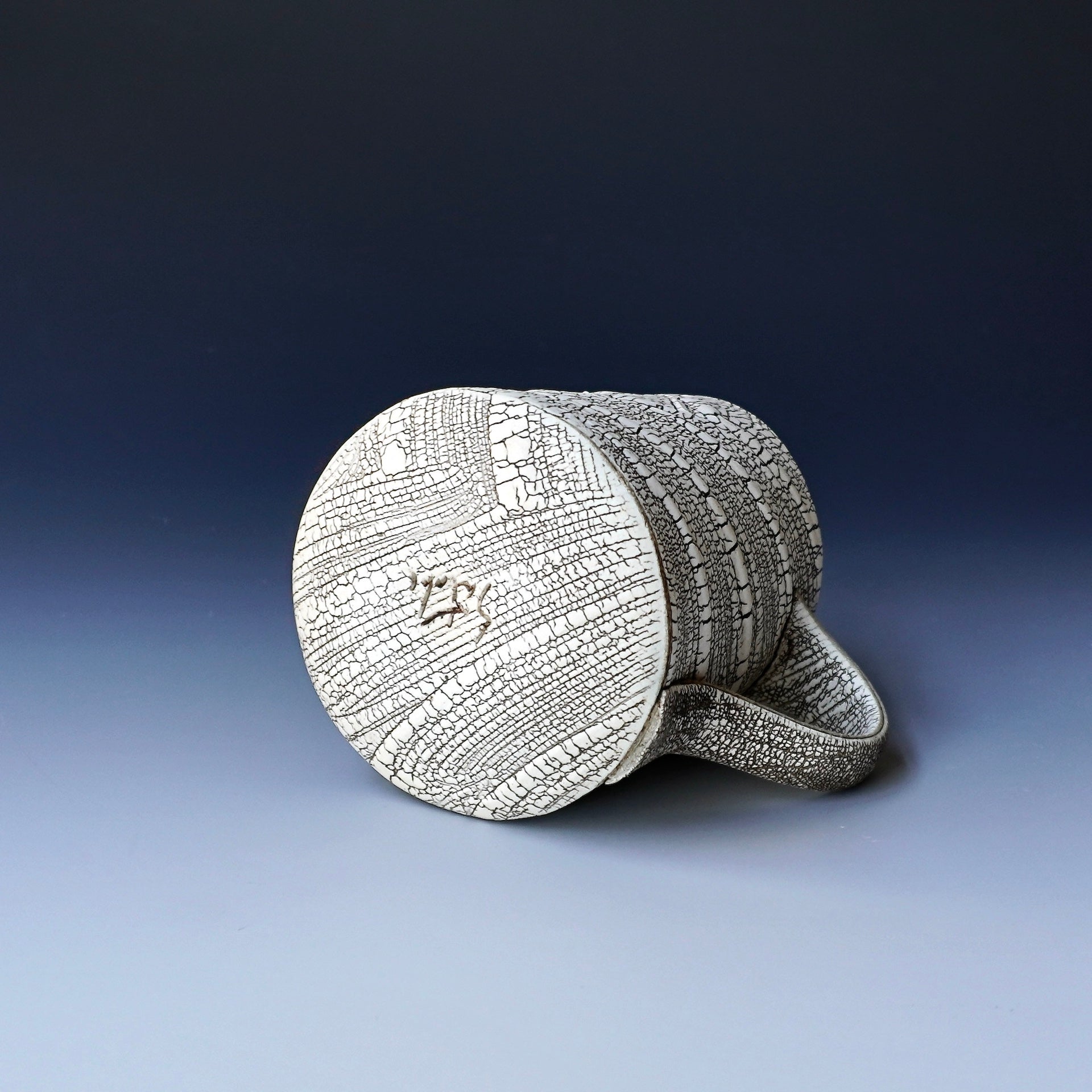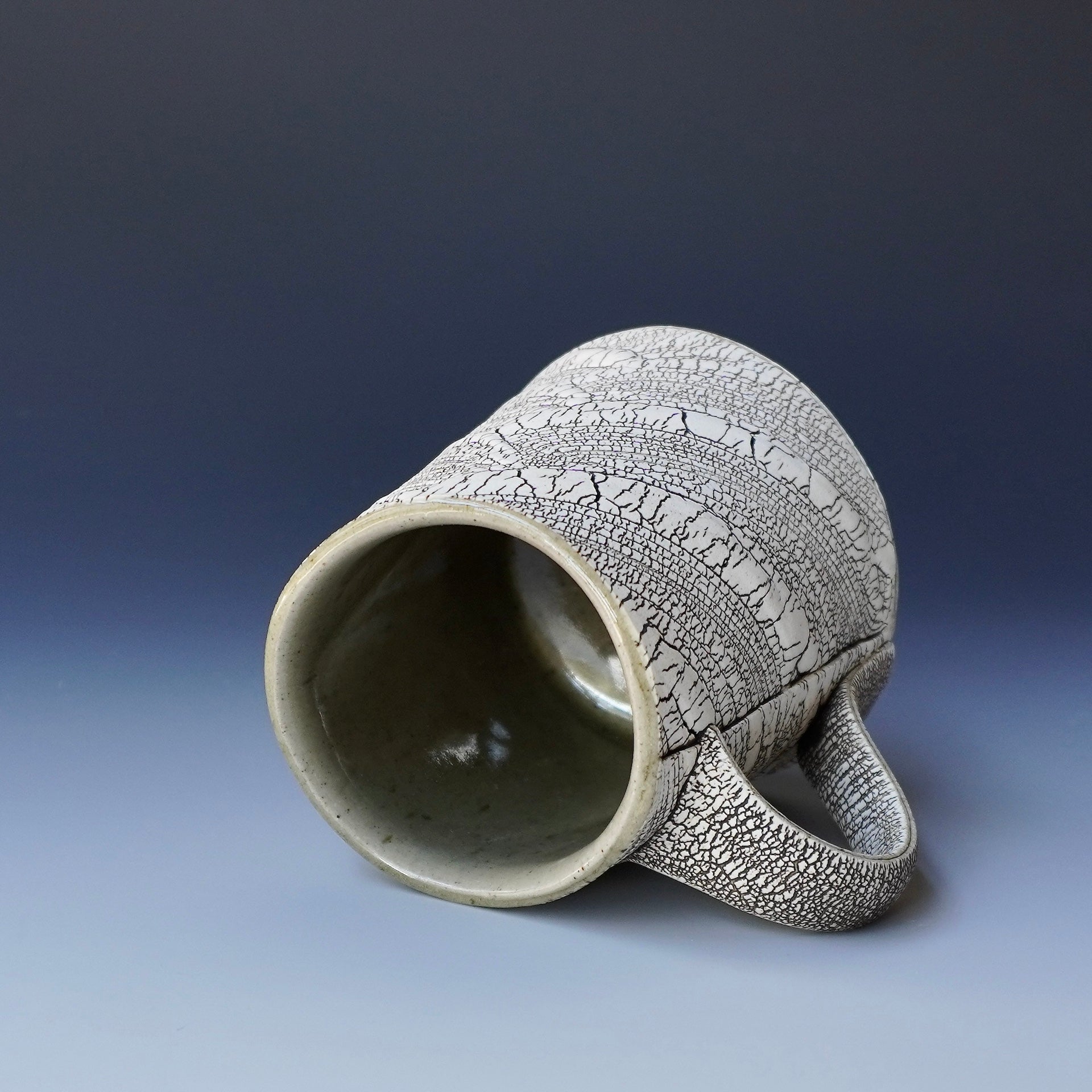 mug cup - kohiki (white slip), liner glaze : celadon5w x 3.5d x 4.25h inchesholds 14 oz to brim, 12.5oz comfortablyhandle for two fingers