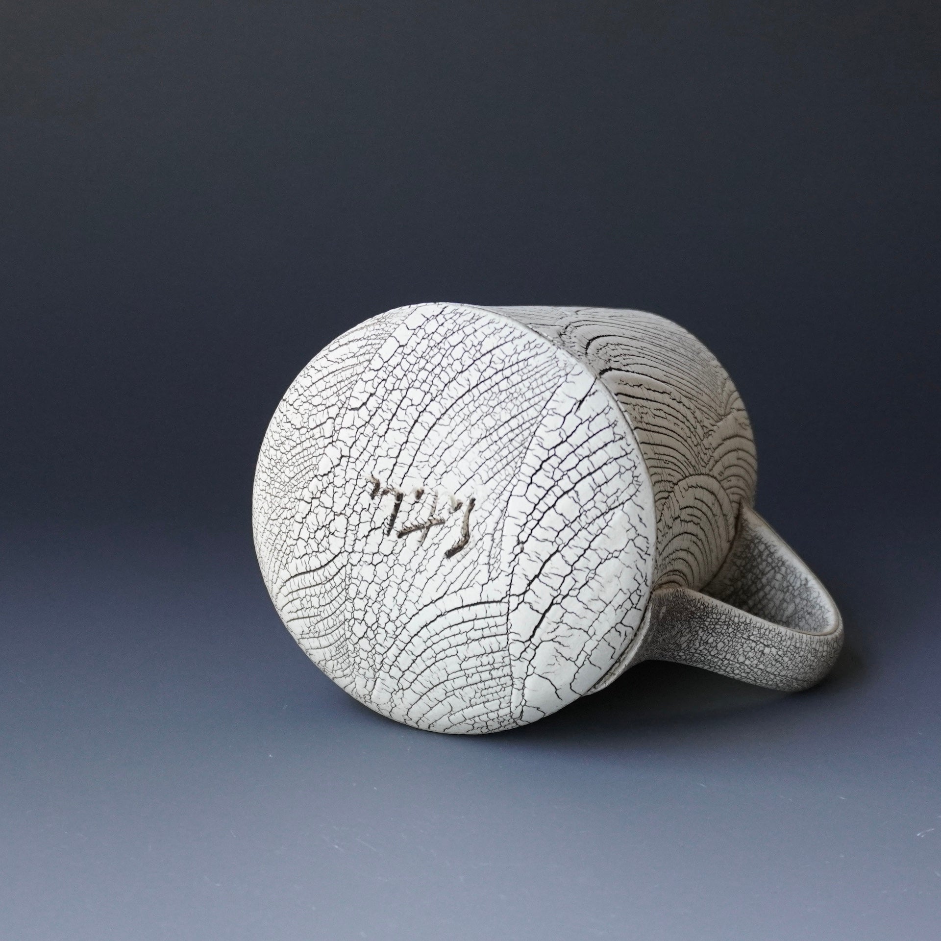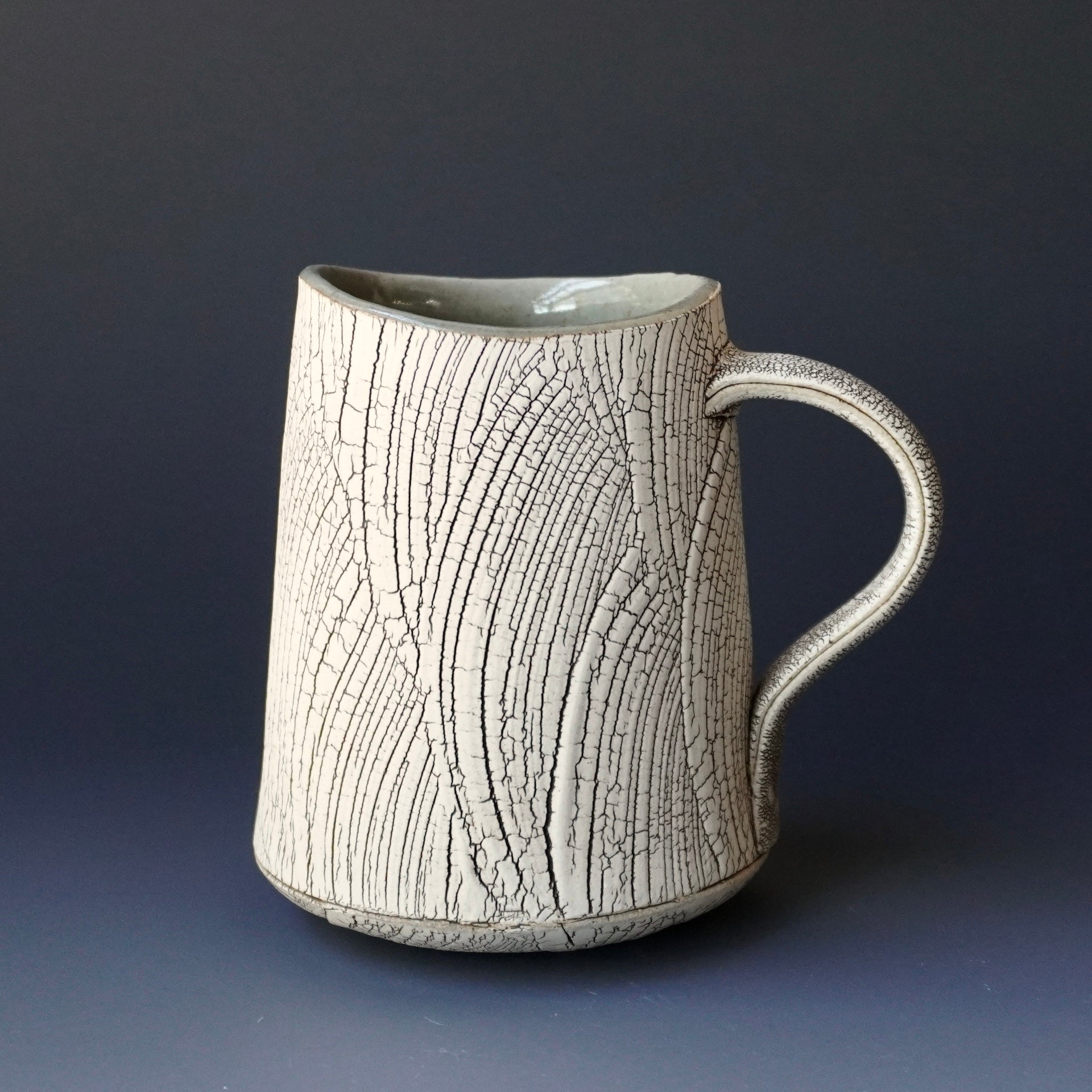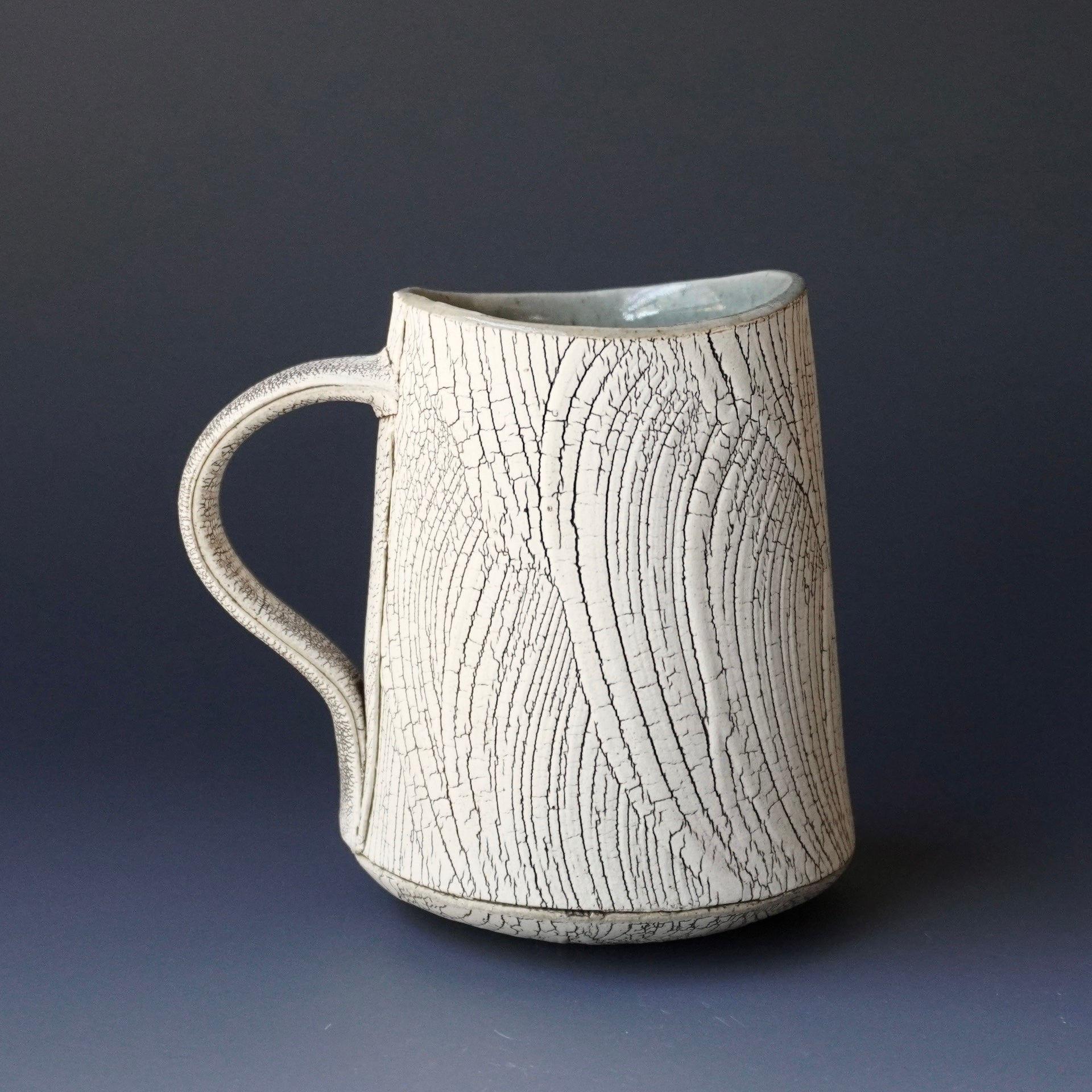 mug cup - kohiki (white slip), liner glaze : celadon5w x 3.5d x 4.25h inchesholds 14 oz to brim, 12.5oz comfortablyhandle for two fingers