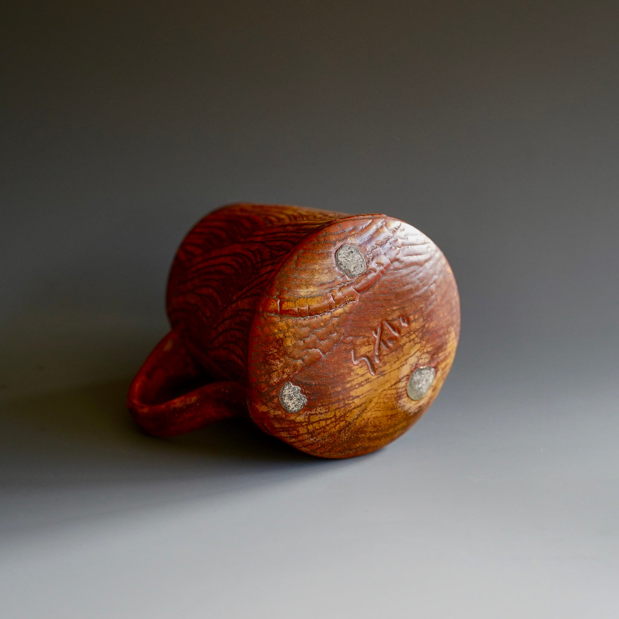 Mug cup - Beni(Red) kohiki, Kaki glaze, liner glaze : kaki, Tanka5w x 3.5d x 4.25h inchesholds 14 oz to brim, 12oz comfortablyhandle for two fingers