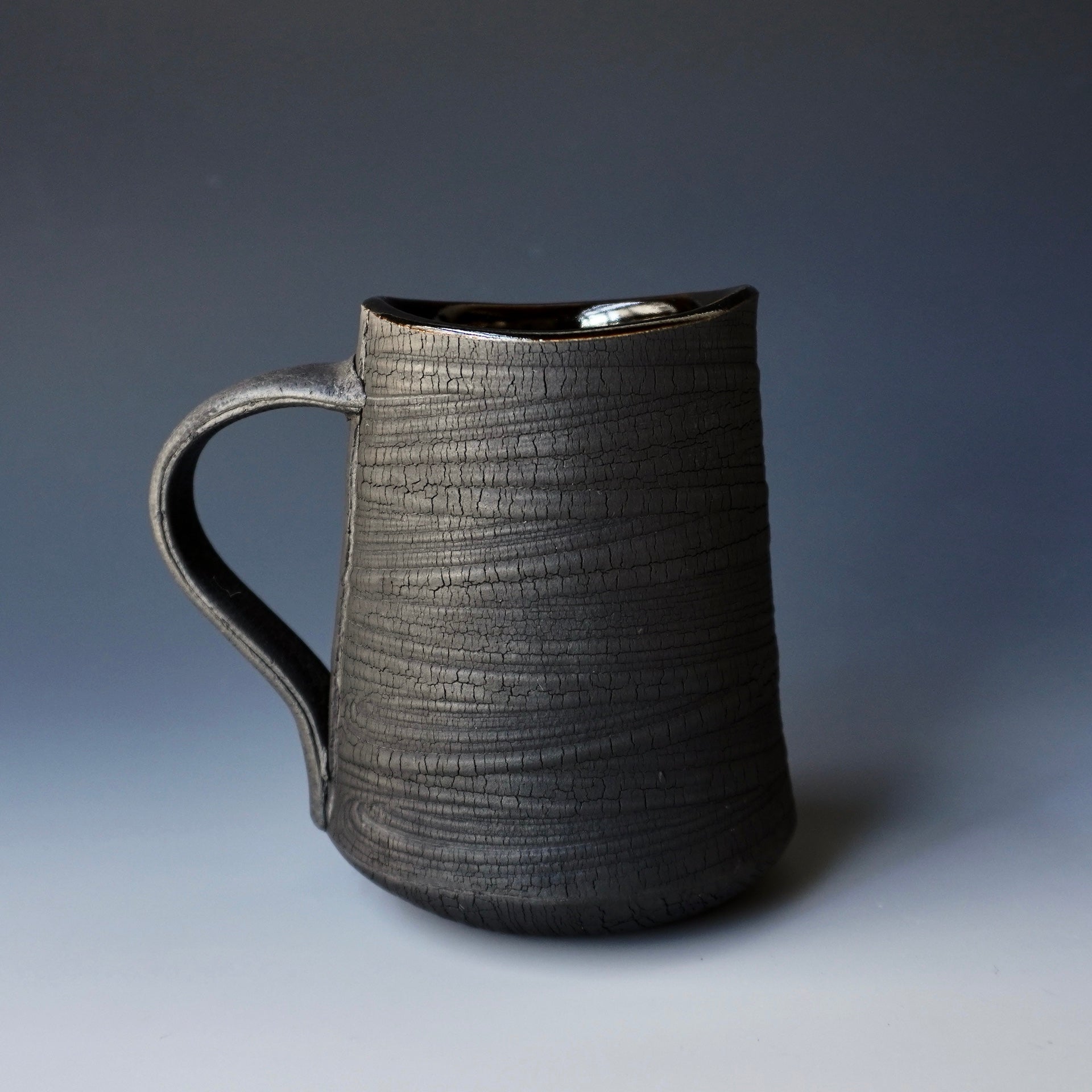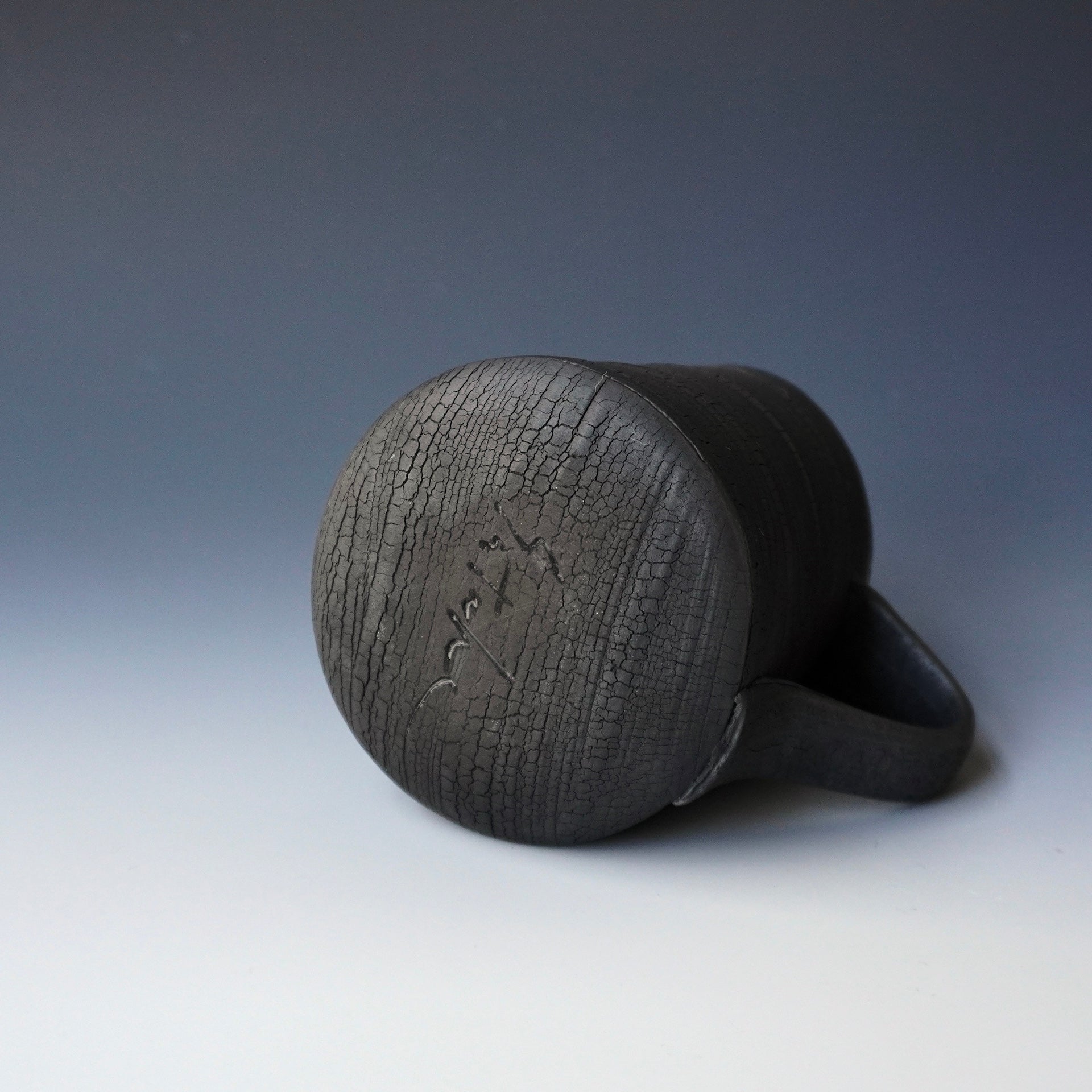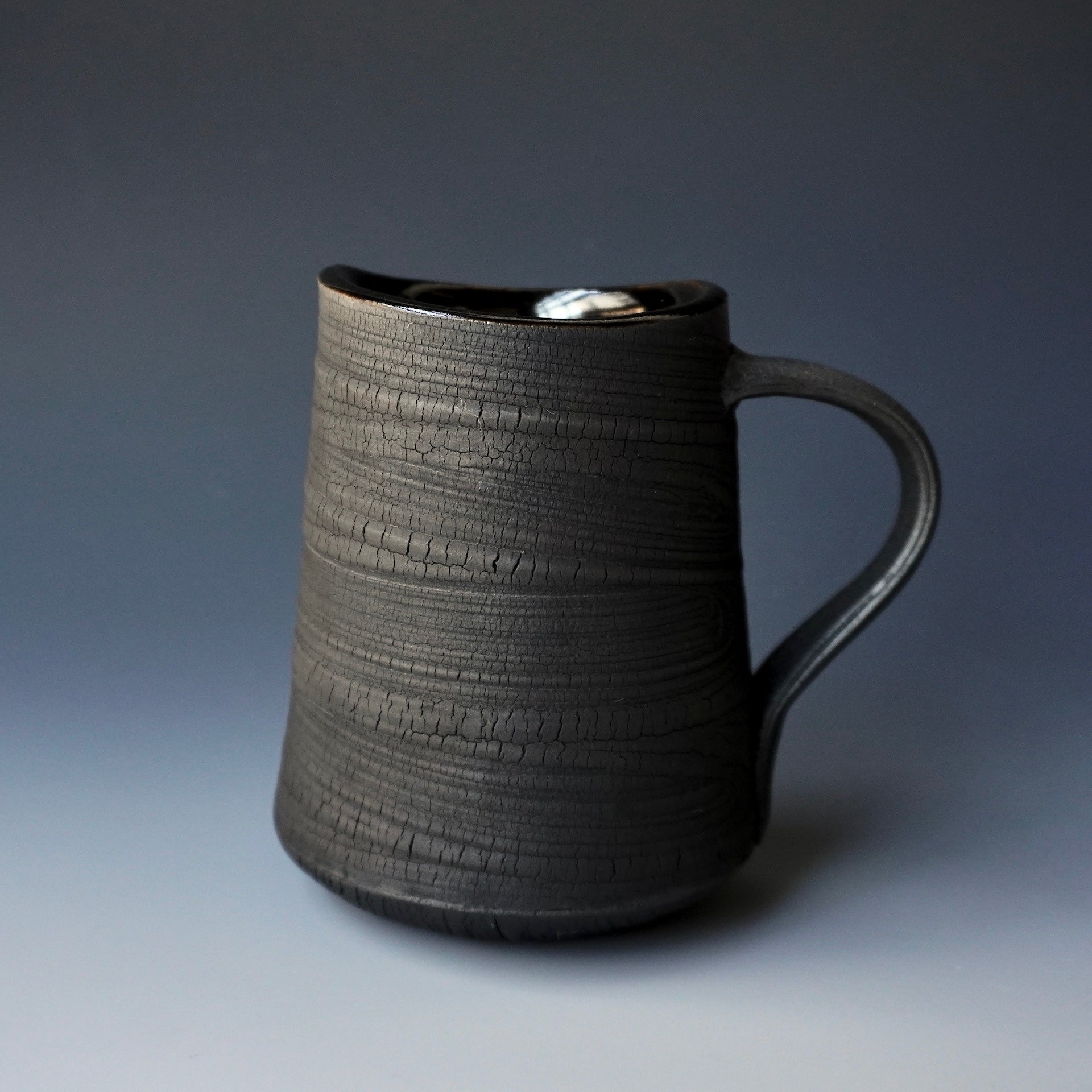 The piece is gas fired and then fired again in a sagger to create a black surface.