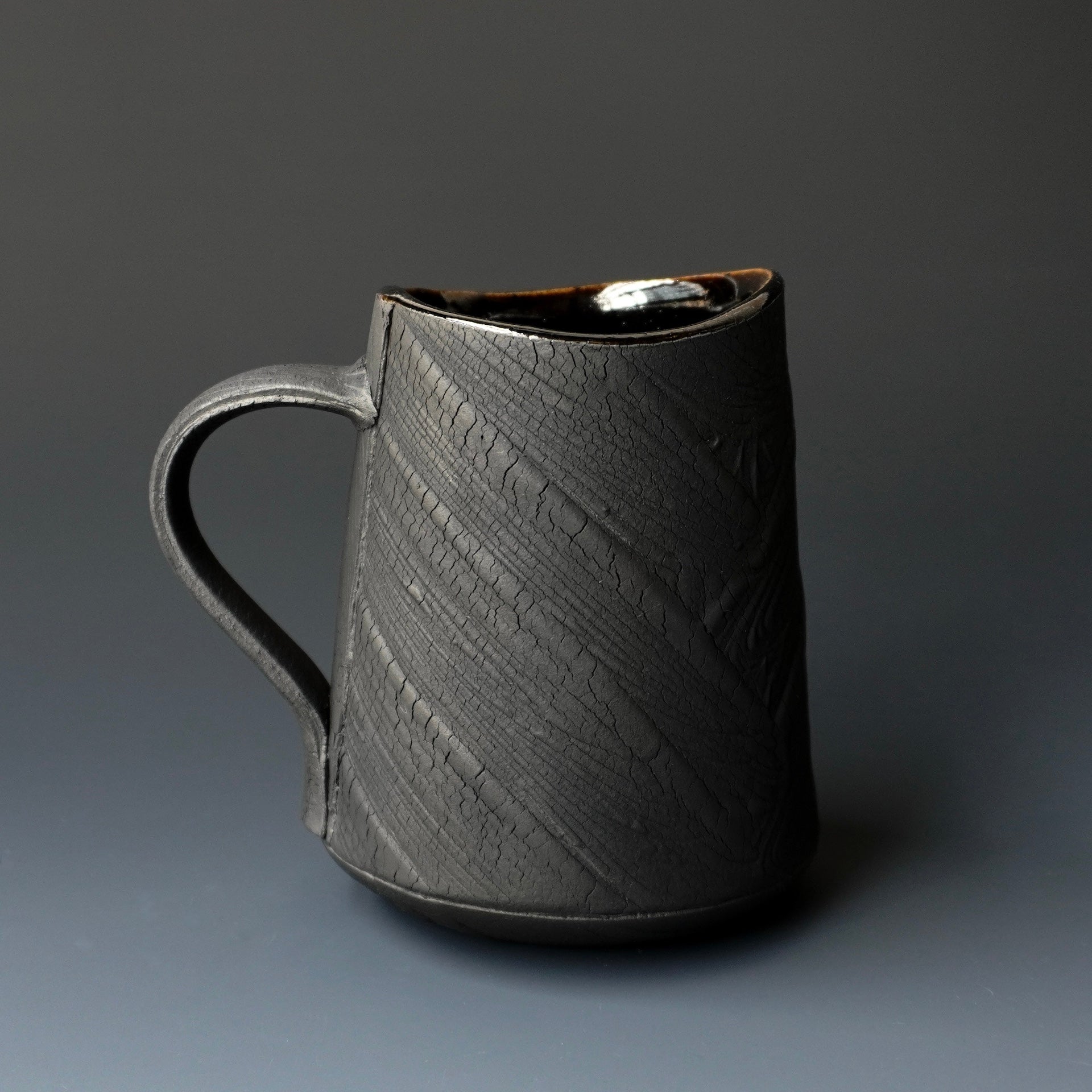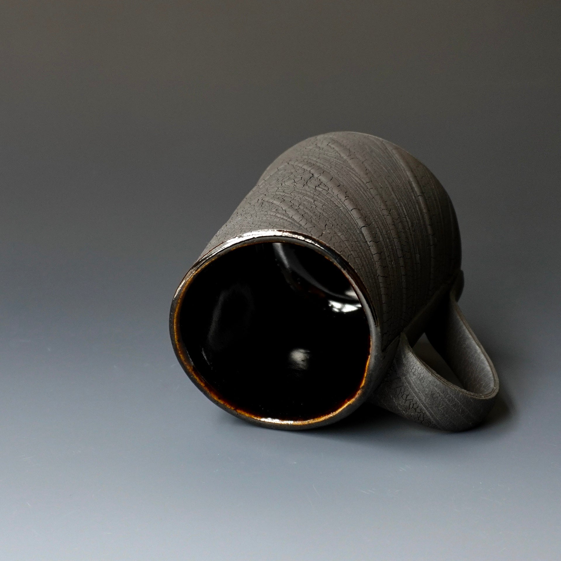 Mug cup - black kohiki, liner glaze : tenmokuThe piece is gas fired and then fired again in a sagger to create a black surface. 5w x 3.5d x 4.25h inchesholds 14 oz to brim, 12.5oz comfortablyhandle for two fingersShipping and Policy(bk-1988)