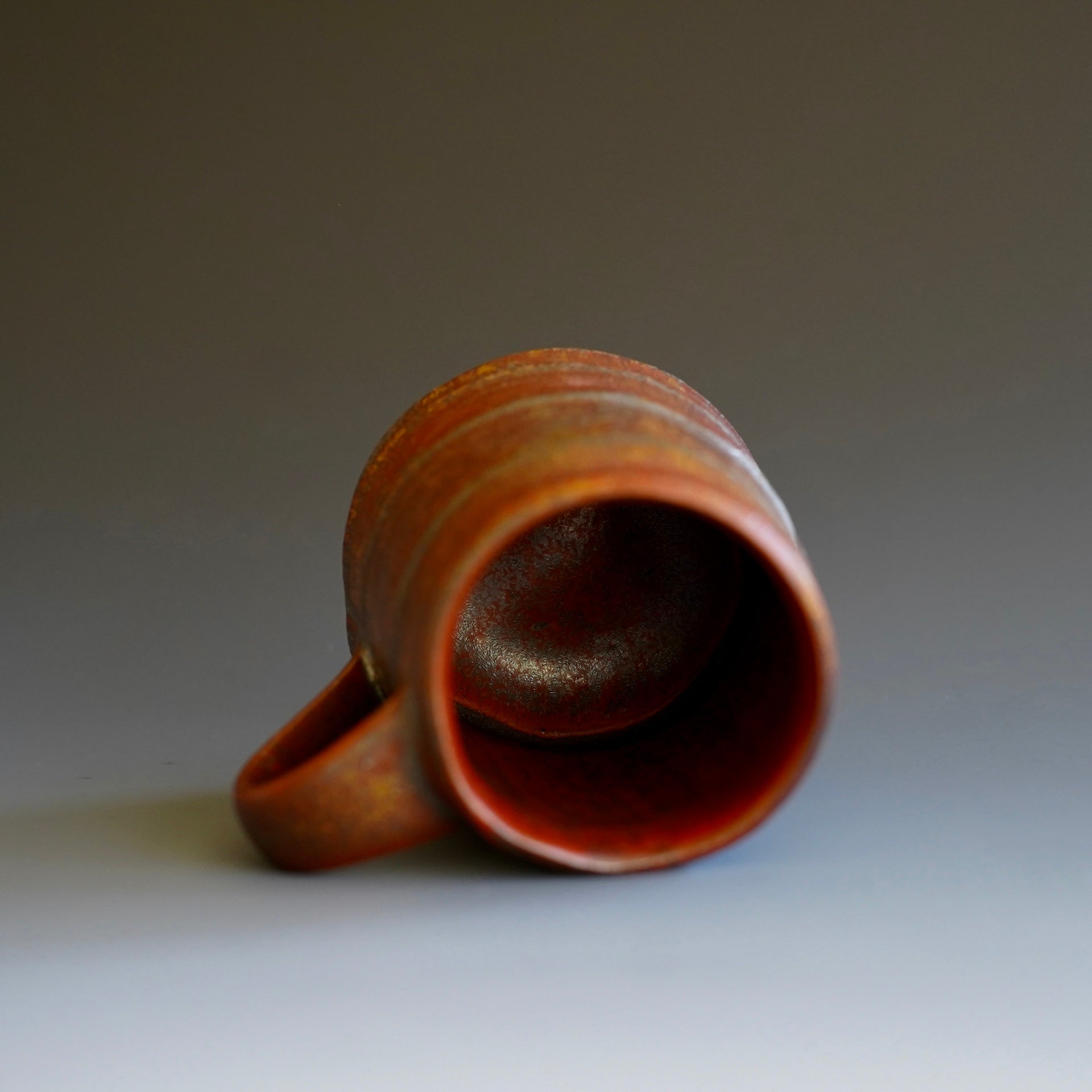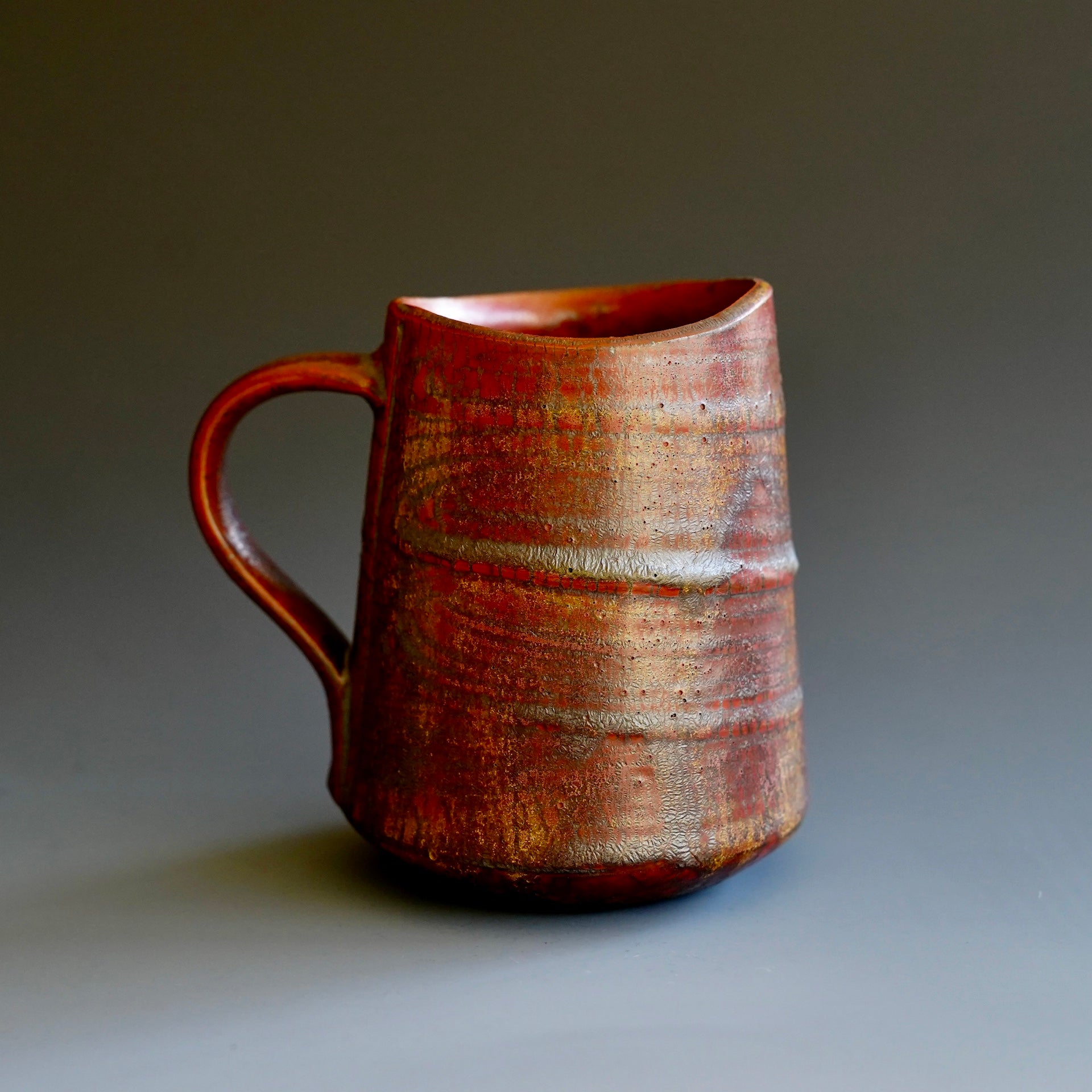 Mug cup - Beni(Red) kohiki, Kaki glaze, liner glaze : kaki, Tanka5w x 3.5d x 4.25h inchesholds 14 oz to brim, 12oz comfortablyhandle for two fingers