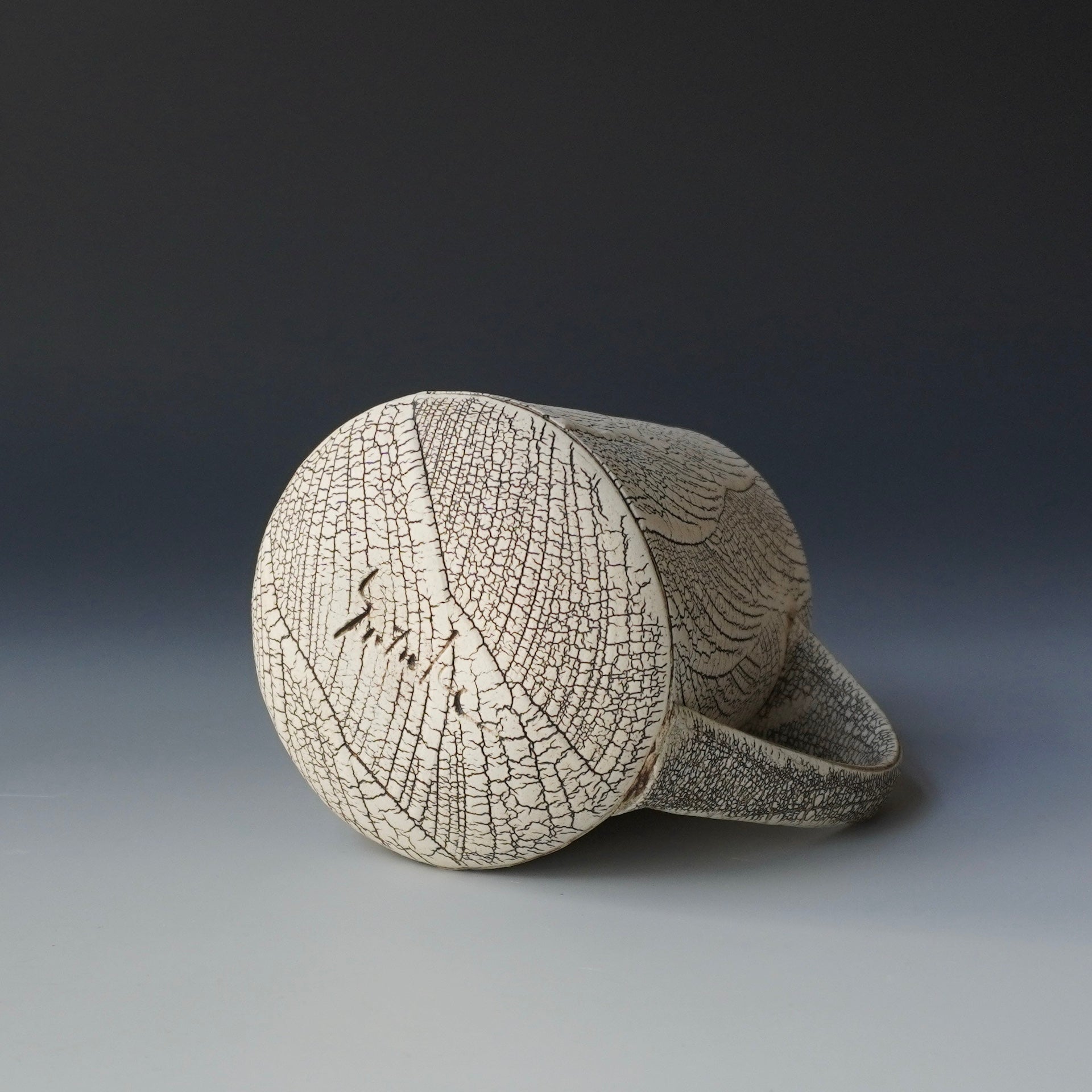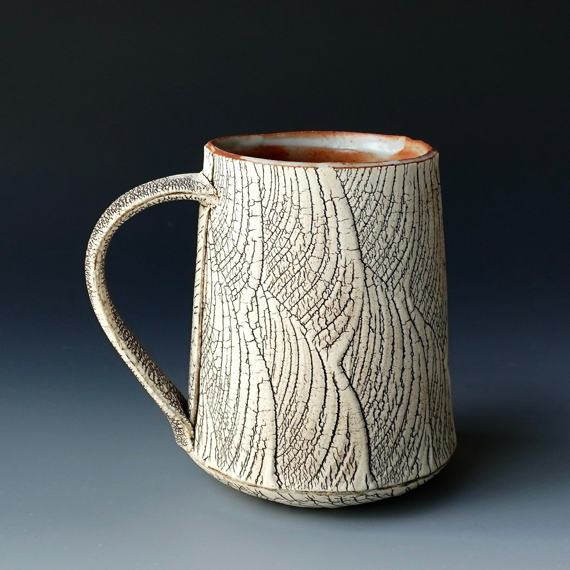 Mug cup - kohiki (white slip), liner glaze: shino4.75 x 3.75 x 4.5 inchesholds 15 oz to brim, 13oz comfortablyhandle for three fingers