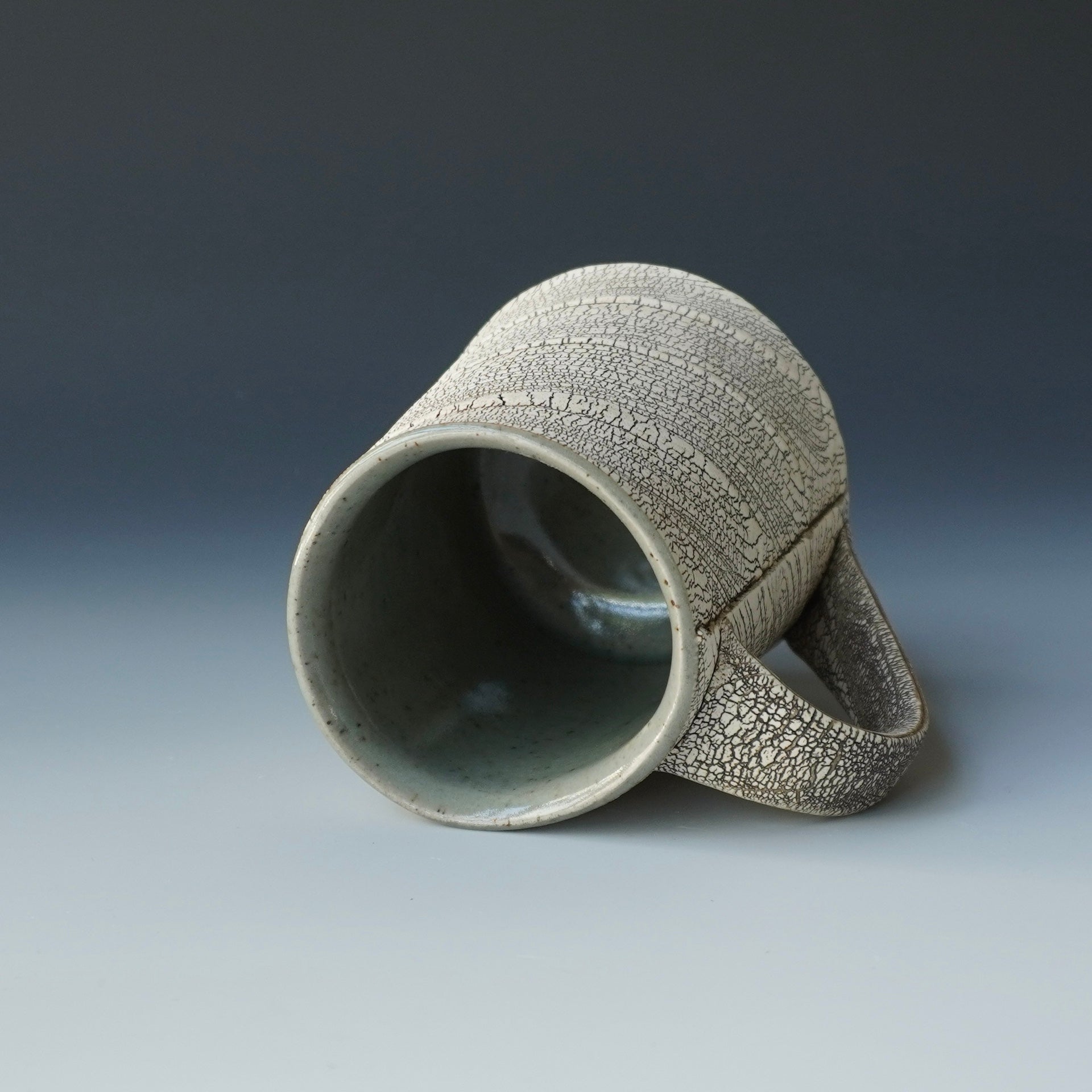 Mug cup - kohiki (white slip), liner glaze:celadon4.75 x 3.75 x 4.5 inchesholds 15 oz to brim, 13oz comfortablyhandle for three fingers