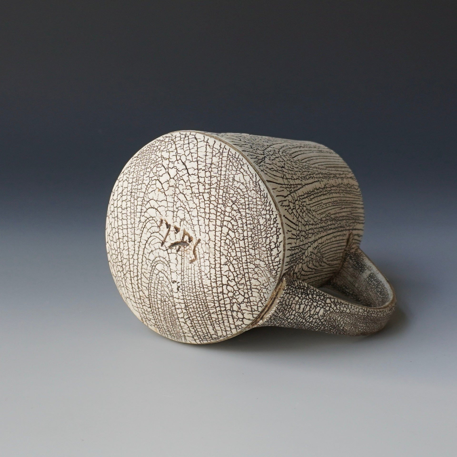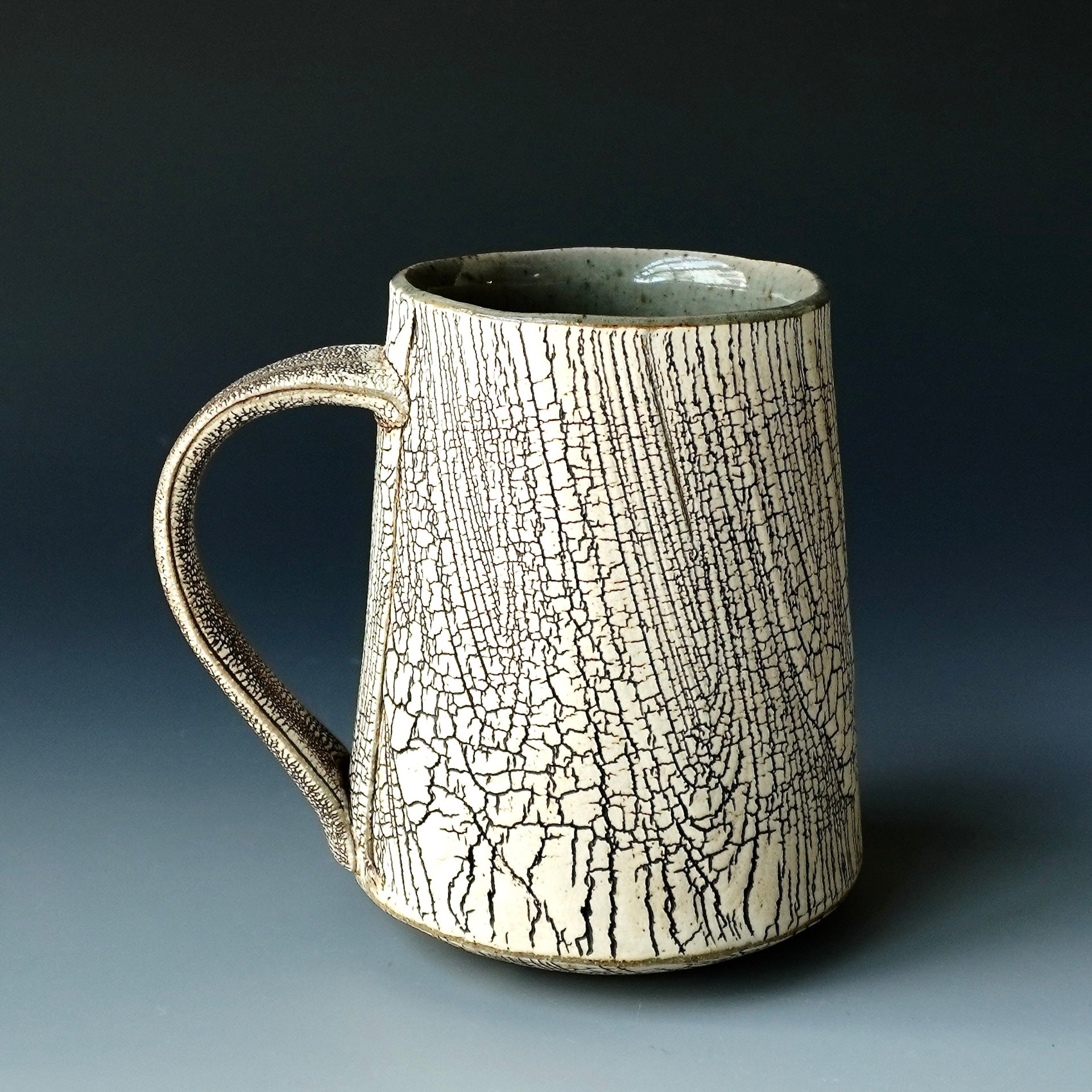 Mug cup - kohiki (white slip), liner glaze:celadon4.75 x 3.75 x 4.5 inchesholds 15 oz to brim, 13oz comfortablyhandle for three fingers