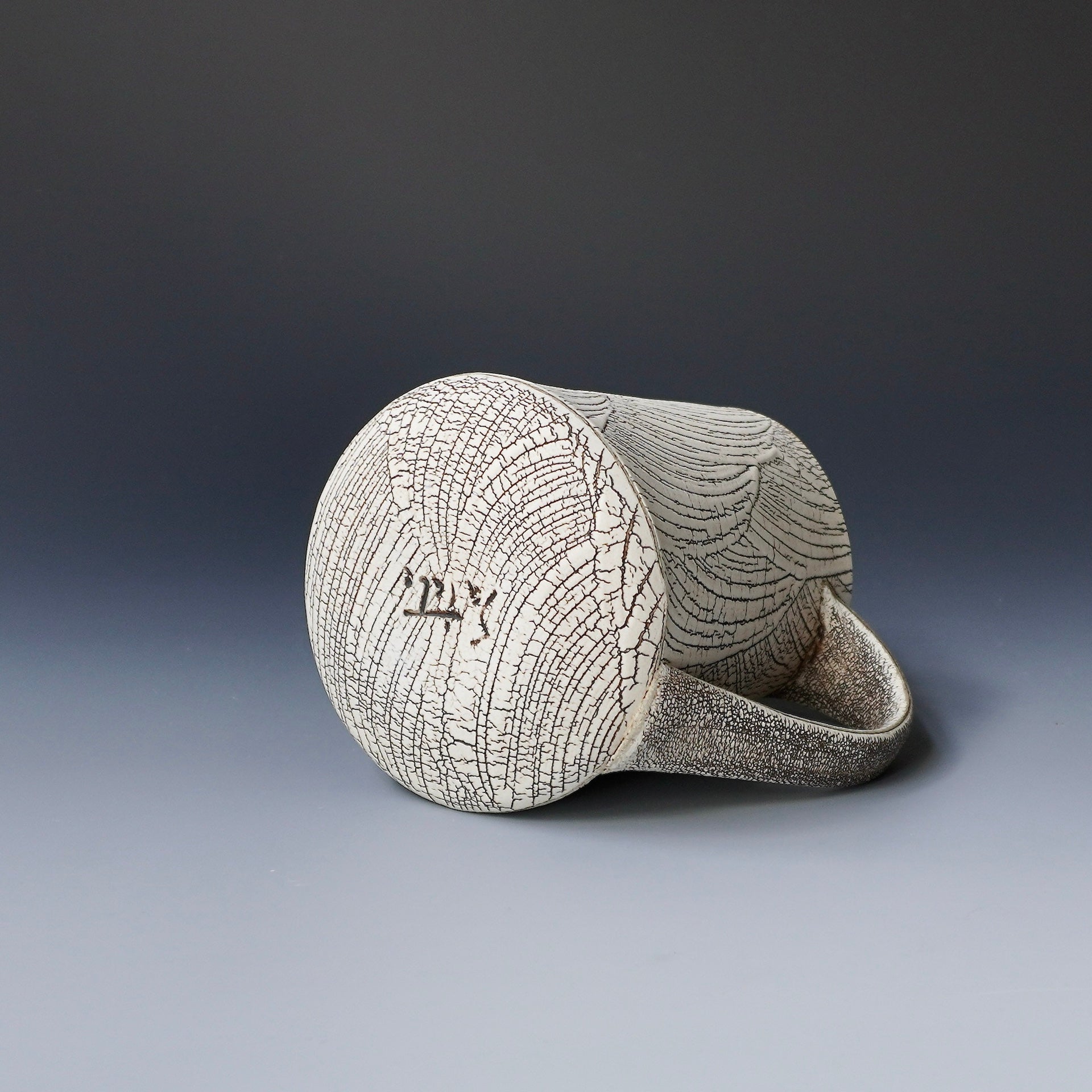 Mug cup - kohiki (white slip), liner glaze:celadon4.75 x 3.75 x 4.5 inchesholds 15 oz to brim, 13oz comfortablyhandle for three fingers