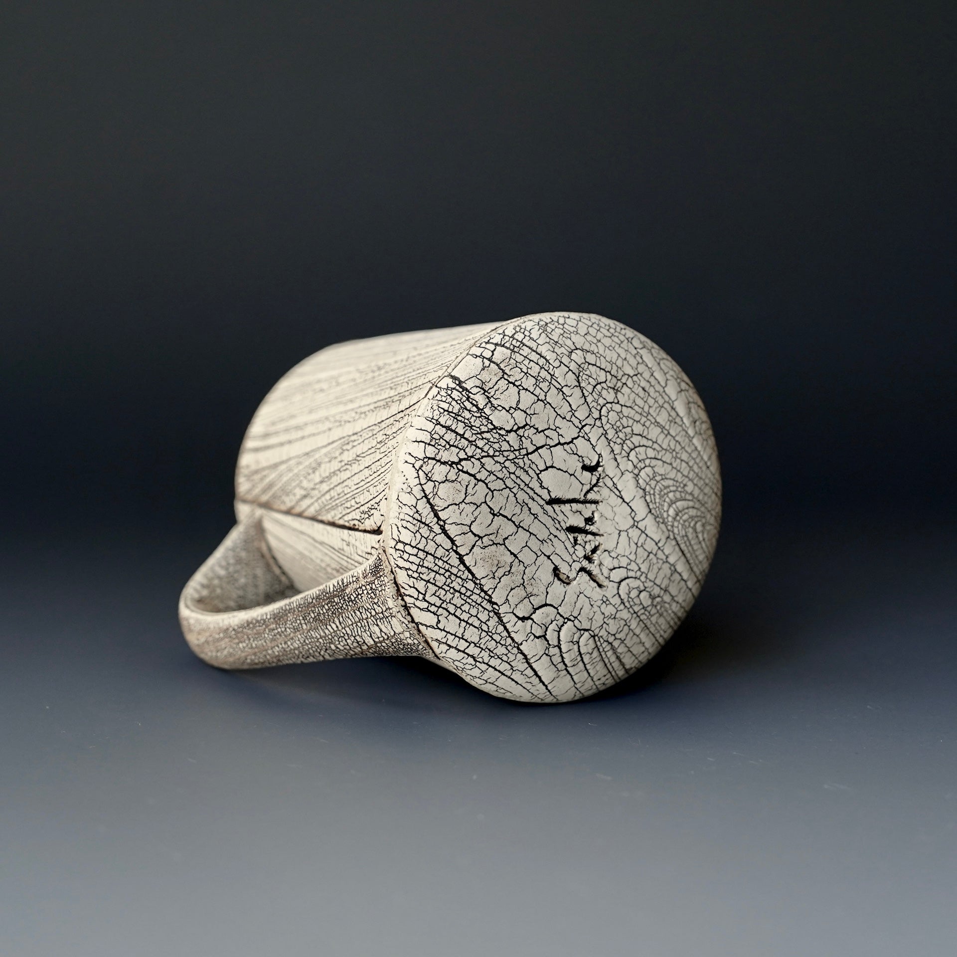 Mug cup - kohiki (white slip), liner glaze:celadon4.75 x 3.75 x 4.5 inchesholds 15 oz to brim, 13oz comfortablyhandle for three fingers