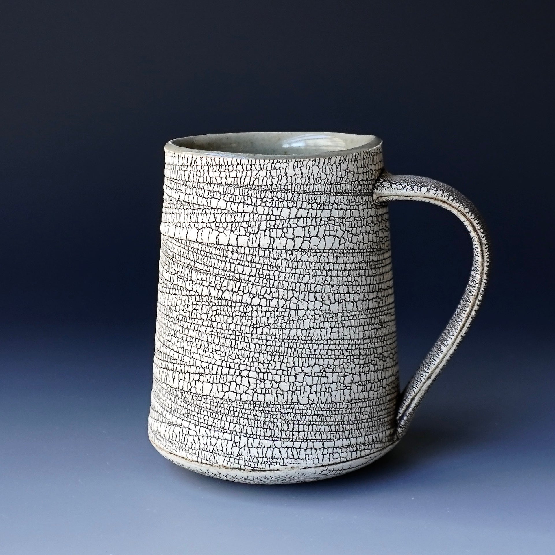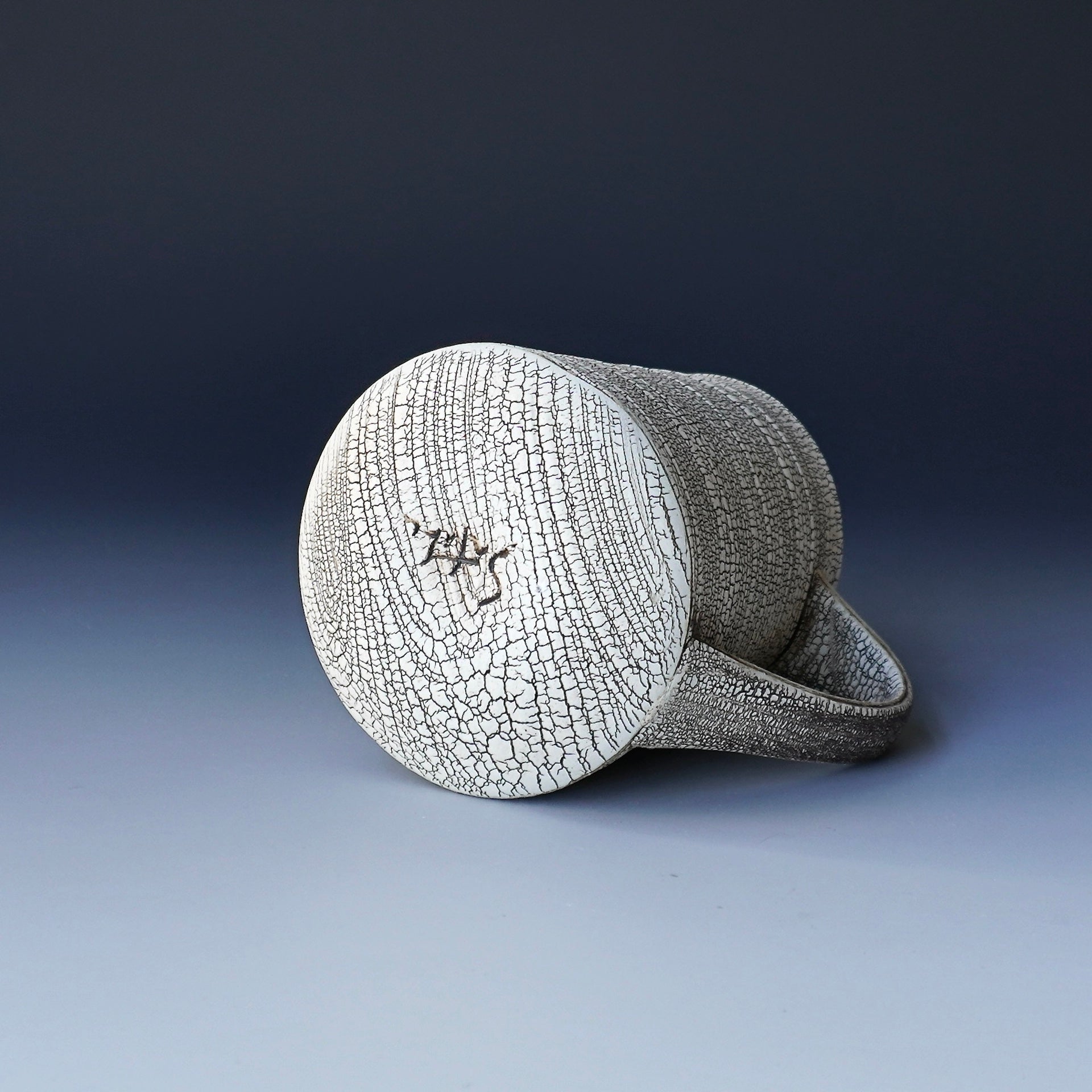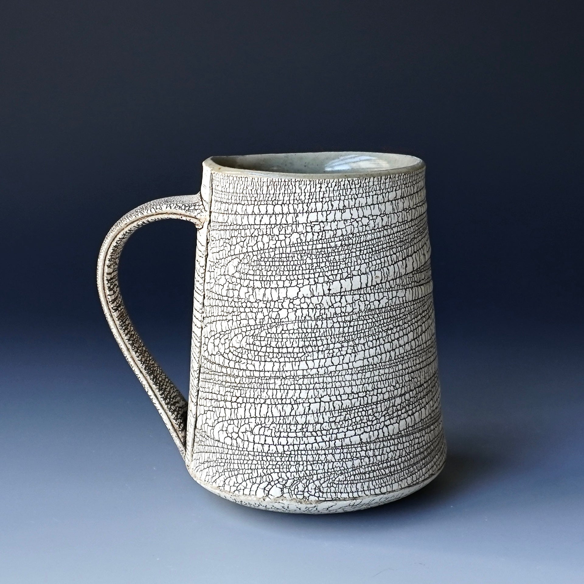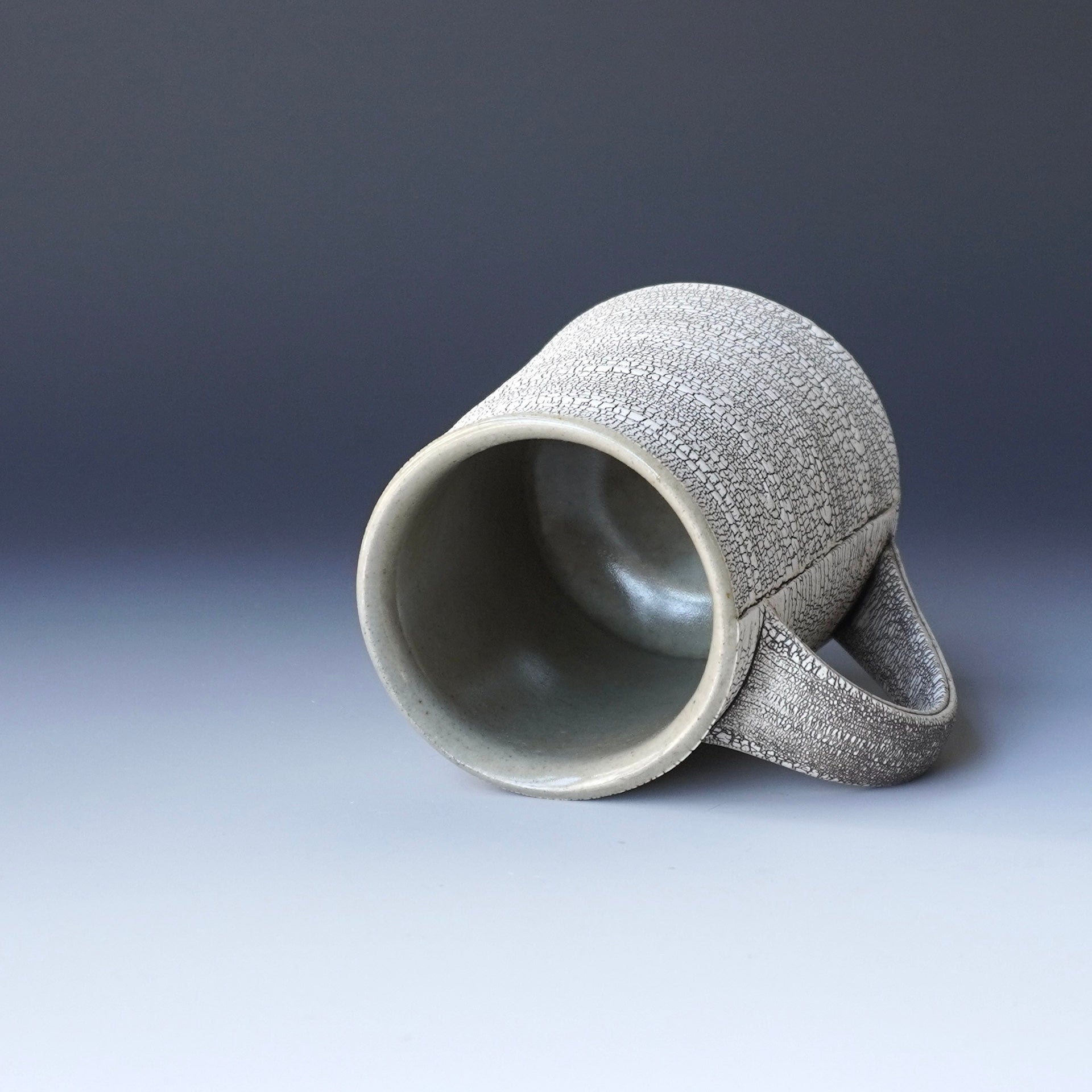 Mug cup - kohiki (white slip), liner glaze:celadon4.75 x 3.75 x 4.5 inchesholds 15 oz to brim, 13oz comfortablyhandle for three fingers