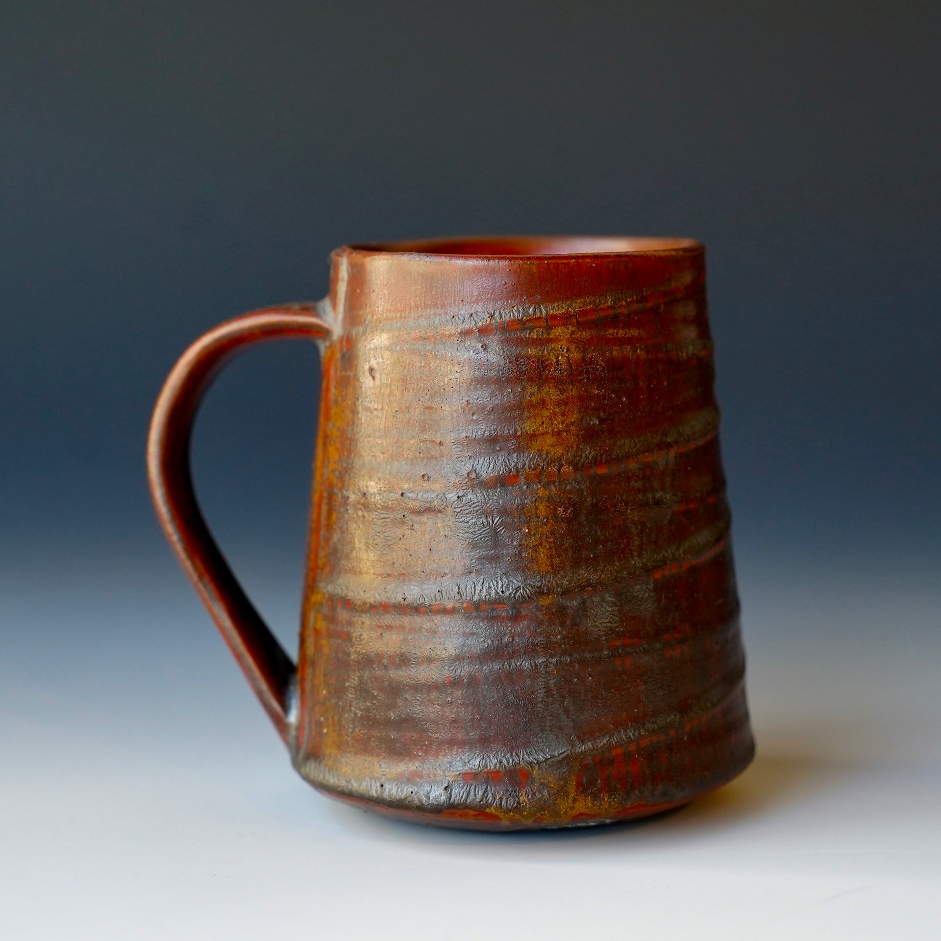 Mug cup -Beni (Red) kohiki, Kaki glaze, liner glaze : kaki, Tanka4.75 x 3.75 x 4.5 inchesholds 15 oz to brim, 13oz comfortablyhandle for three fingers