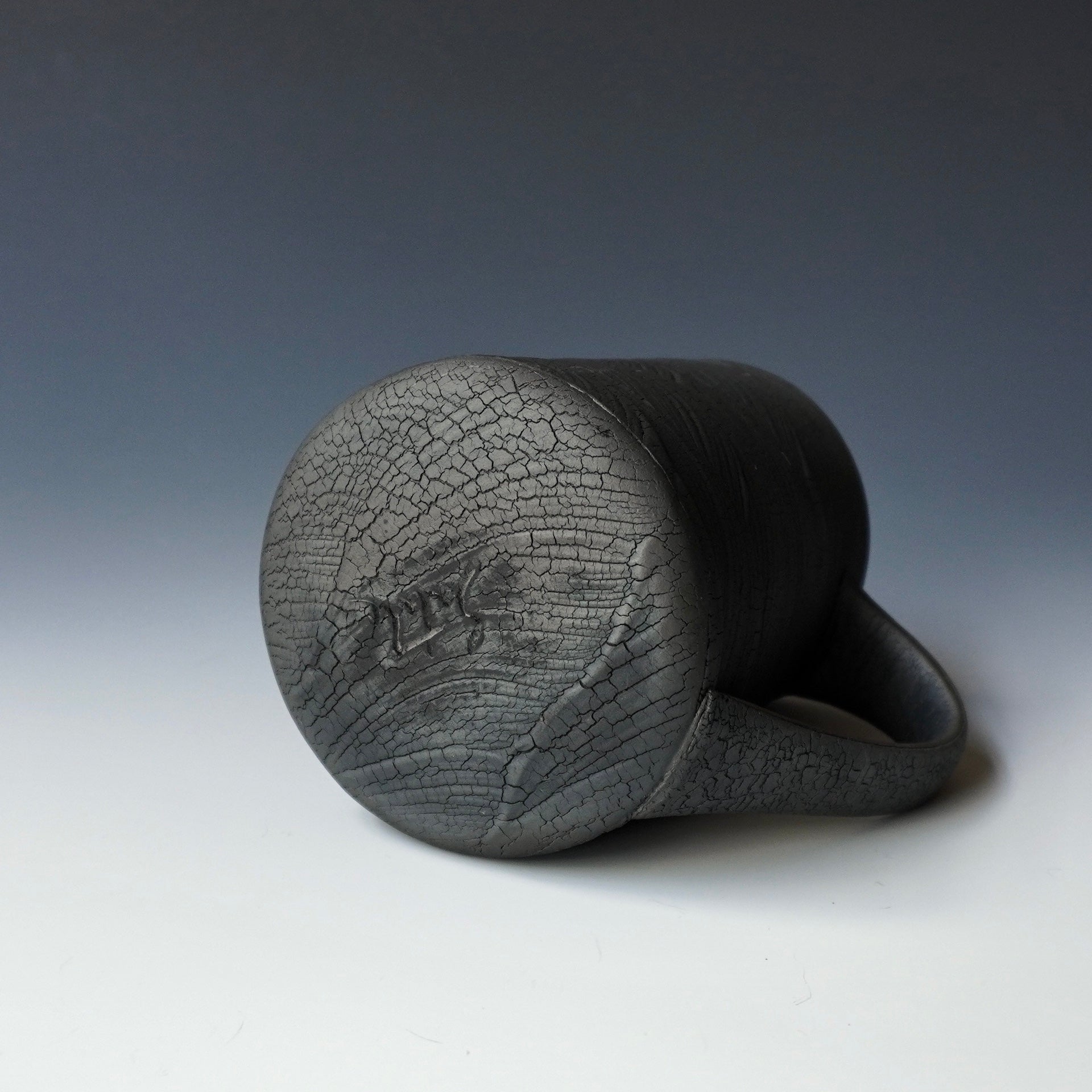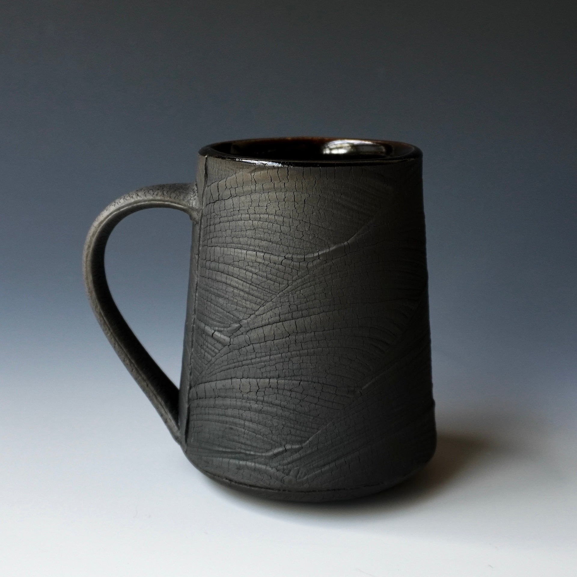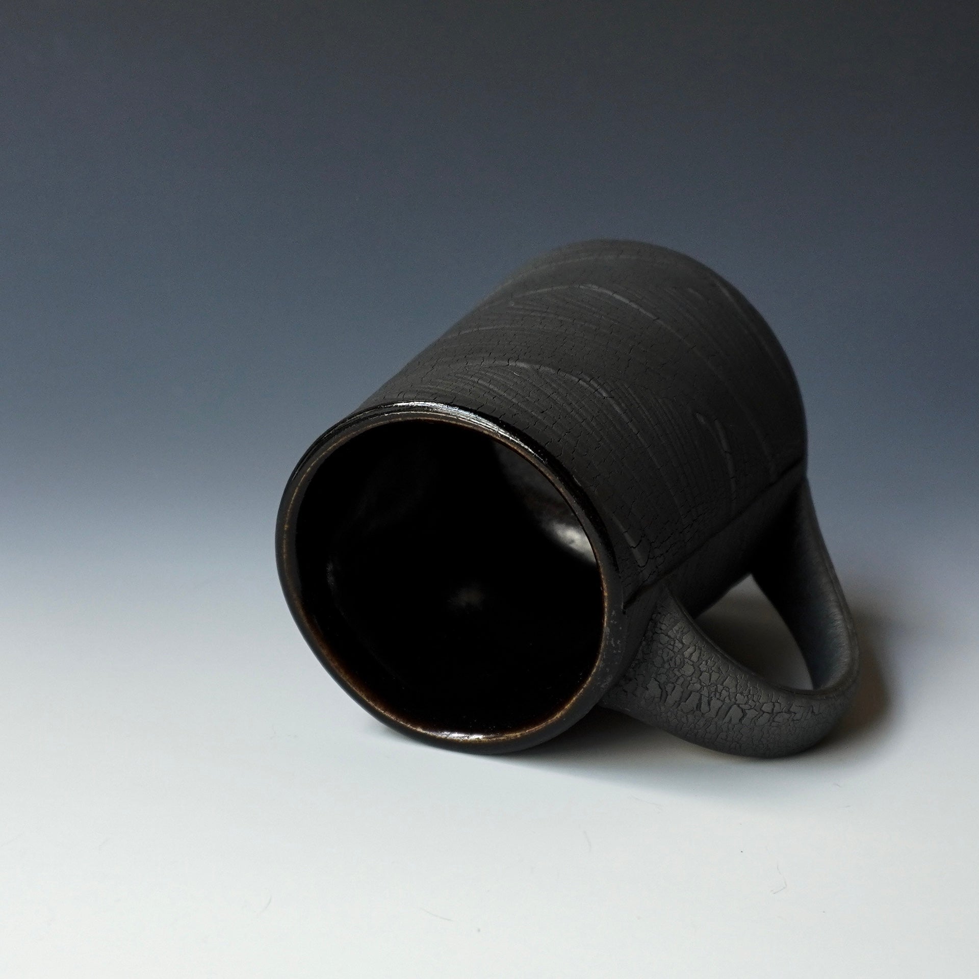 Mug cup - black kohiki, liner glaze : tenmokuThe piece is gas fired and then fired again in a sagger to create a black surface. 4.75 x 3.75 x 4.5 inchesholds 15 oz to brim, 13oz comfortablyhandle for three fingersShipping and Policy(bk-1846)