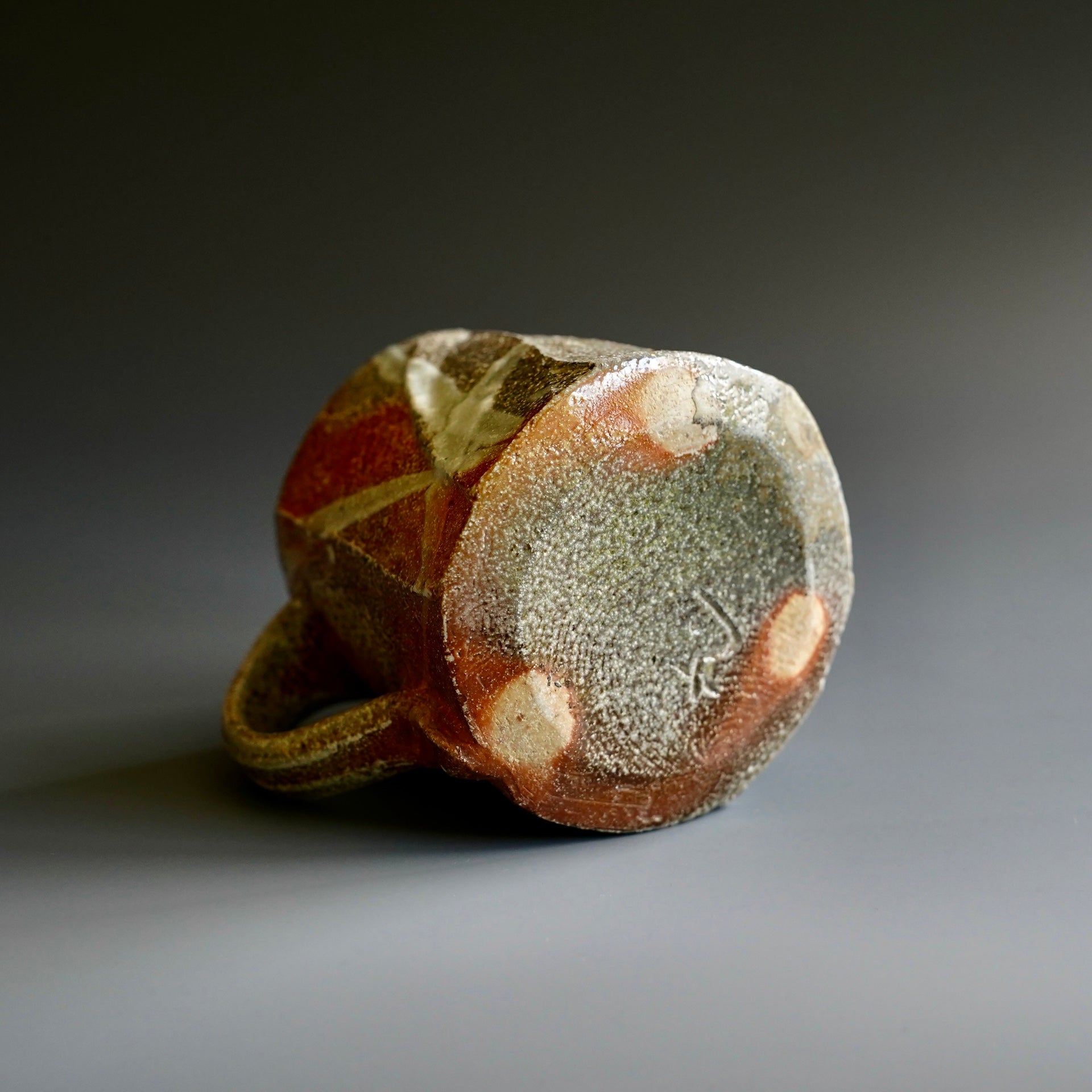 Mug - Natural wood ash, Woodfired, shino Natural wood ash: pottery surface is left unglazed and takes on color and markings during the firing from the melted wood ash4 x 4.75 x 3.75h inchesHolds 12ozShipping and Policy(m-444)