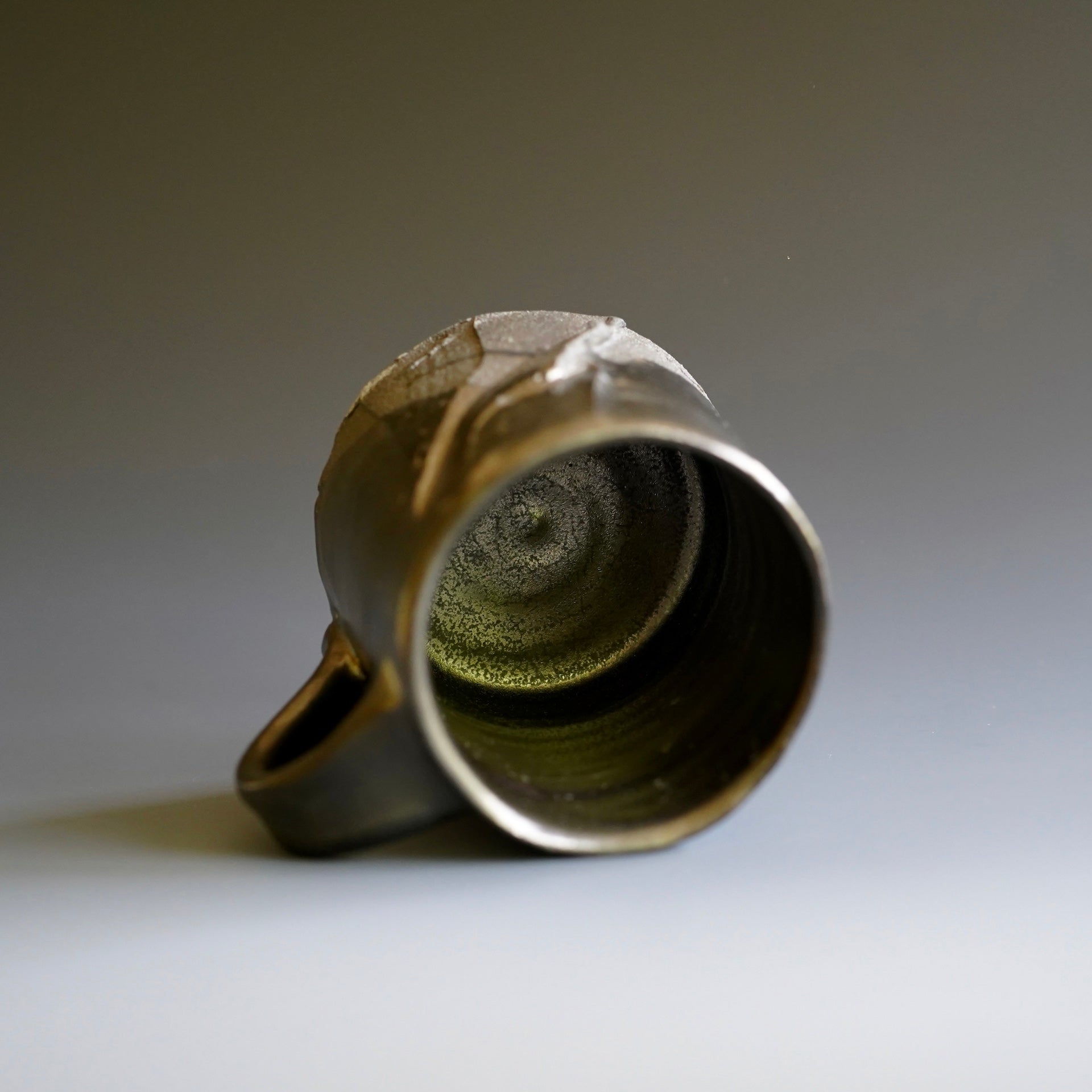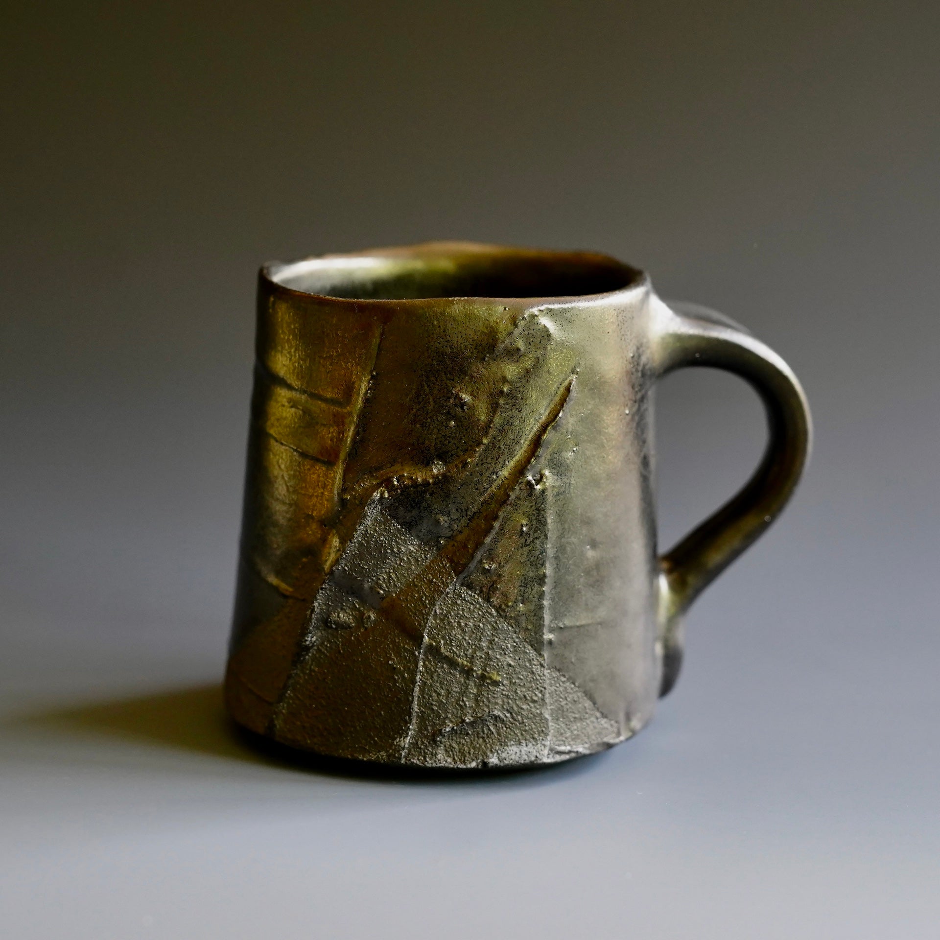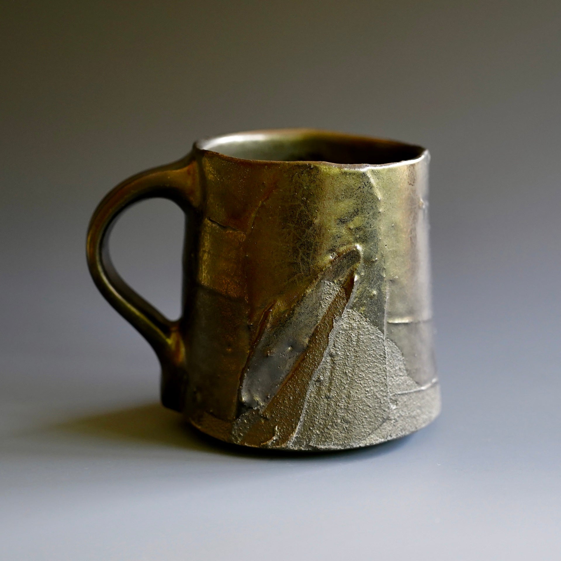 Mug - Natural wood ash, Woodfired, gold shino Natural wood ash: pottery surface is left unglazed and takes on color and markings during the firing from the melted wood ash5 x 3.75 x 3.75h inchesHolds 13ozShipping and Policy(m-434w)
