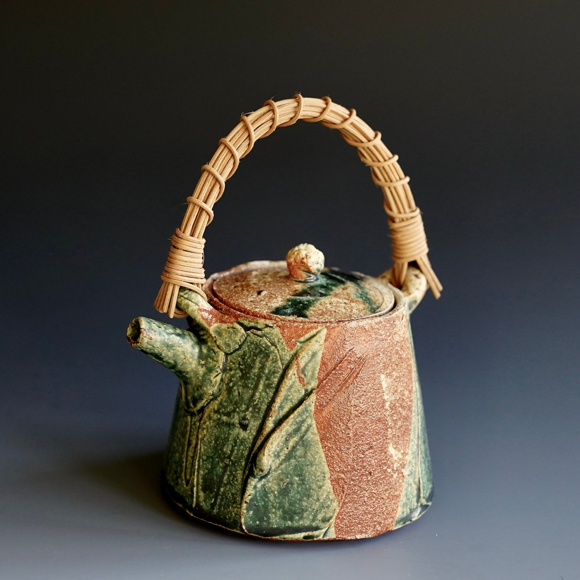 Teapot - Natural wood ash with oribe glaze, WoodfiredNatural wood ash: pottery surface is left unglazed and takes on color and markings during the firing from the melted wood ash4.75 x 4.75 x 7h inches , holds 13ozShipping and Policy(tp-129)