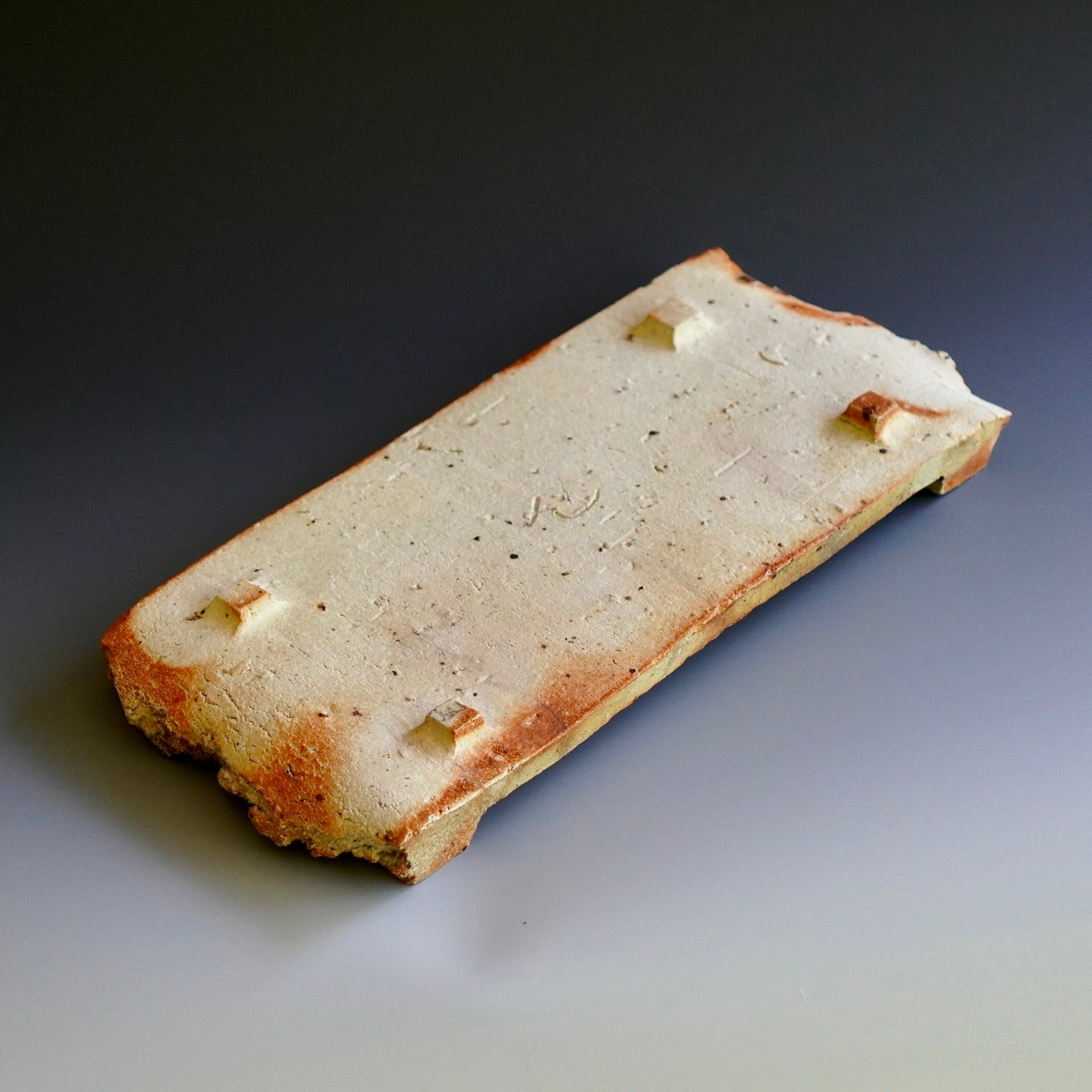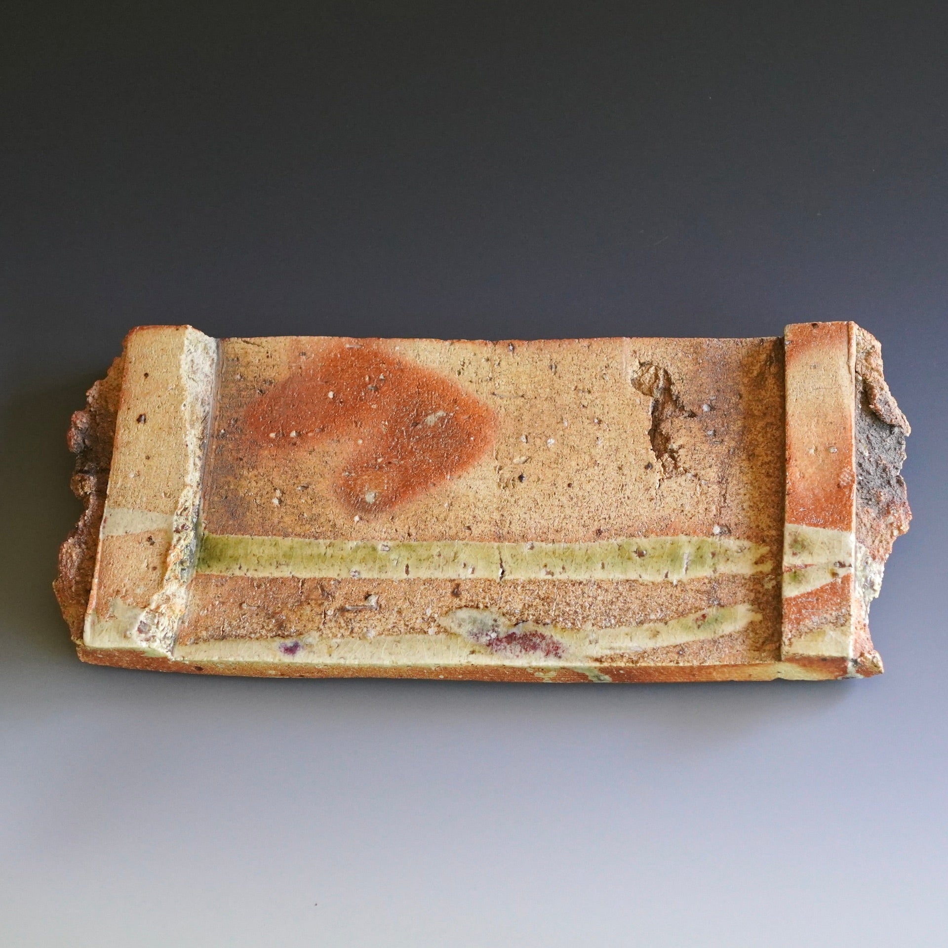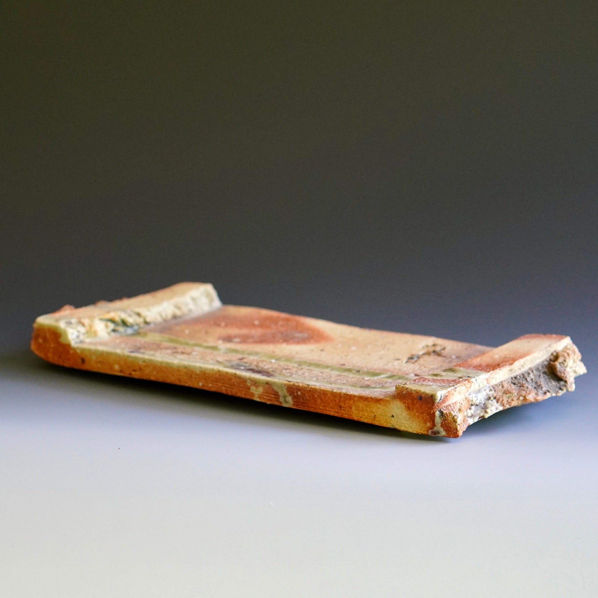 Sculpture - Natural wood ash, Woodfired, Oribe glazeNatural wood ash: pottery surface is left unglazed and takes on color and markings during the firing from the melted wood ash12.5 x 4.25 x 1.25h inchesShipping and Policy(w-501)
