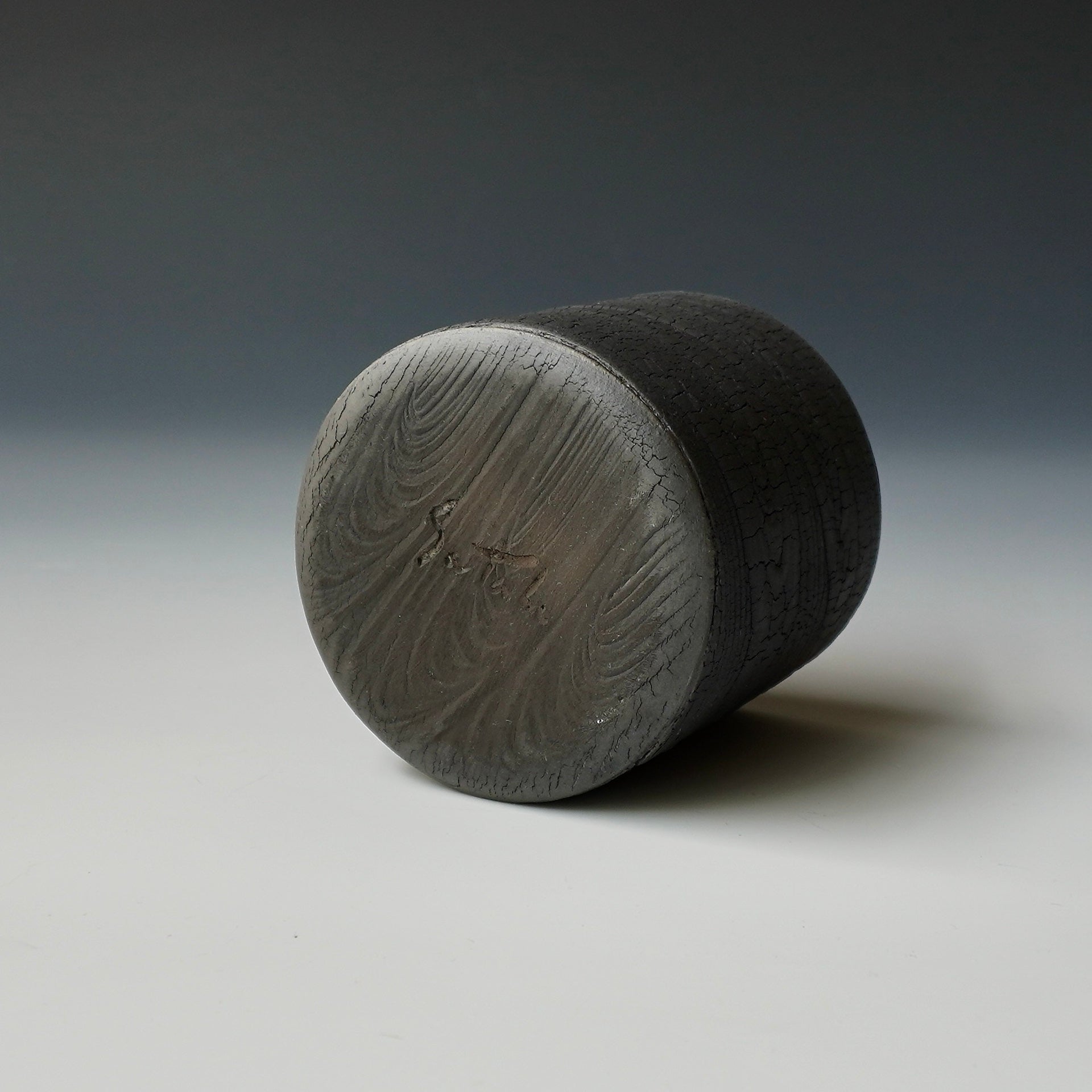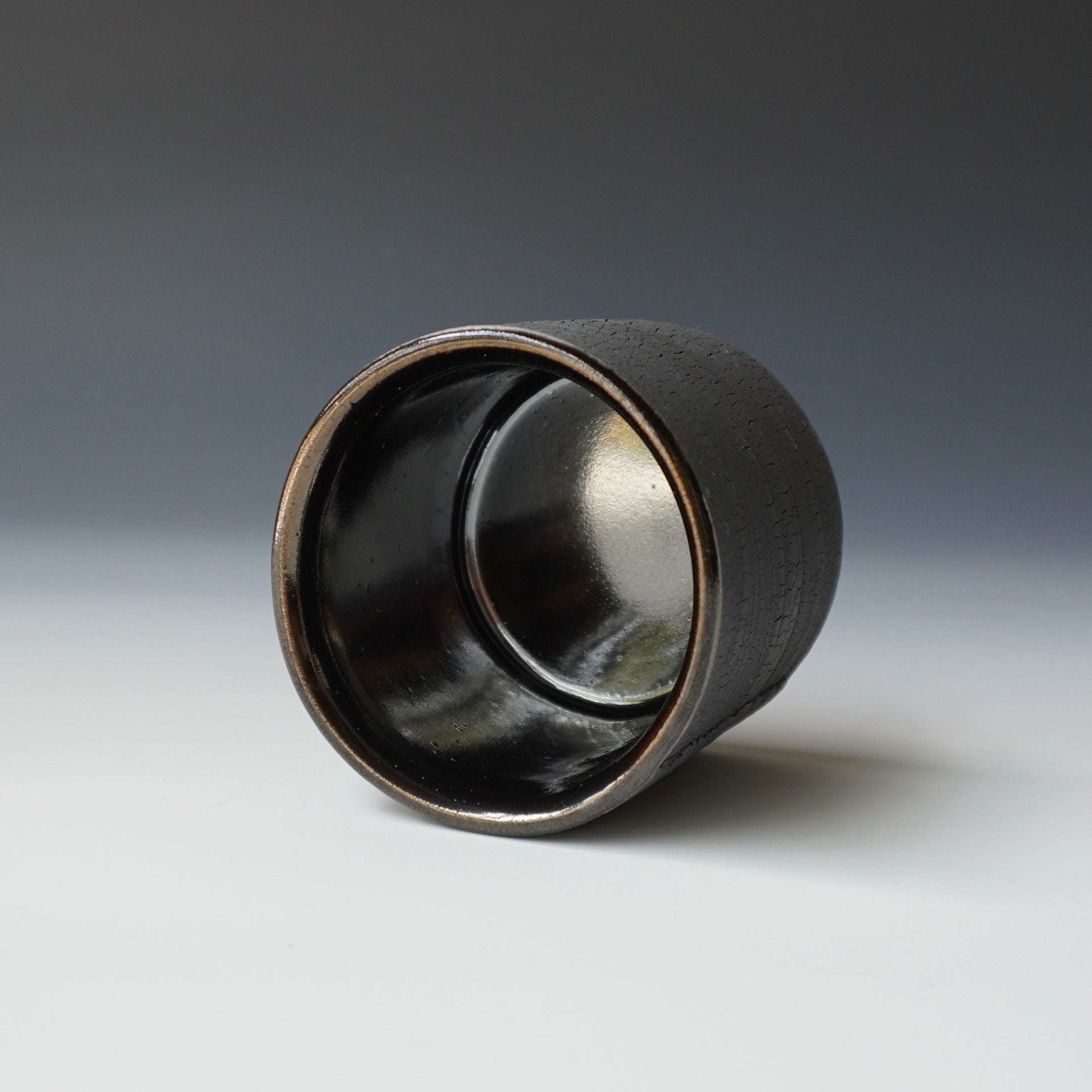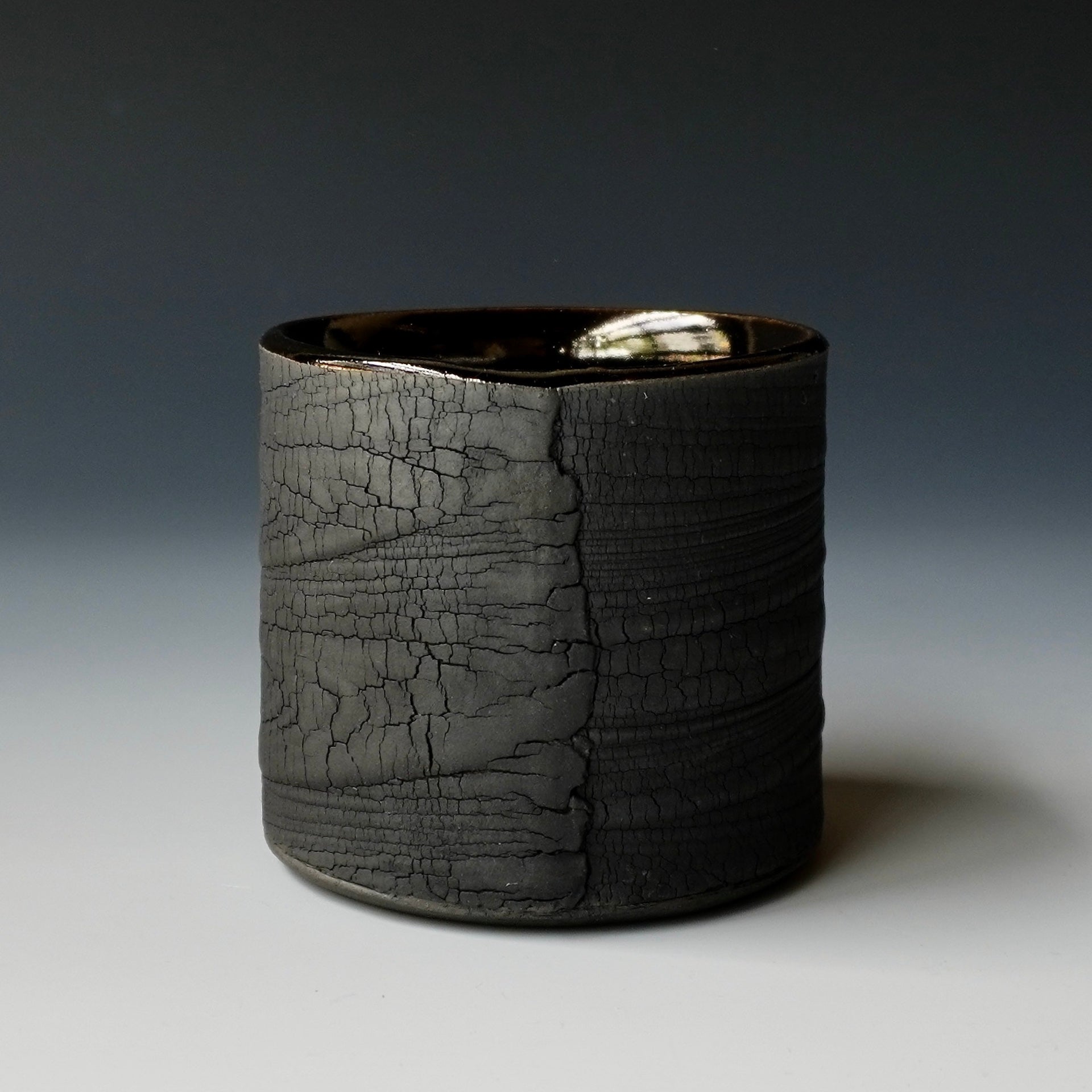 Cup -kohiki (white slip), black kohiki, liner glaze : tenmokuThe piece is gas fired and then fired again in a sagger to create a black surface. 3.25 x 3.25 x 2.75 inches, Holds 6 oz