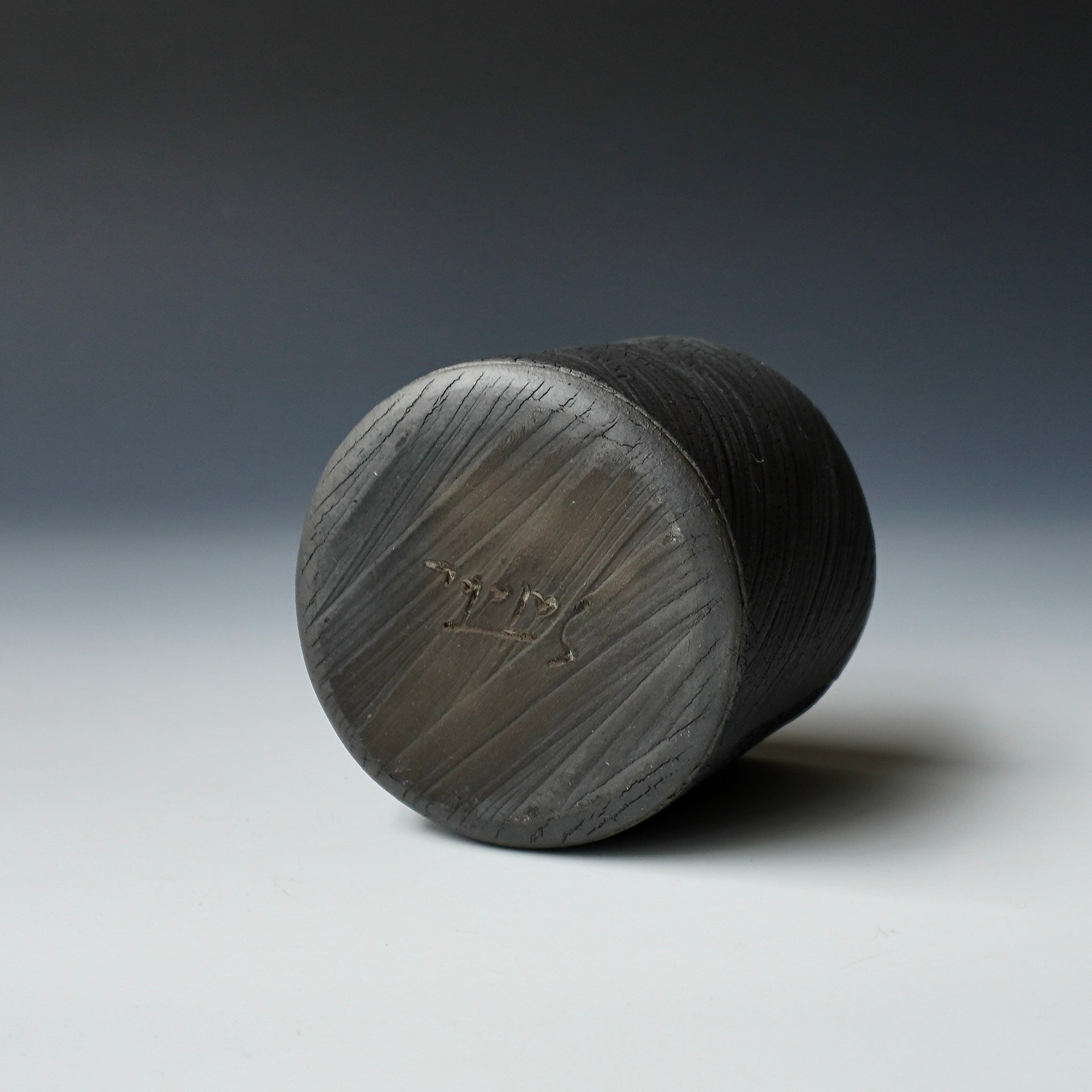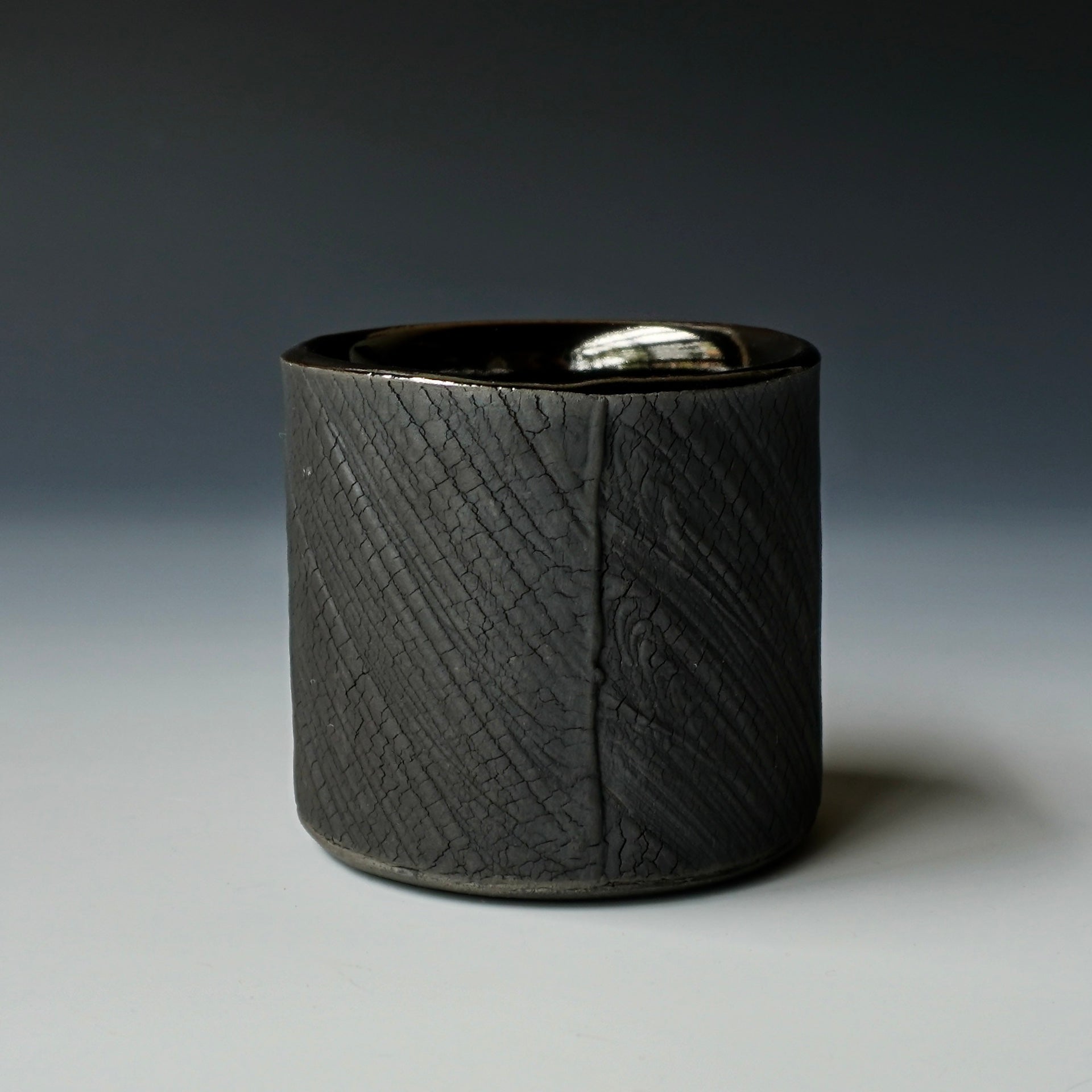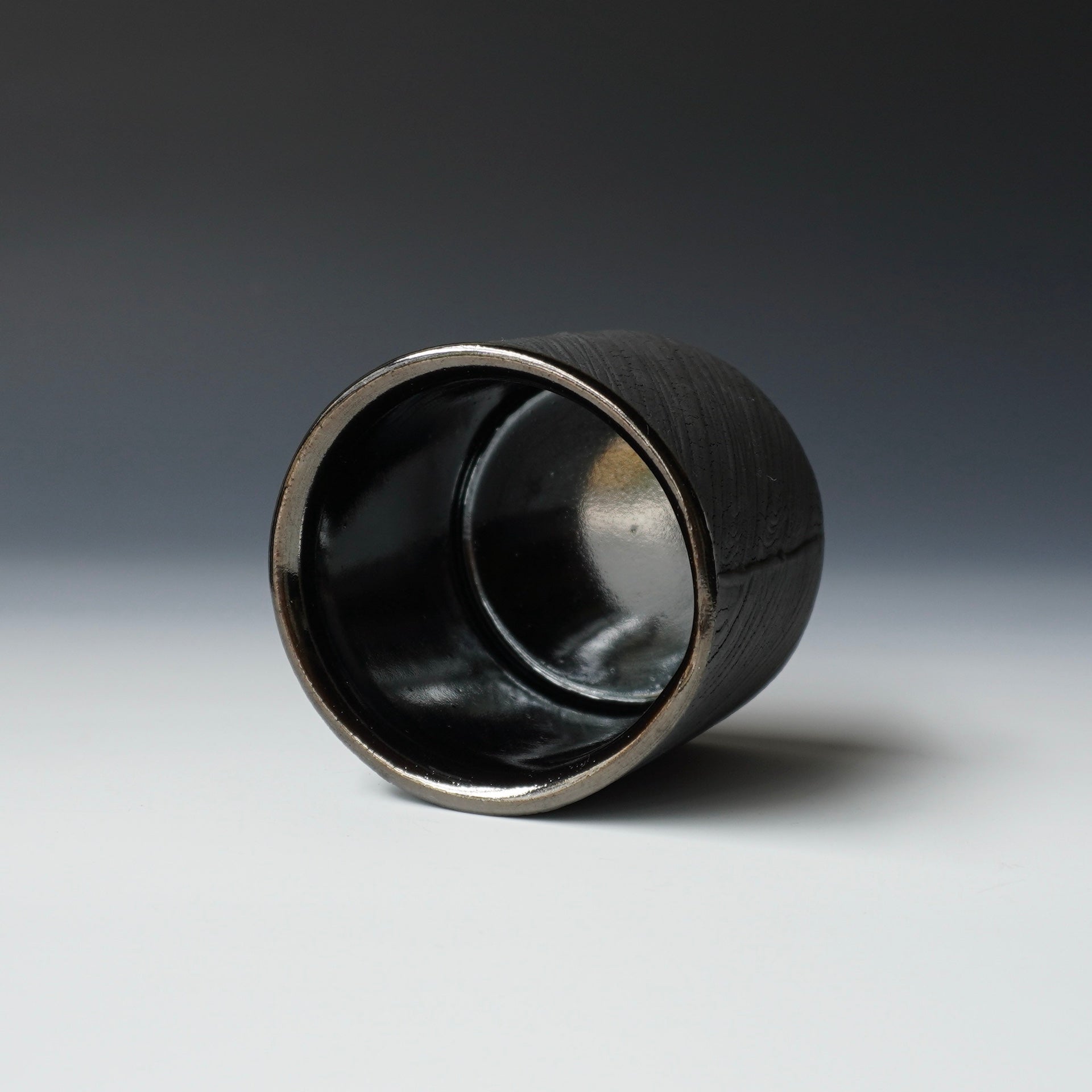 Cup -kohiki (white slip), black kohiki, liner glaze : tenmokuThe piece is gas fired and then fired again in a sagger to create a black surface. 3.25 x 3.25 x 2.75 inches, Holds 6 oz