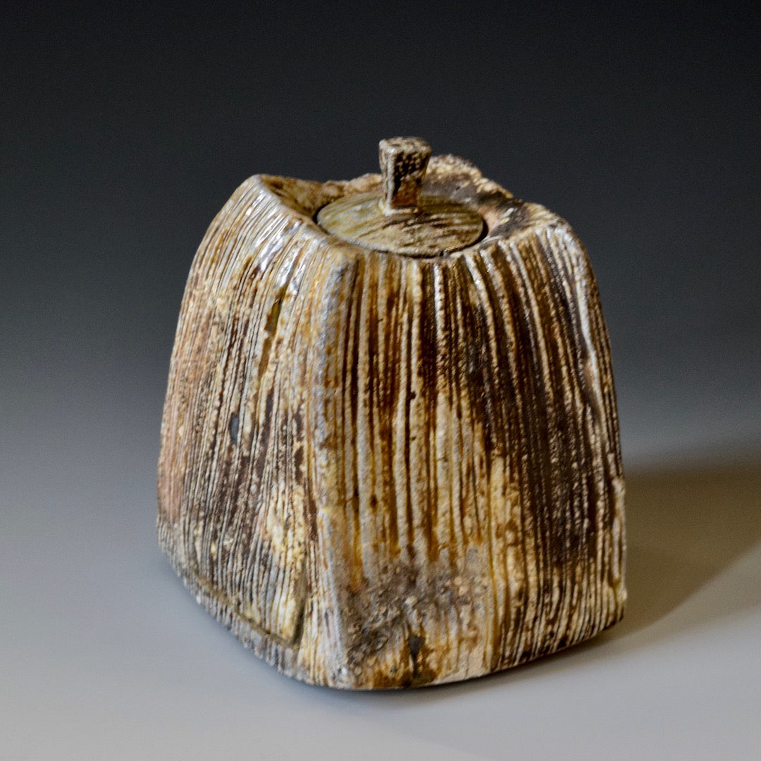 Llidded jar - natural wood ash, woodfiredNatural wood ash: pottery surface is left unglazed and takes on color and markings during the firing from the melted wood ash4.5 x 5 x 6.5h inches