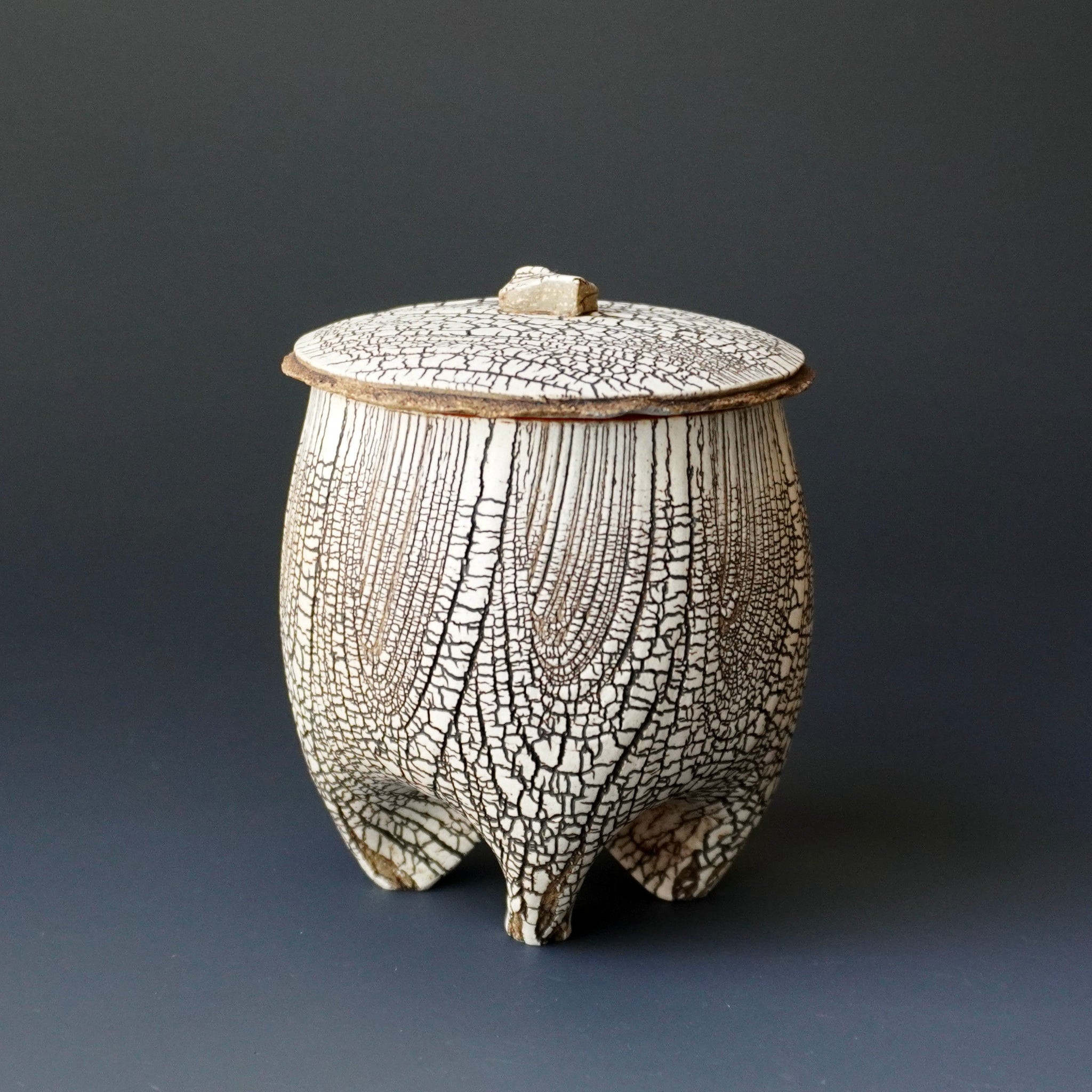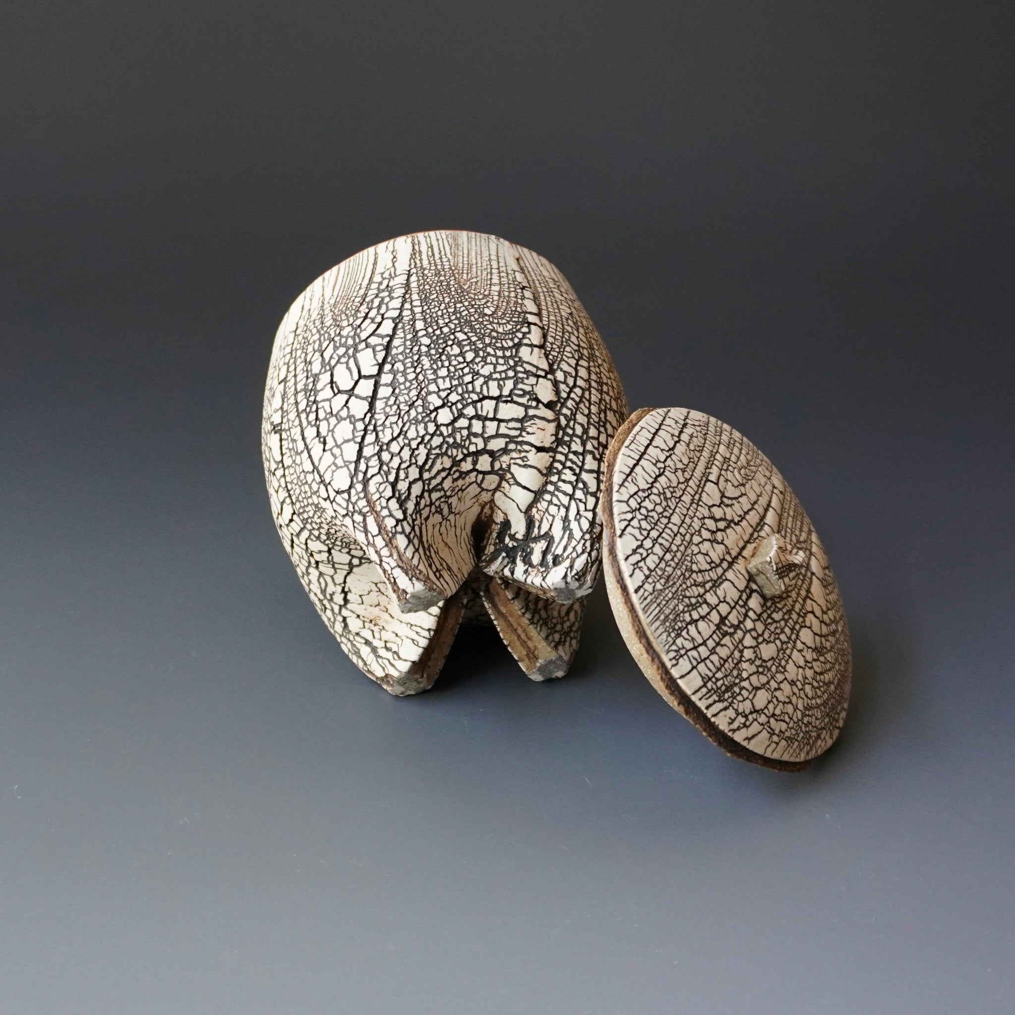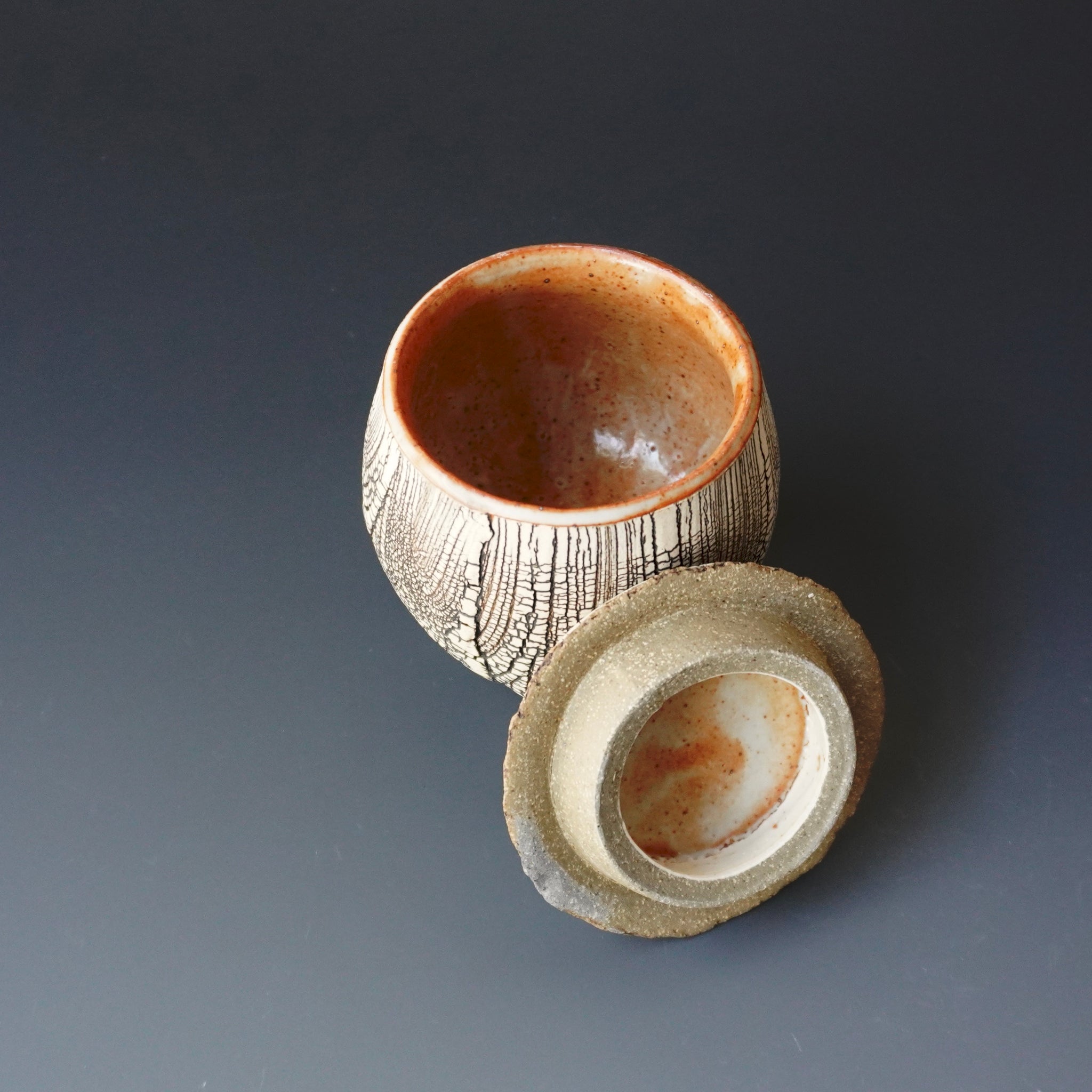 Lidded tea cup- kohiki (white slip), liner glaze : shino3 x 3 x 3.75h inches, Holds 6ozShipping and Policy(k-7139)