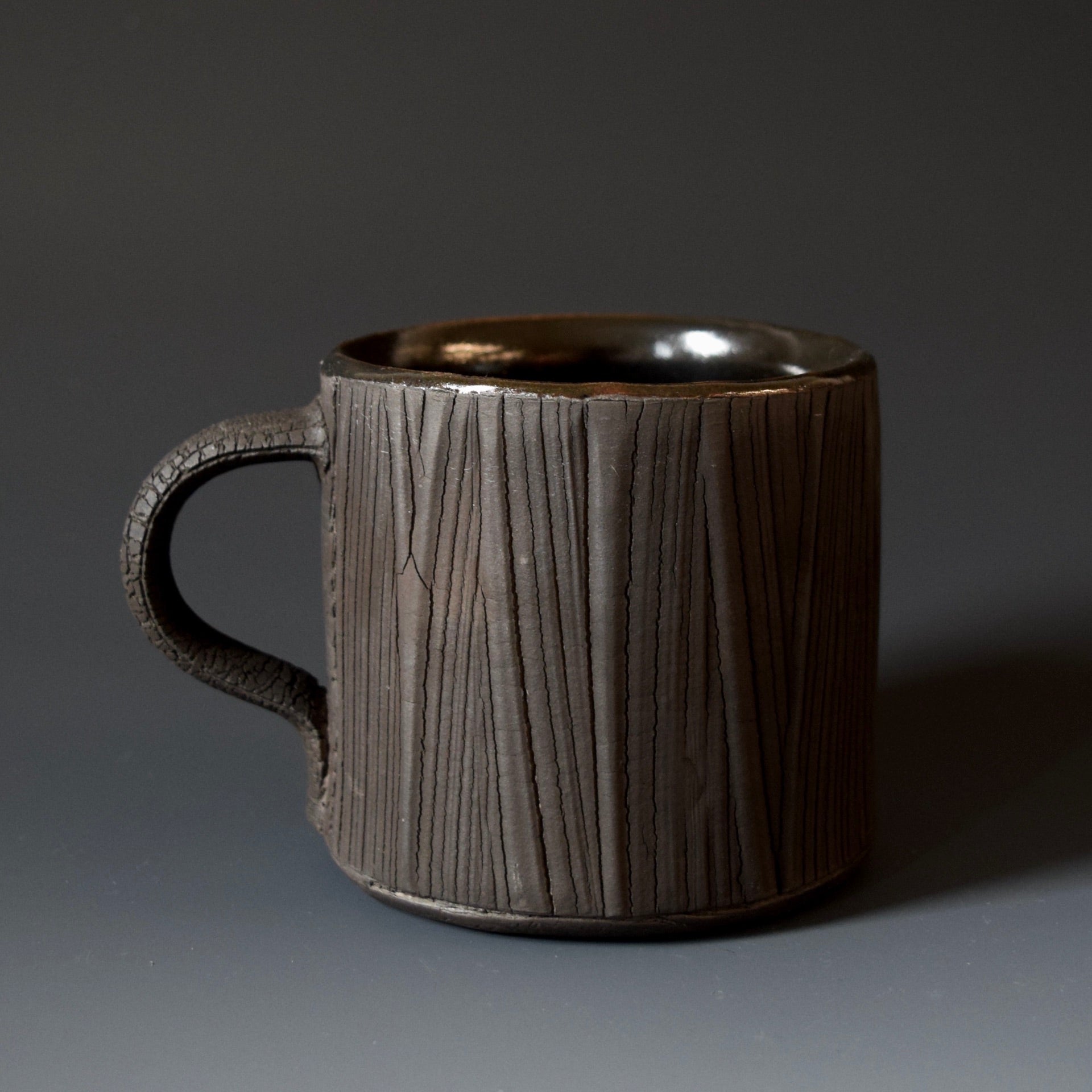 Mug cup -black kohiki, liner glaze : tenmokuThe piece is gas fired and then fired again in a sagger to create a black surface. 4.5 x 3 x 2.75 inches, holds 7 oz