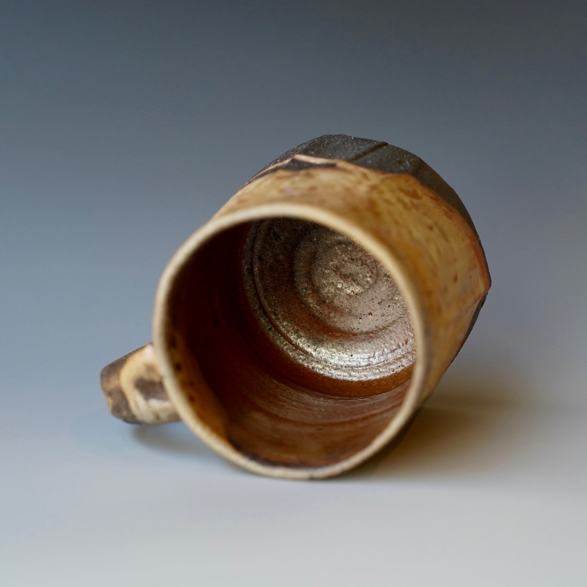 Mug - Natural wood ash, Woodfired, Shino glazeNatural wood ash: pottery surface is left unglazed and takes on color and markings during the firing from the melted wood ash4.5 x 3.5 x 3.5h inchesHolds 10ozShipping and Policy(m-326)