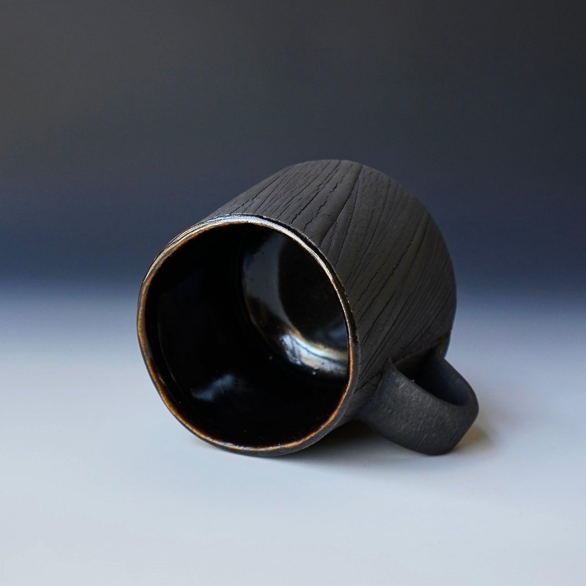 Mug cup - black kohiki, liner glaze : tenmokuThe piece is gas fired and then fired again in a sagger to create a black surface. 5 x 4 x 3.75h inchesholds 16 oz to the brim, 12.5oz comfortablyhandle for one fingerShipping and Policy(bk-1858a)