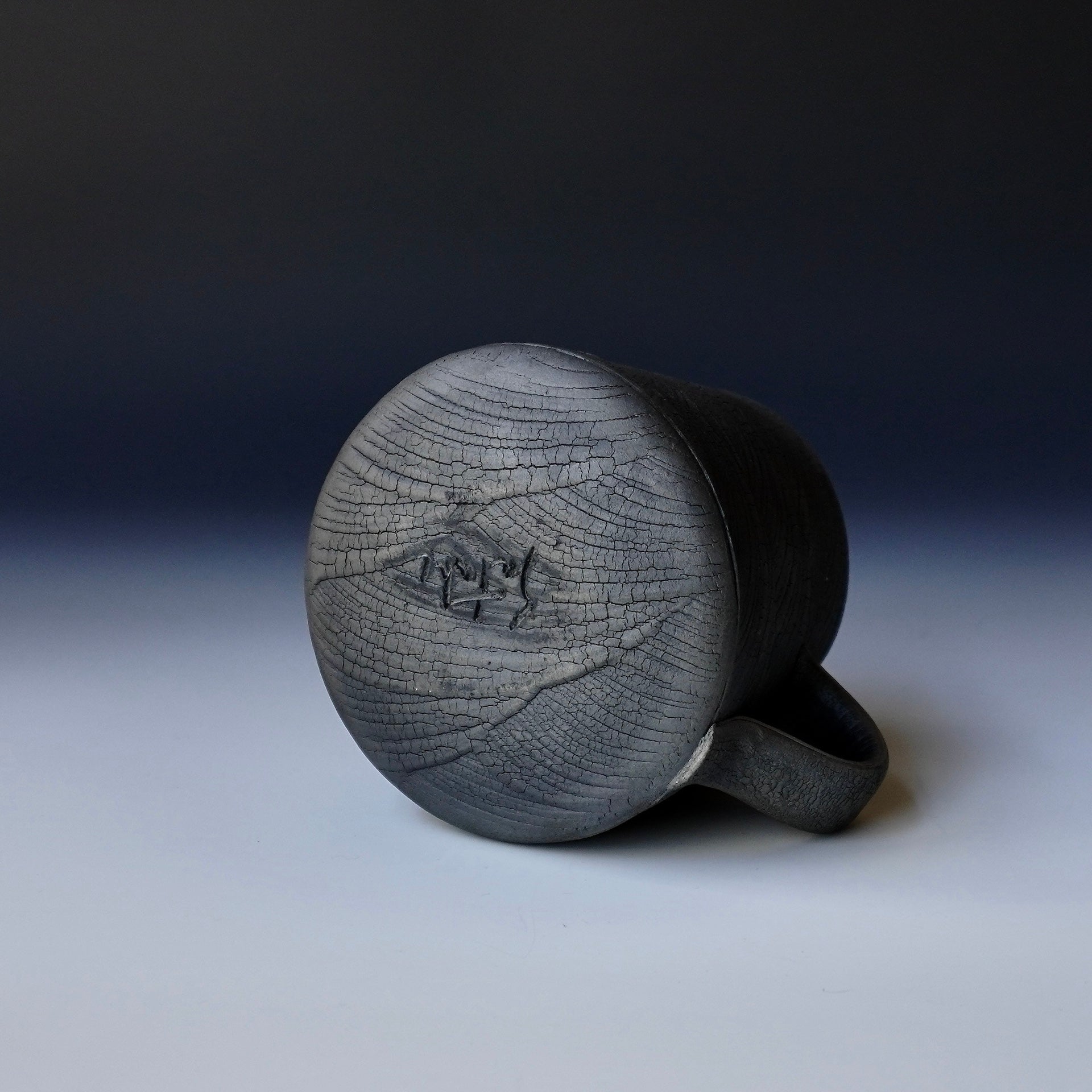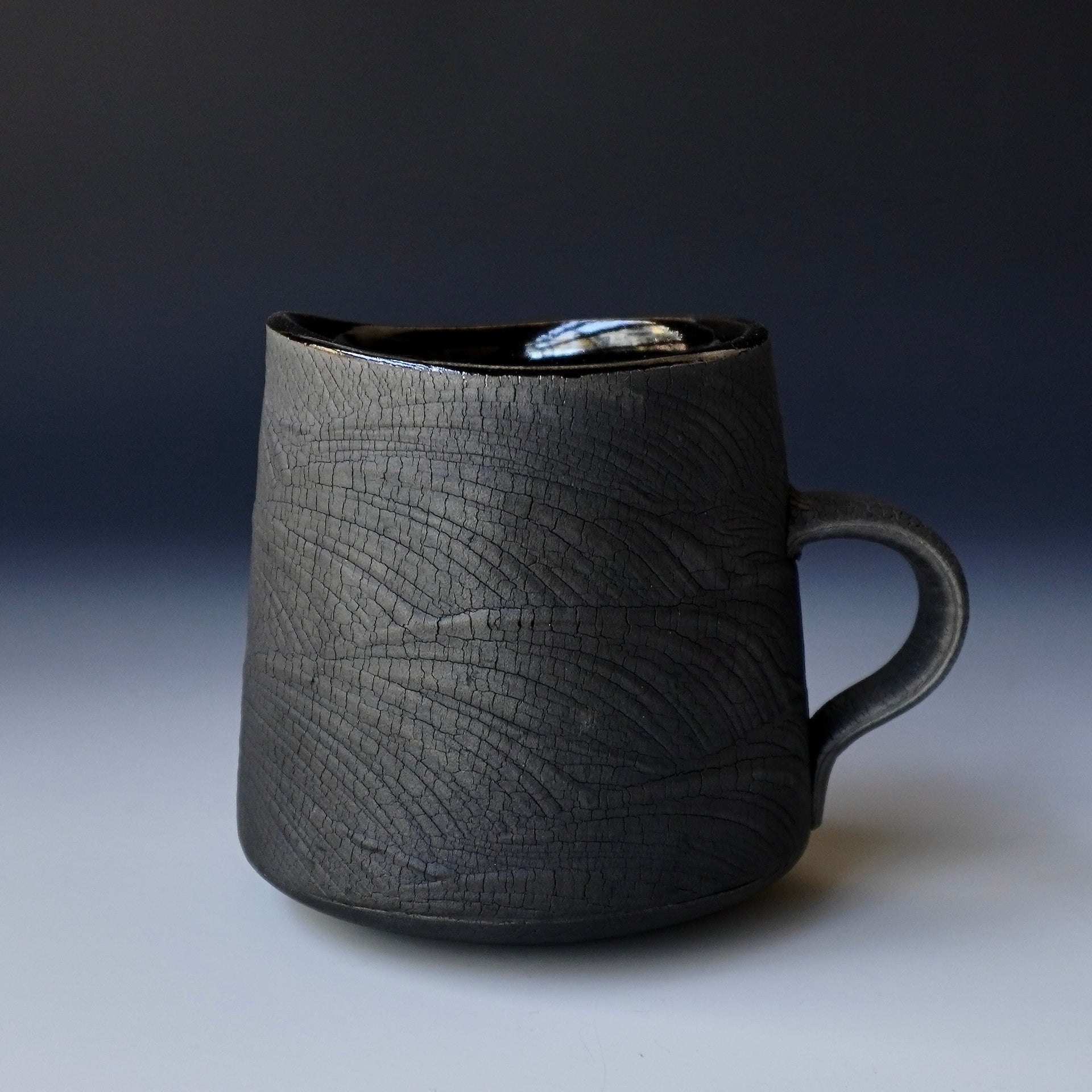 The piece is gas fired and then fired again in a sagger to create a black surface.