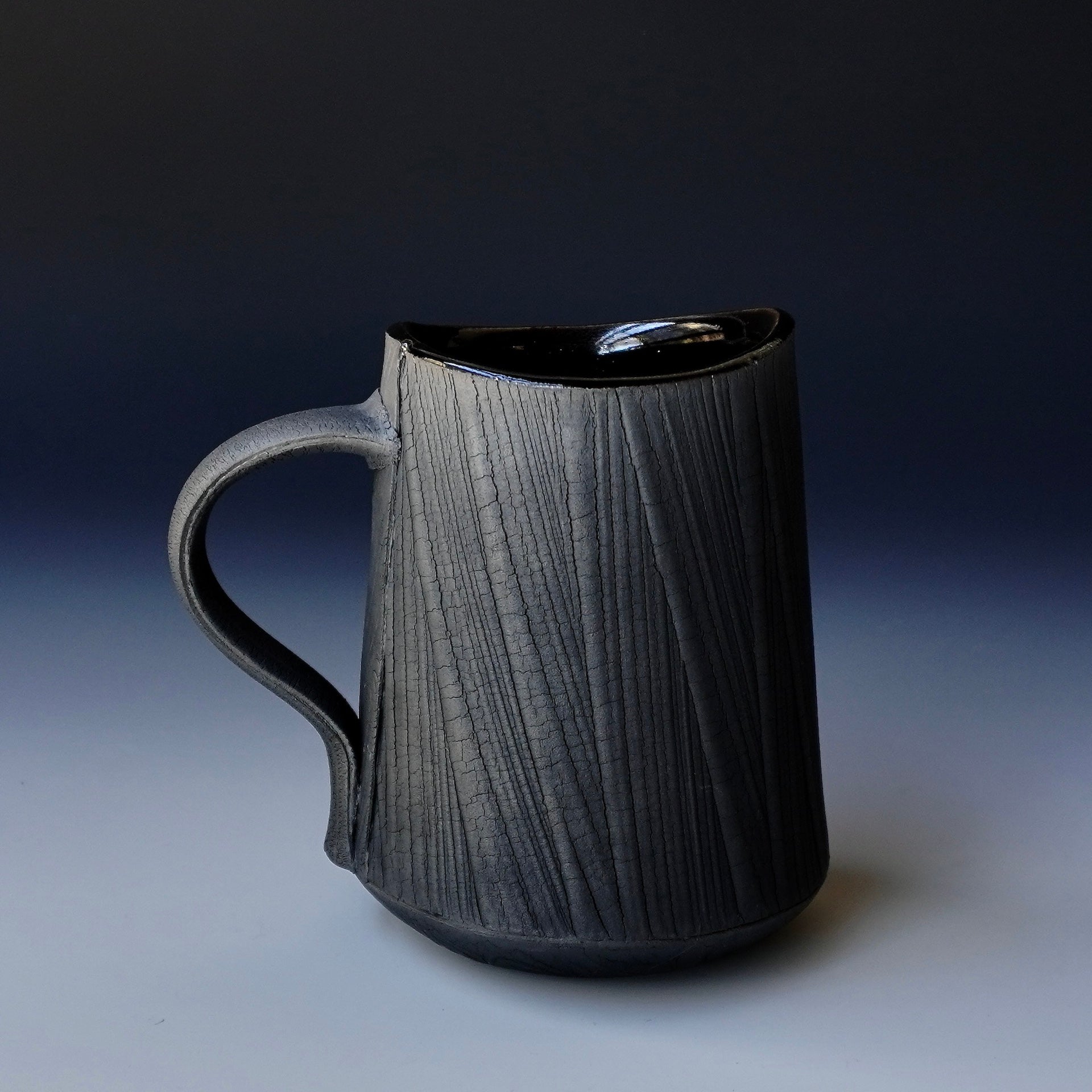 The piece is gas fired and then fired again in a sagger to create a black surface.