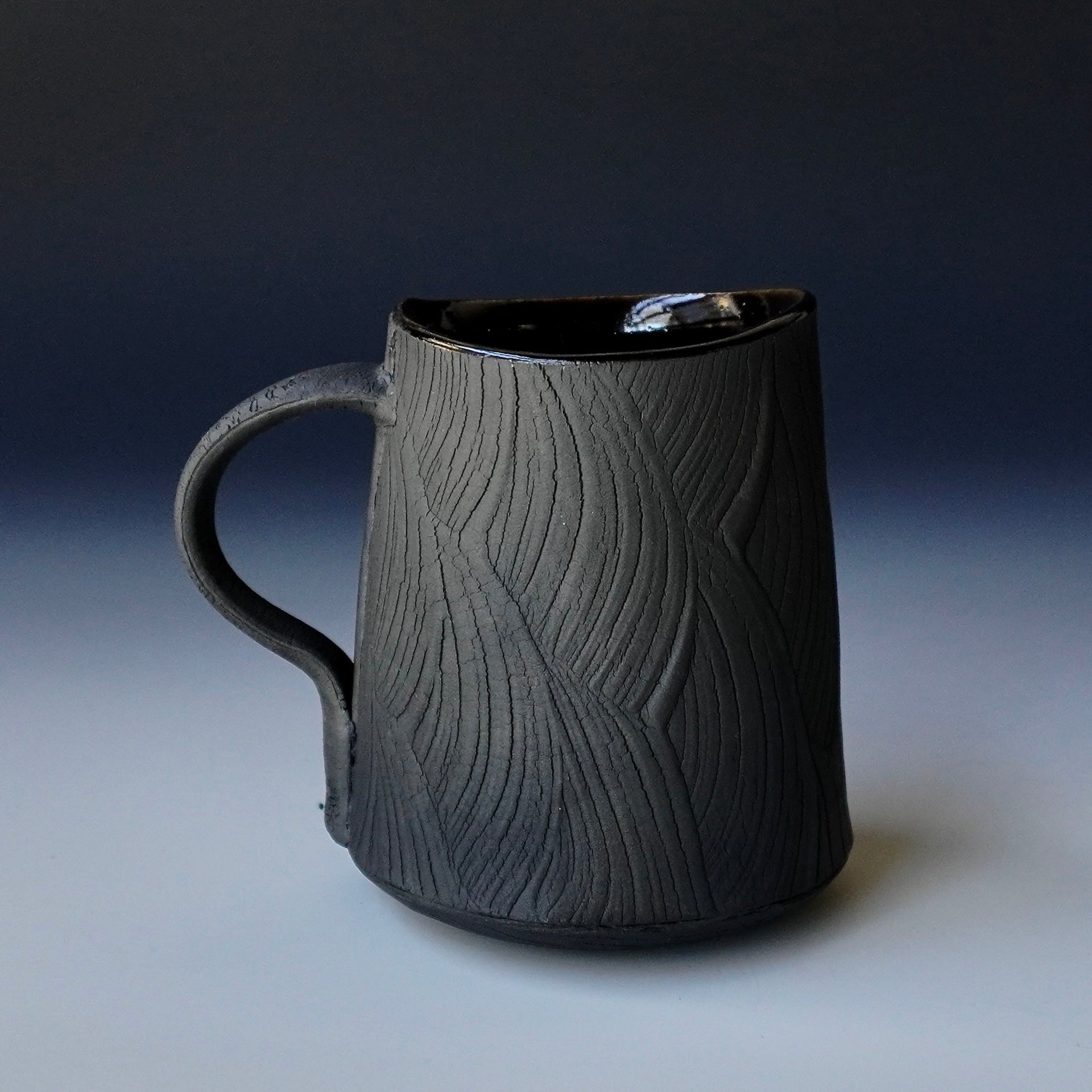 The piece is gas fired and then fired again in a sagger to create a black surface.