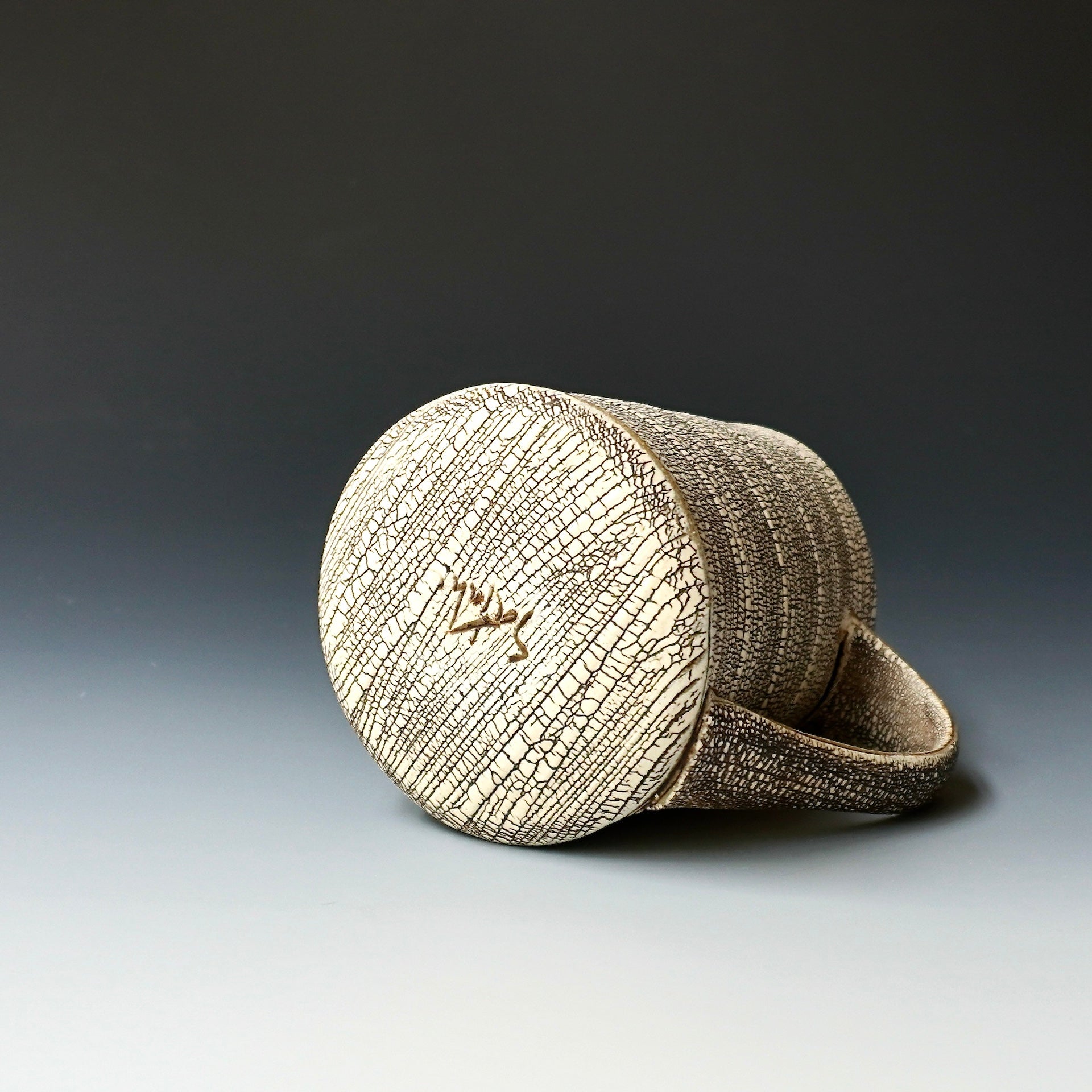 Mug cup - kohiki (white slip), liner glaze: celadon4.75 x 3.75 x 4.5 inchesholds 15 oz to brim, 13oz comfortablyhandle for three fingers