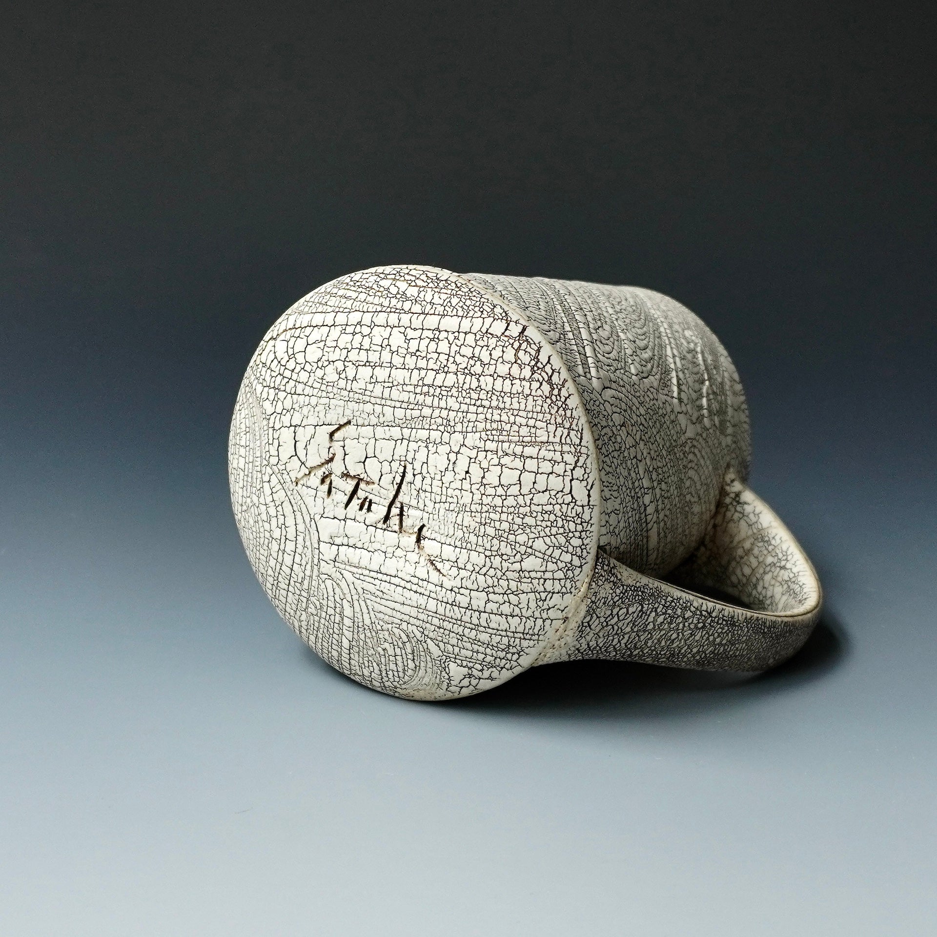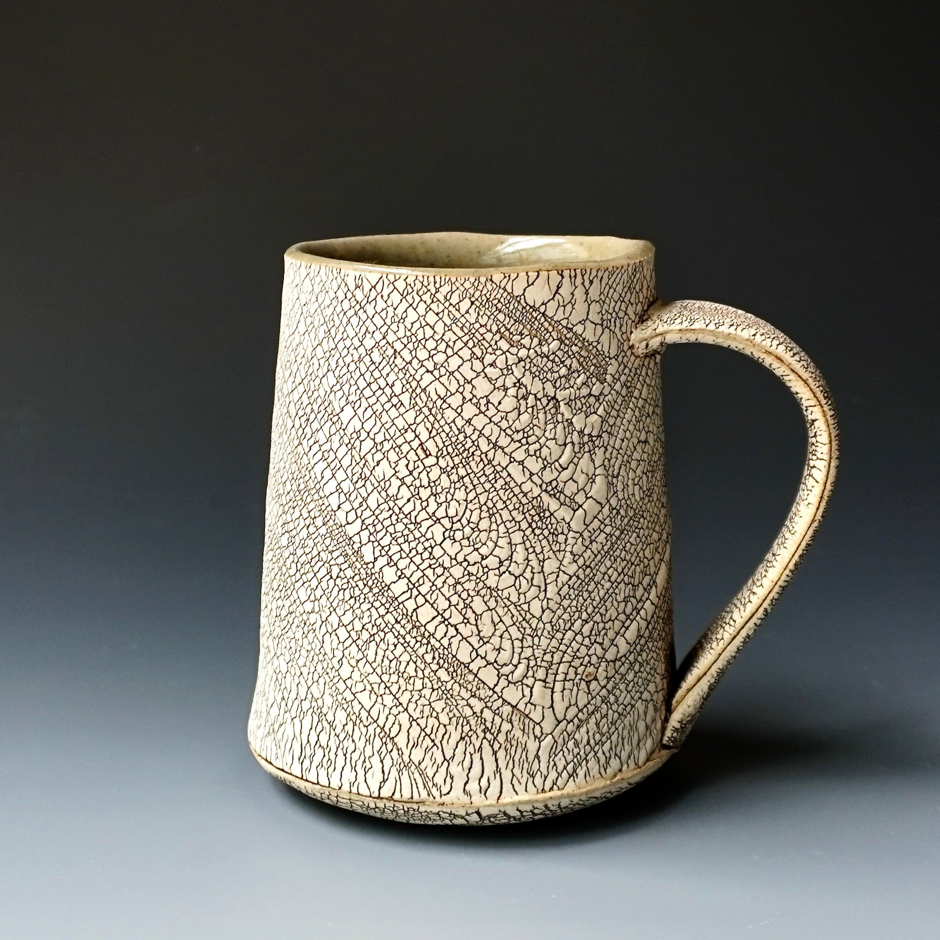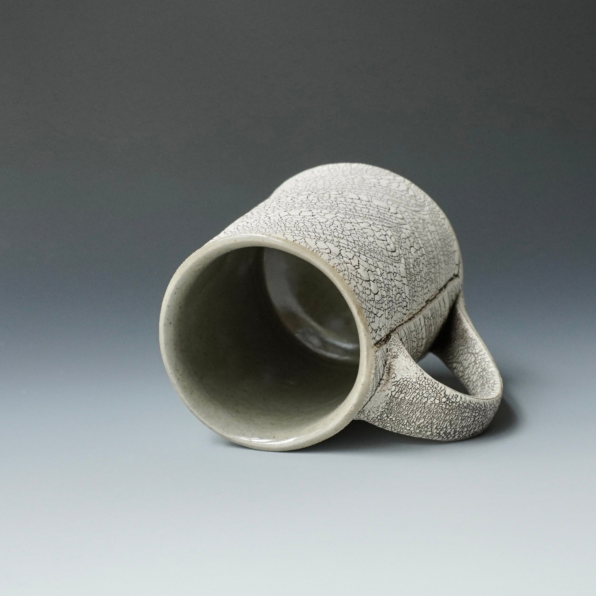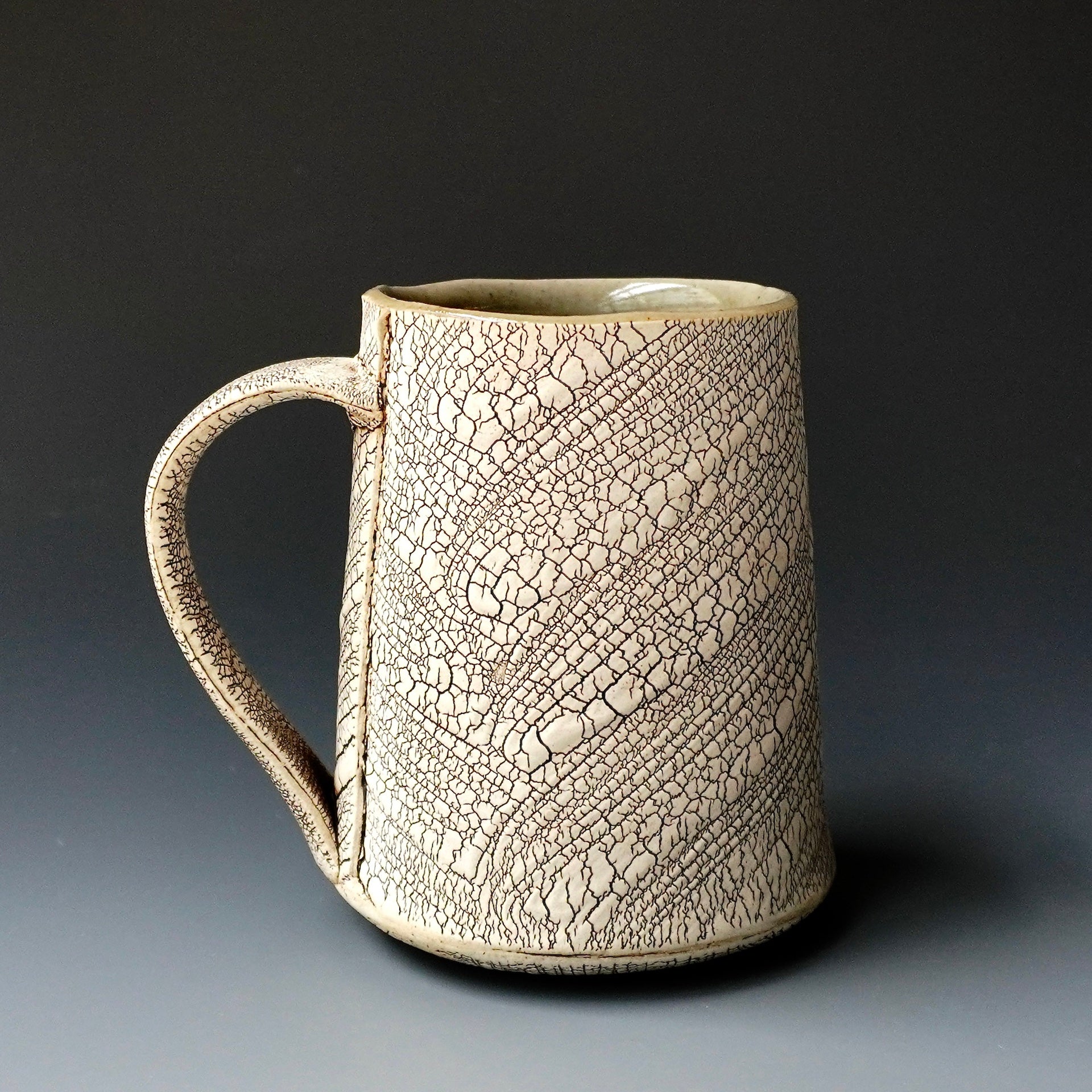 Mug cup - kohiki (white slip), liner glaze: celadon4.75 x 3.75 x 4.5 inchesholds 15 oz to brim, 13oz comfortablyhandle for three fingers