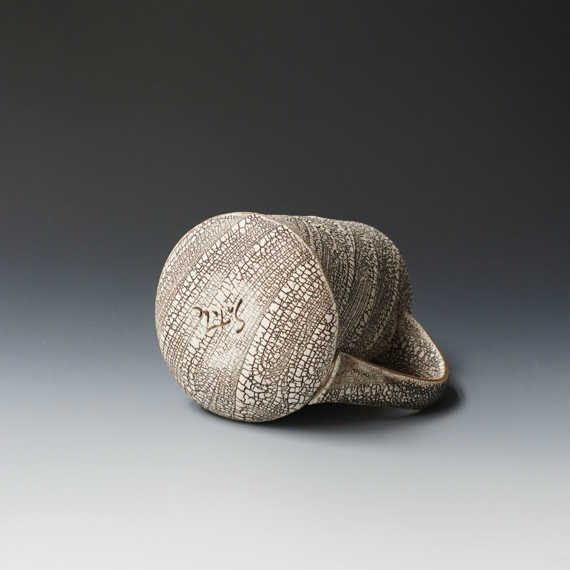 Mug cup - kohiki (white slip), liner glaze:celadon4.75 x 3.75 x 4.5 inchesholds 15 oz to brim, 13oz comfortablyhandle for three fingers