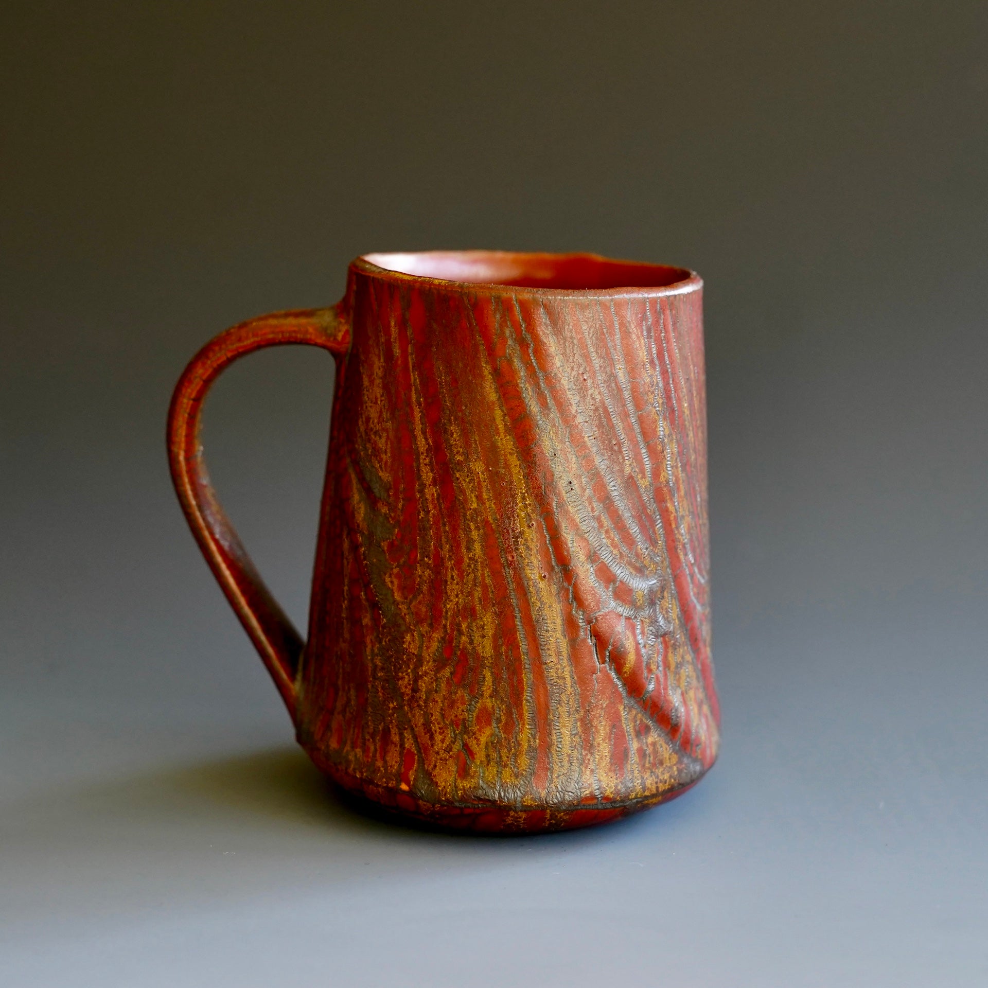 Mug cup -Beni (Red) kohiki, Kaki glaze, liner glaze : kaki, Tanka4.75 x 3.75 x 4.5 inchesholds 15 oz to brim, 13oz comfortablyhandle for three fingers