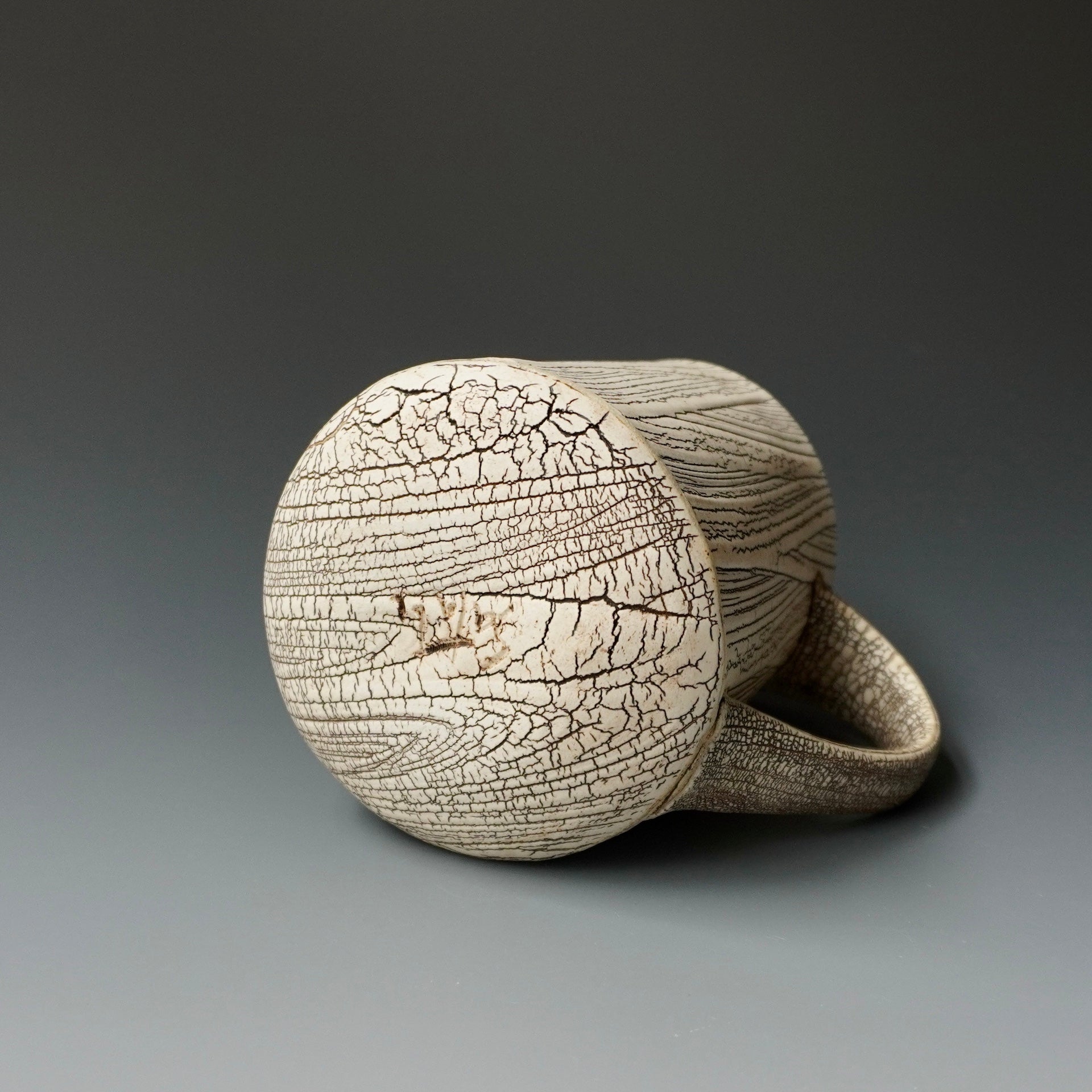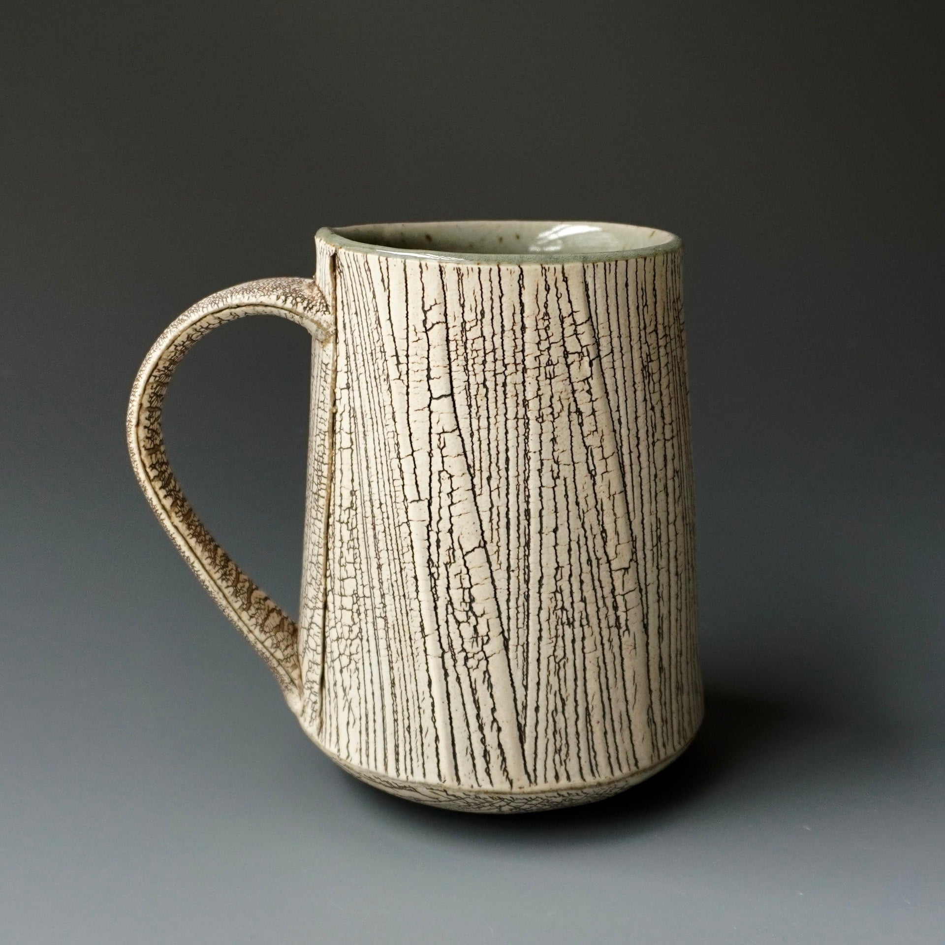 Mug cup - kohiki (white slip), liner glaze: celadon4.75 x 3.75 x 4.5 inchesholds 15 oz to brim, 13oz comfortablyhandle for three fingers