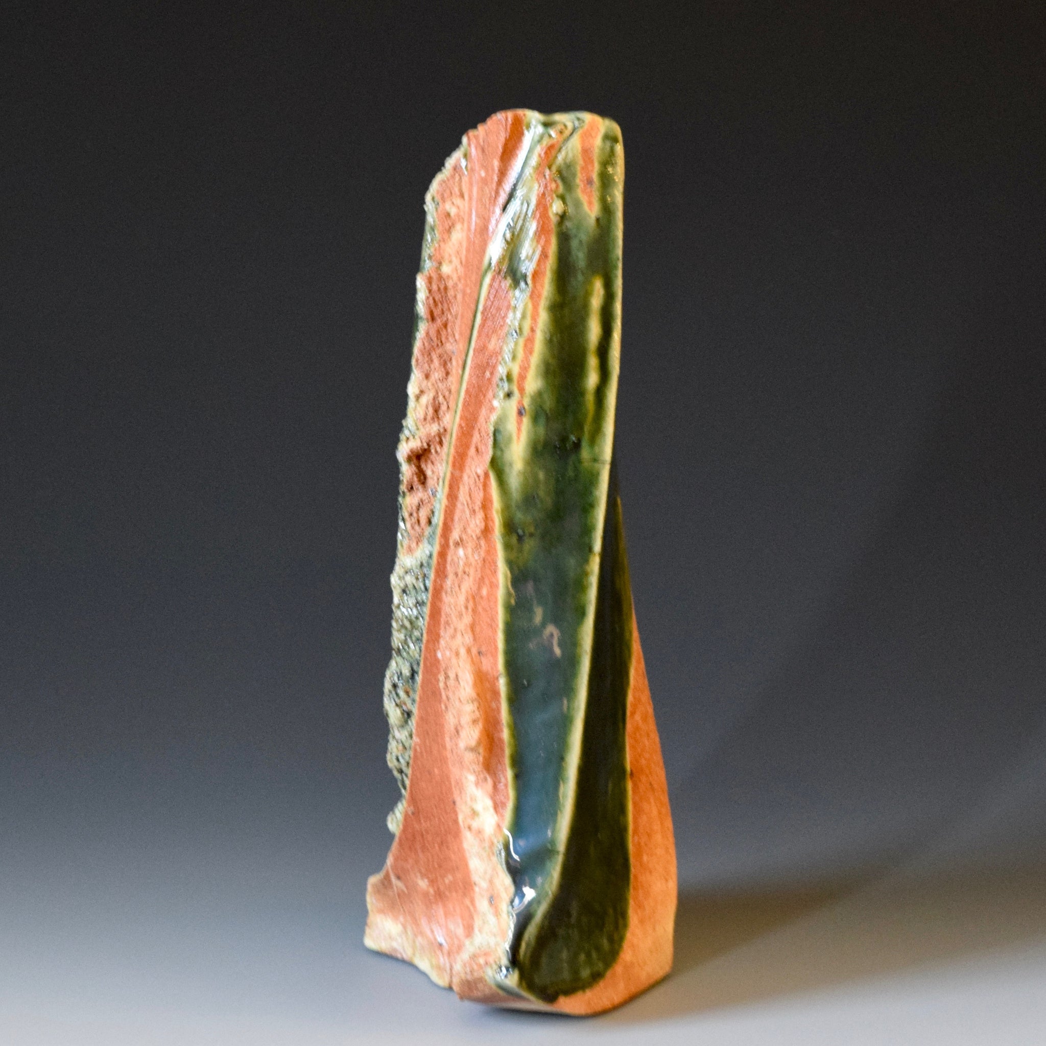 Sculpture/vase - Natural wood ash, Woodfired, Oribe glazeNatural wood ash: pottery surface is left unglazed and takes on color and markings during the firing from the melted wood ash5 x 5 x 13.5 incheswaterproofed